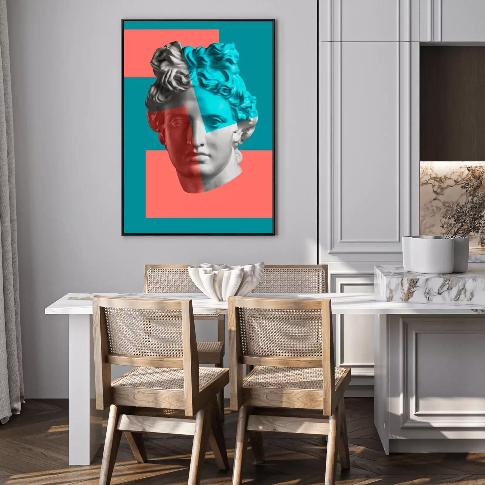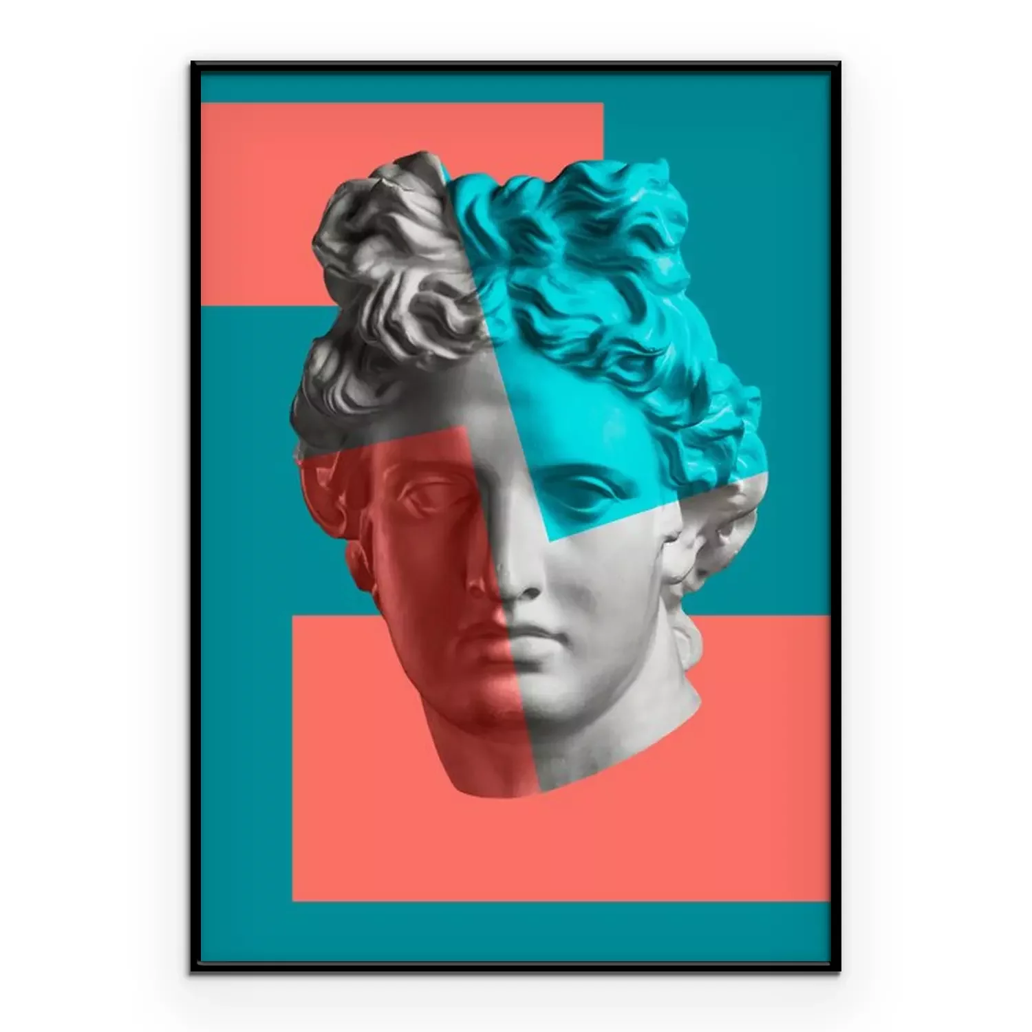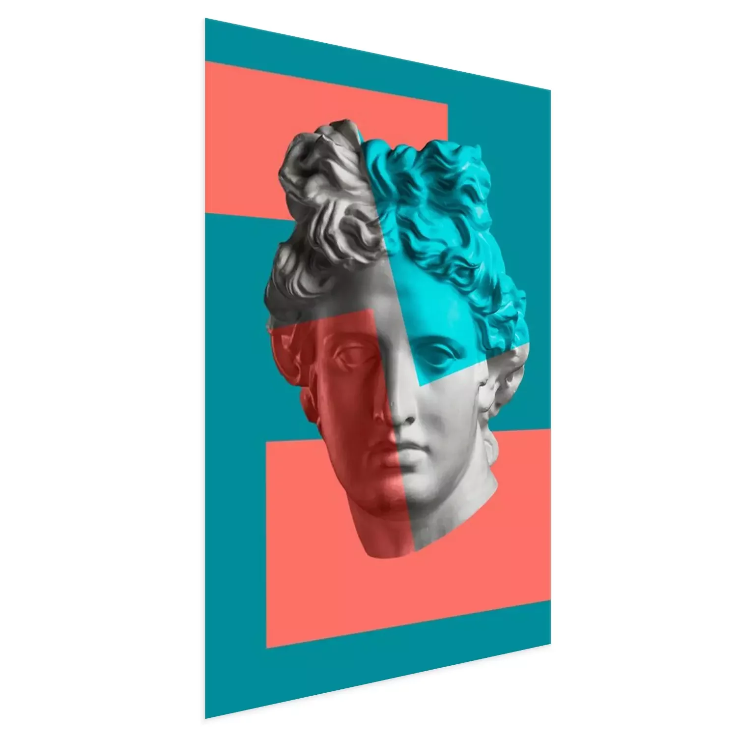 Poster: Contemporary art concept collage with antique statue head in a surreal style. Modern unusual art.