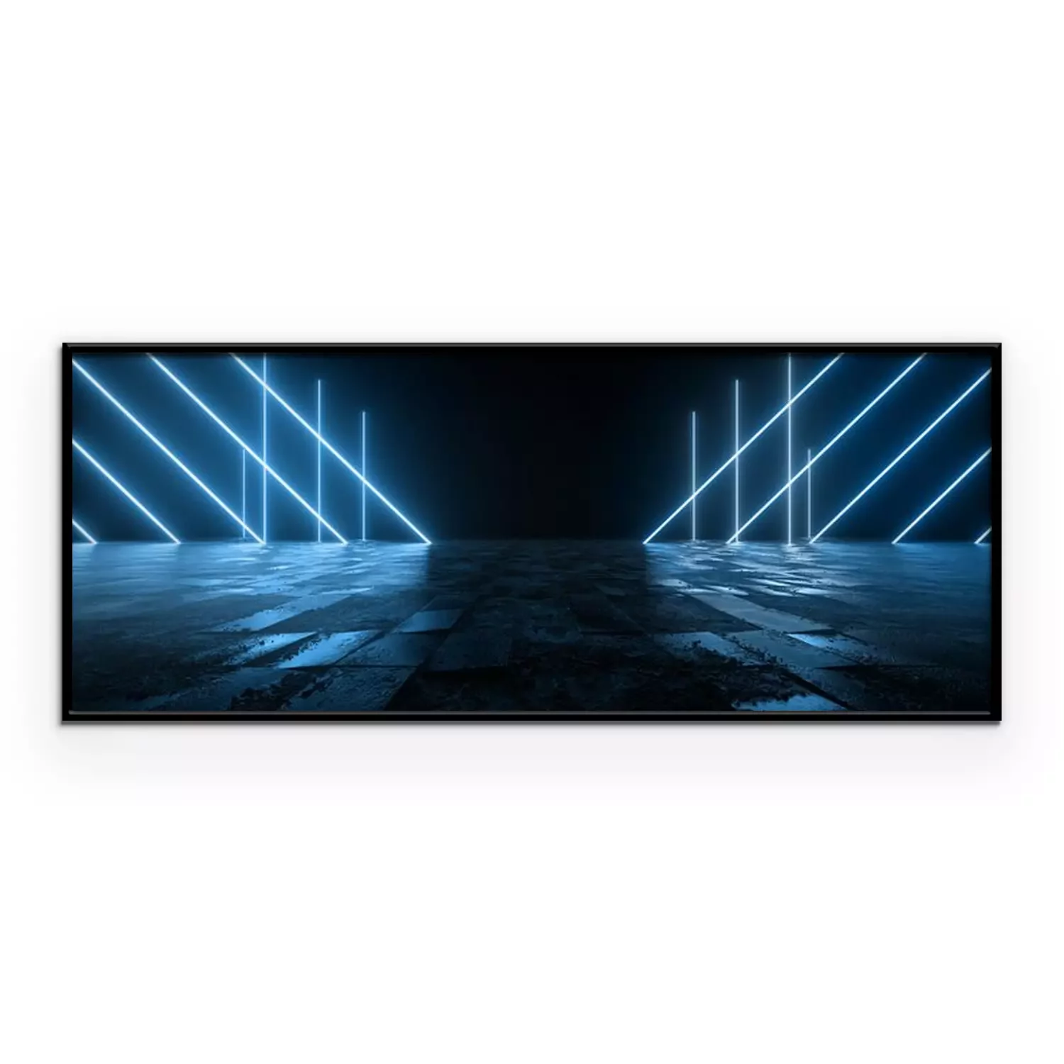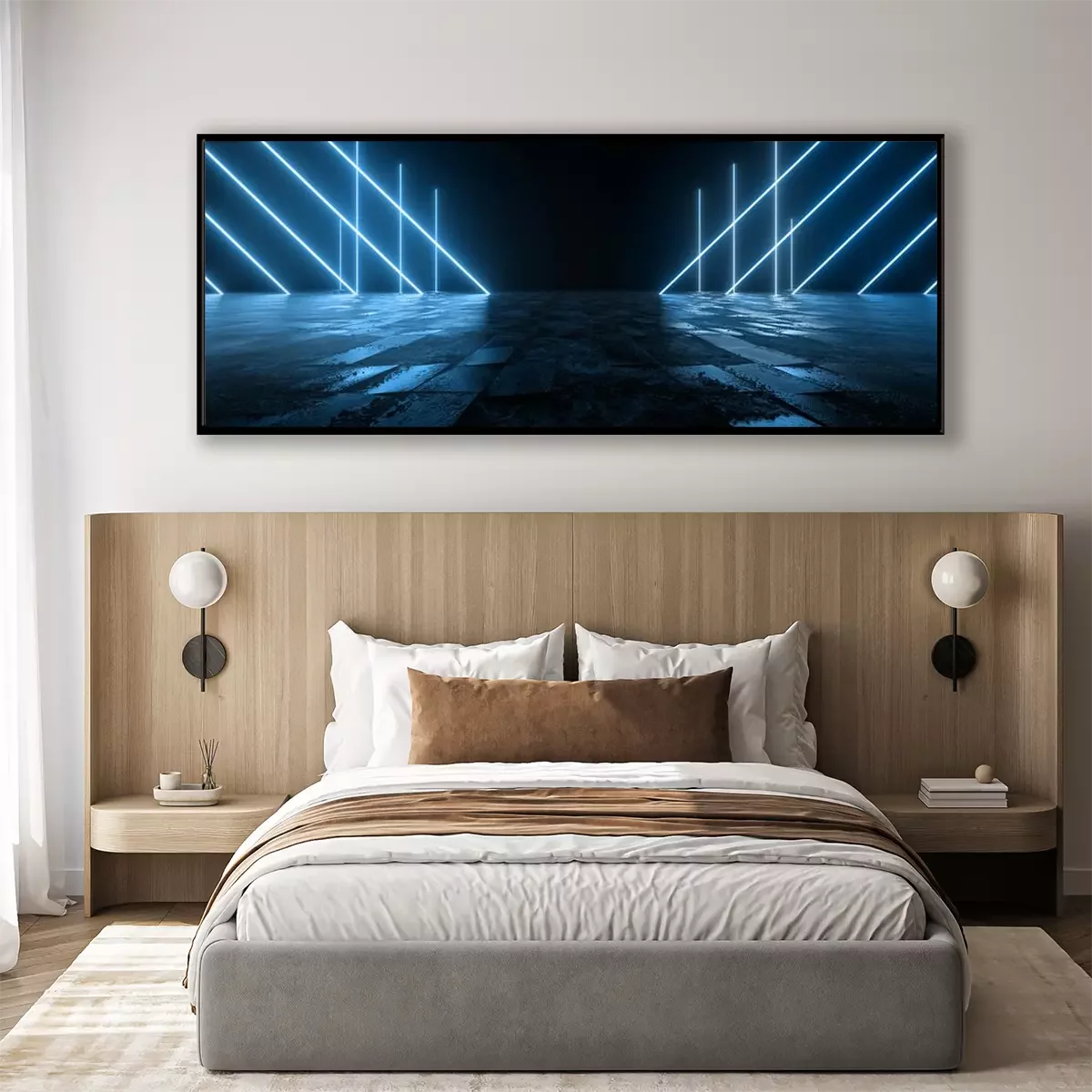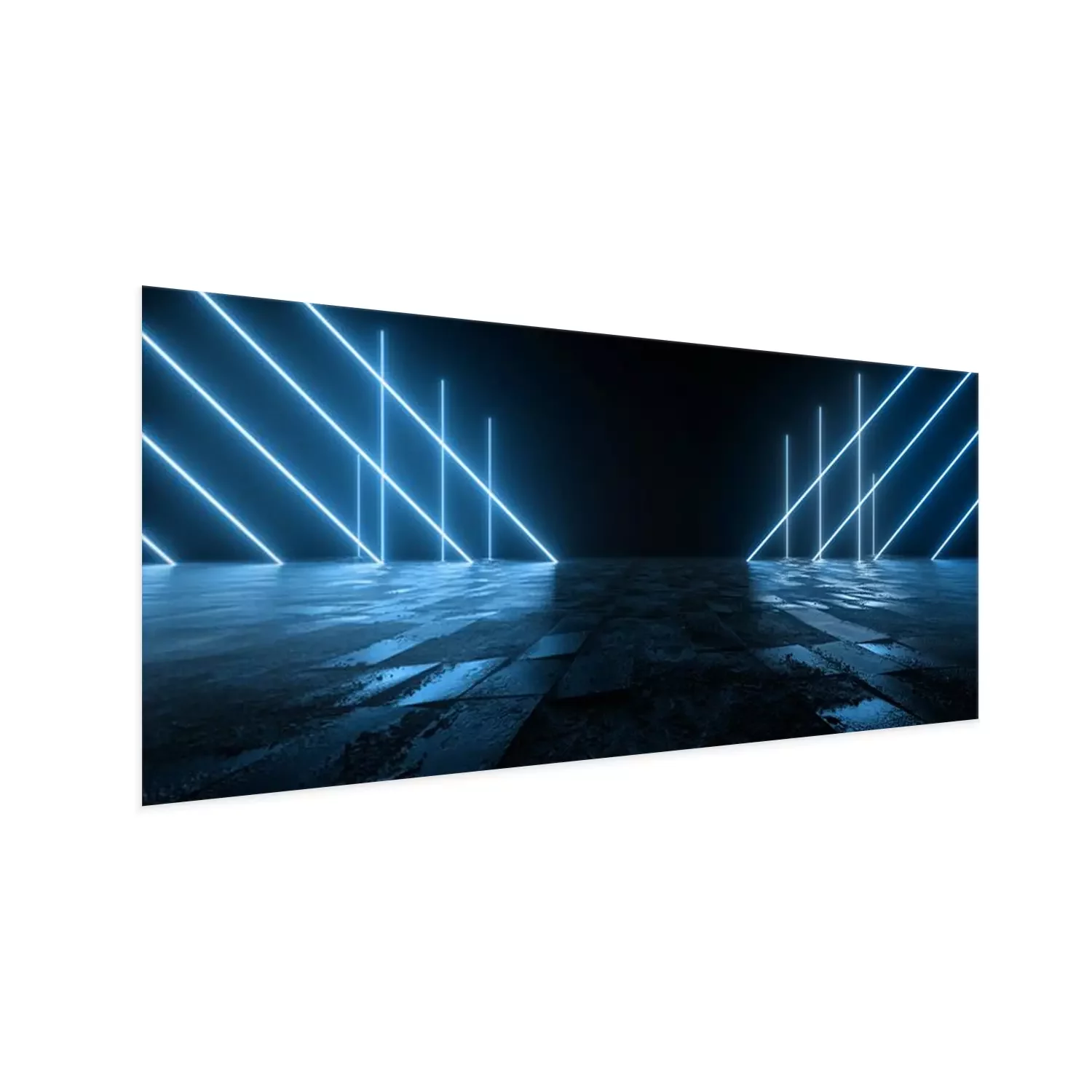 Poster: Cosmic Sci Fi Futuristic Pantone Blue Neon Modern Laser Grunge Rough Cement Tiled Concrete Floor Triangle Shaped Lights VIbrant Electric Cyber Virtual 3D Rendering