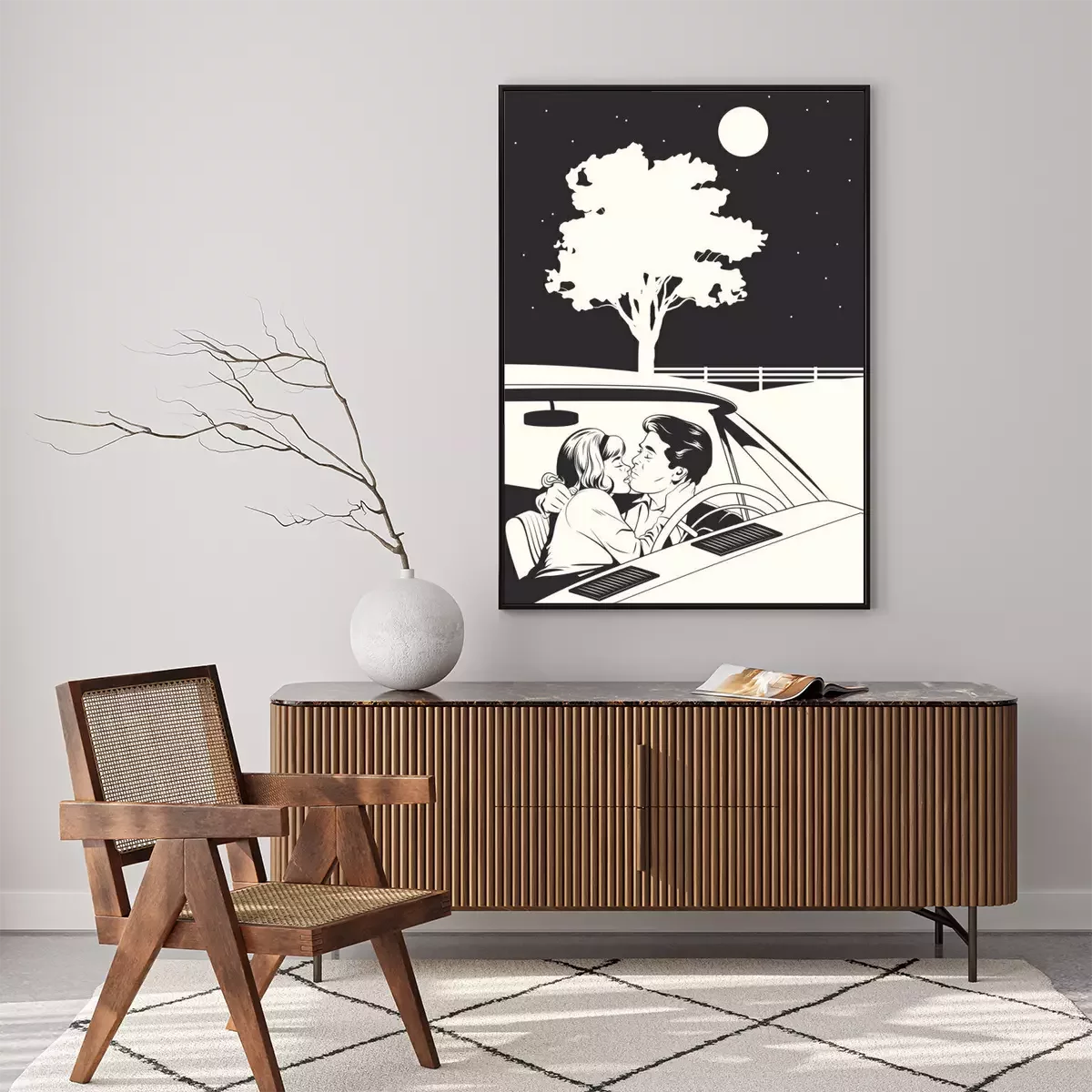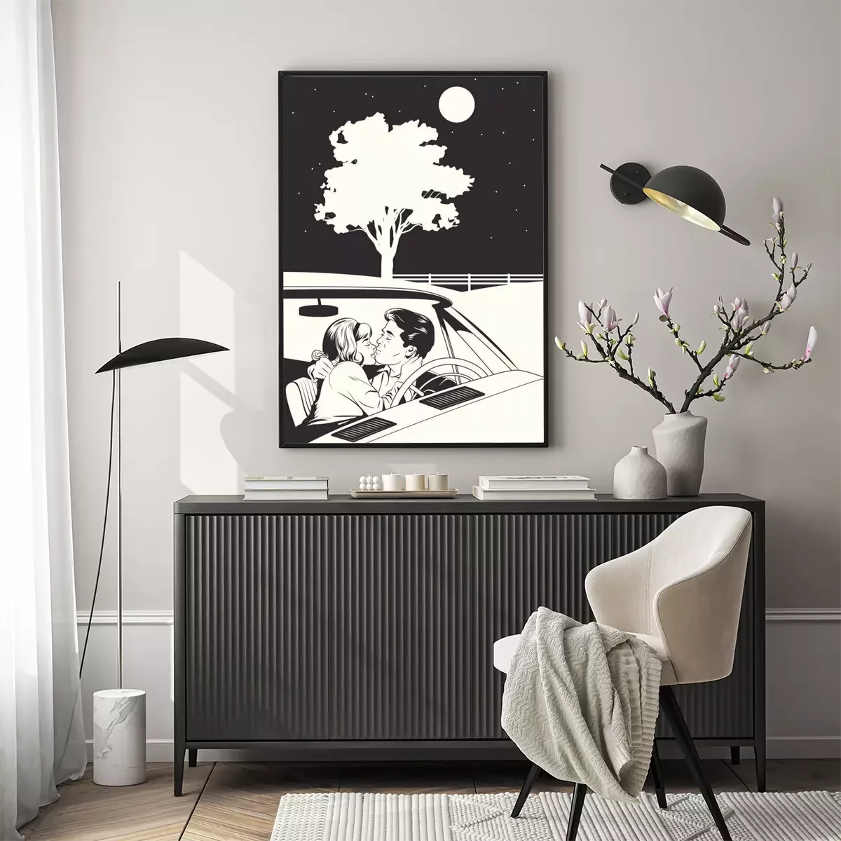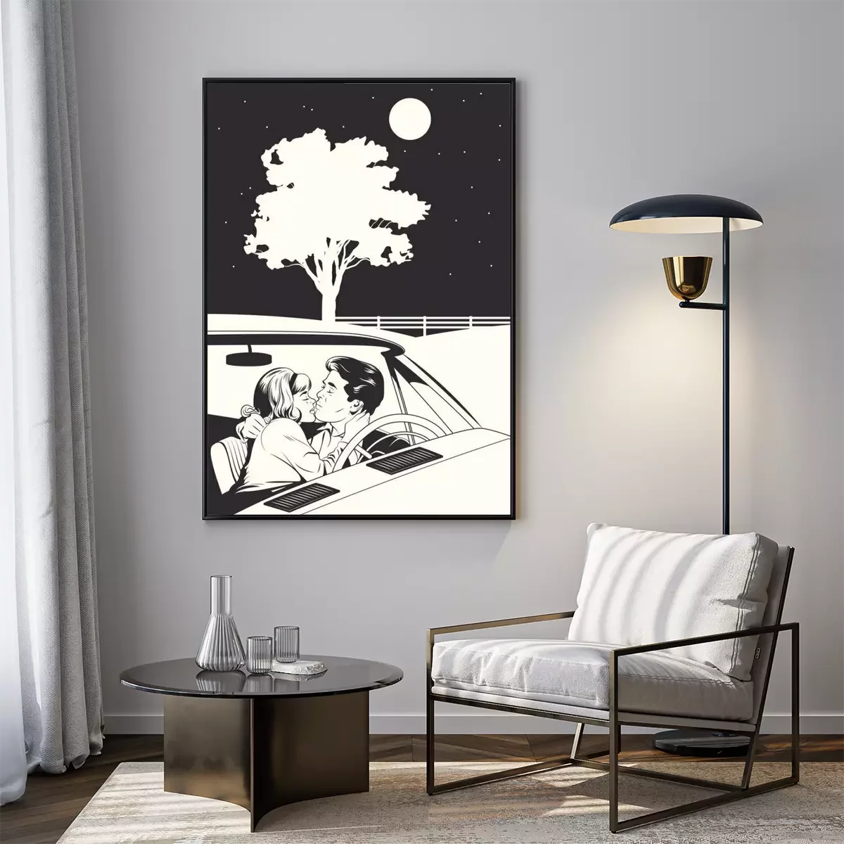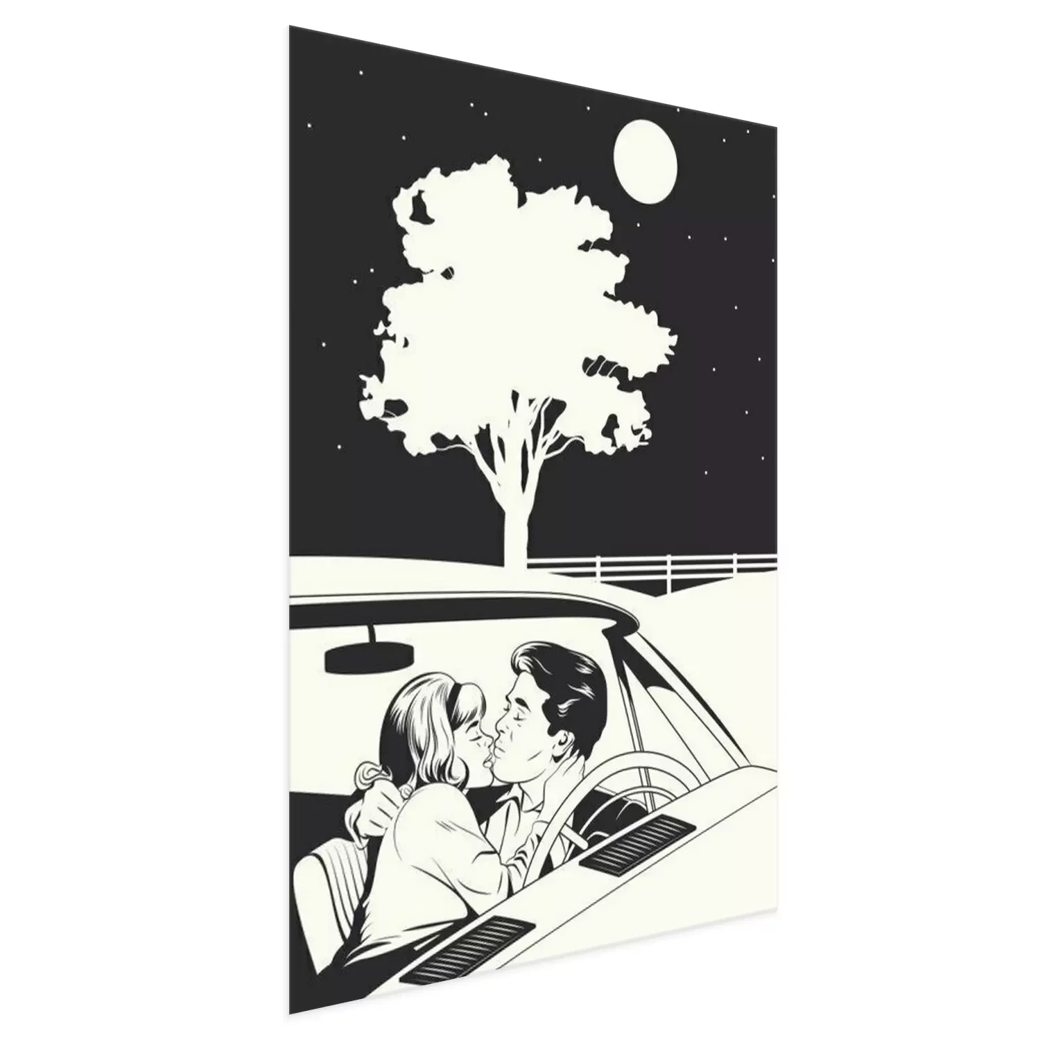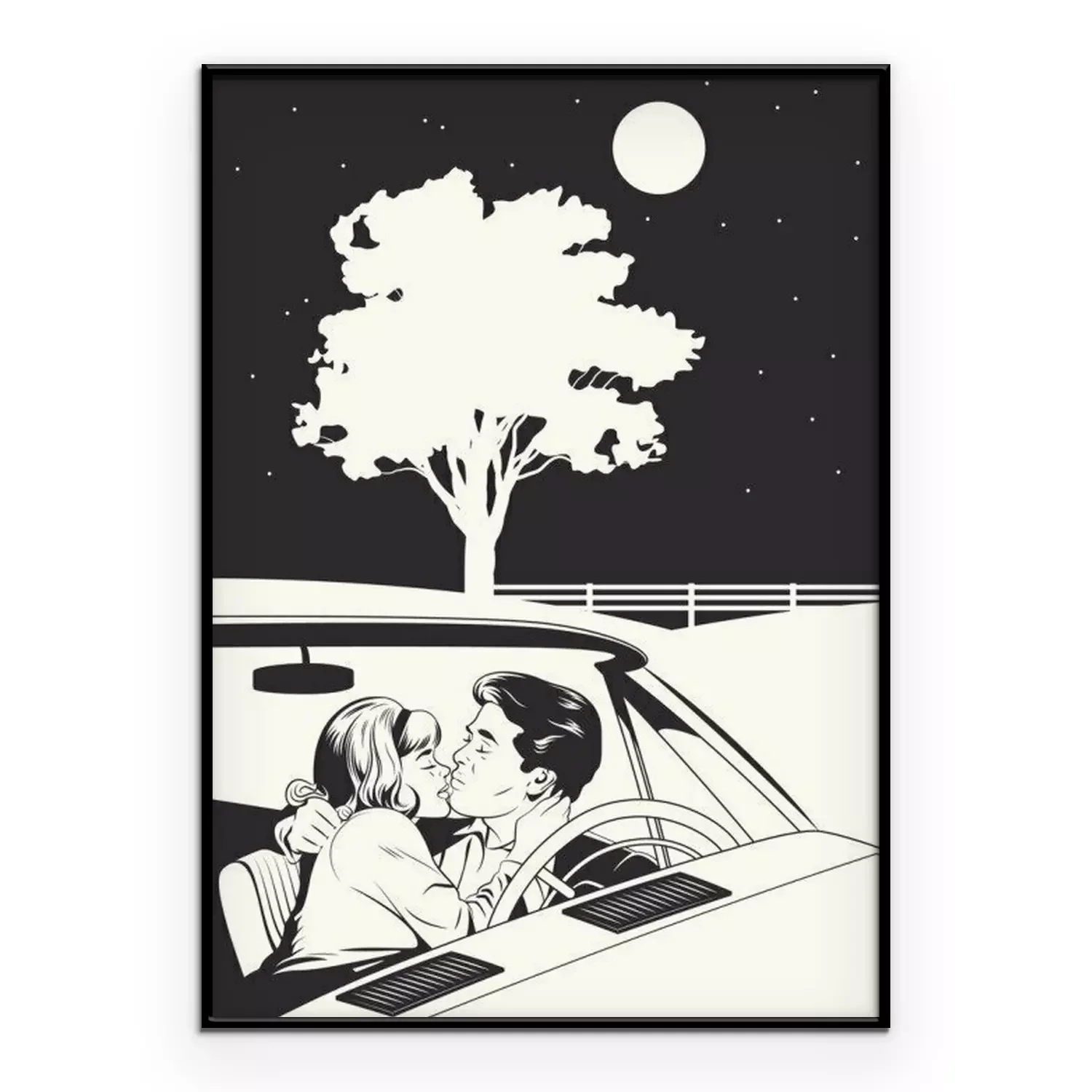 Poster: Couple in Love, Kissing in the Car, Night Scene, Black and White Comic Book Illustration Drawing Style