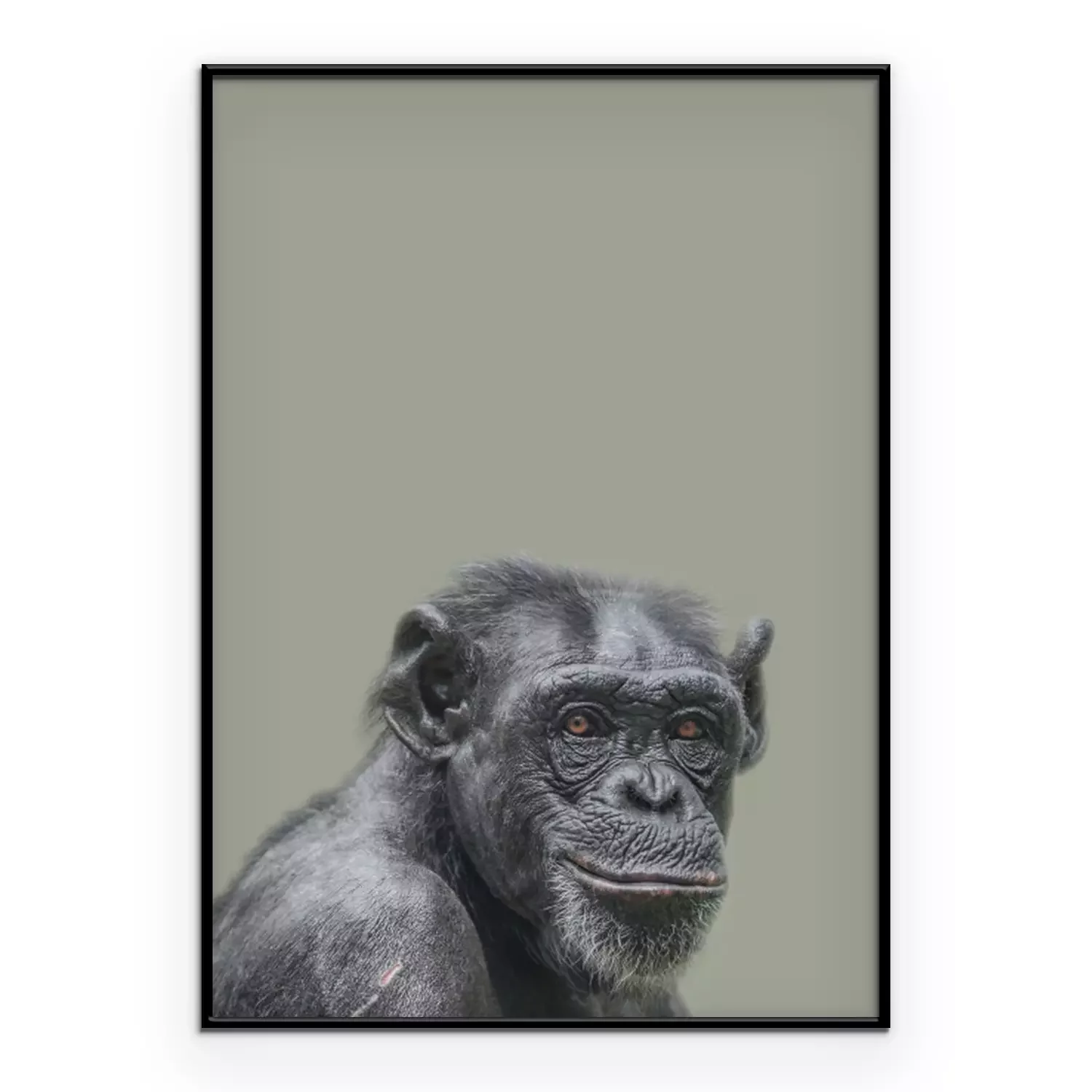 Poster: Cover page with a portrait of a happy adult Chimpanzee, smiling and thinking, closeup, details with copy space and solid background. Concept biodiversity and wildlife conservation.