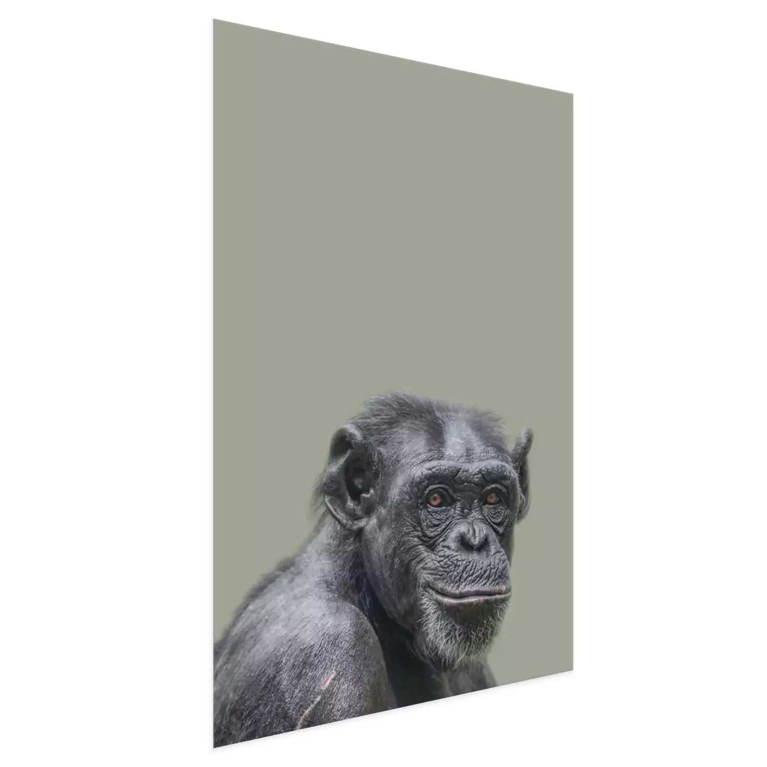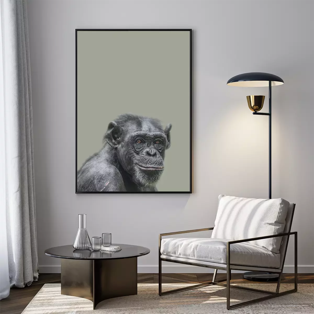 Poster Cover page with a portrait of a happy adult Chimpanzee, smiling and thinking, closeup, details with copy space and solid background. Concept biodiversity and wildlife conservation.
