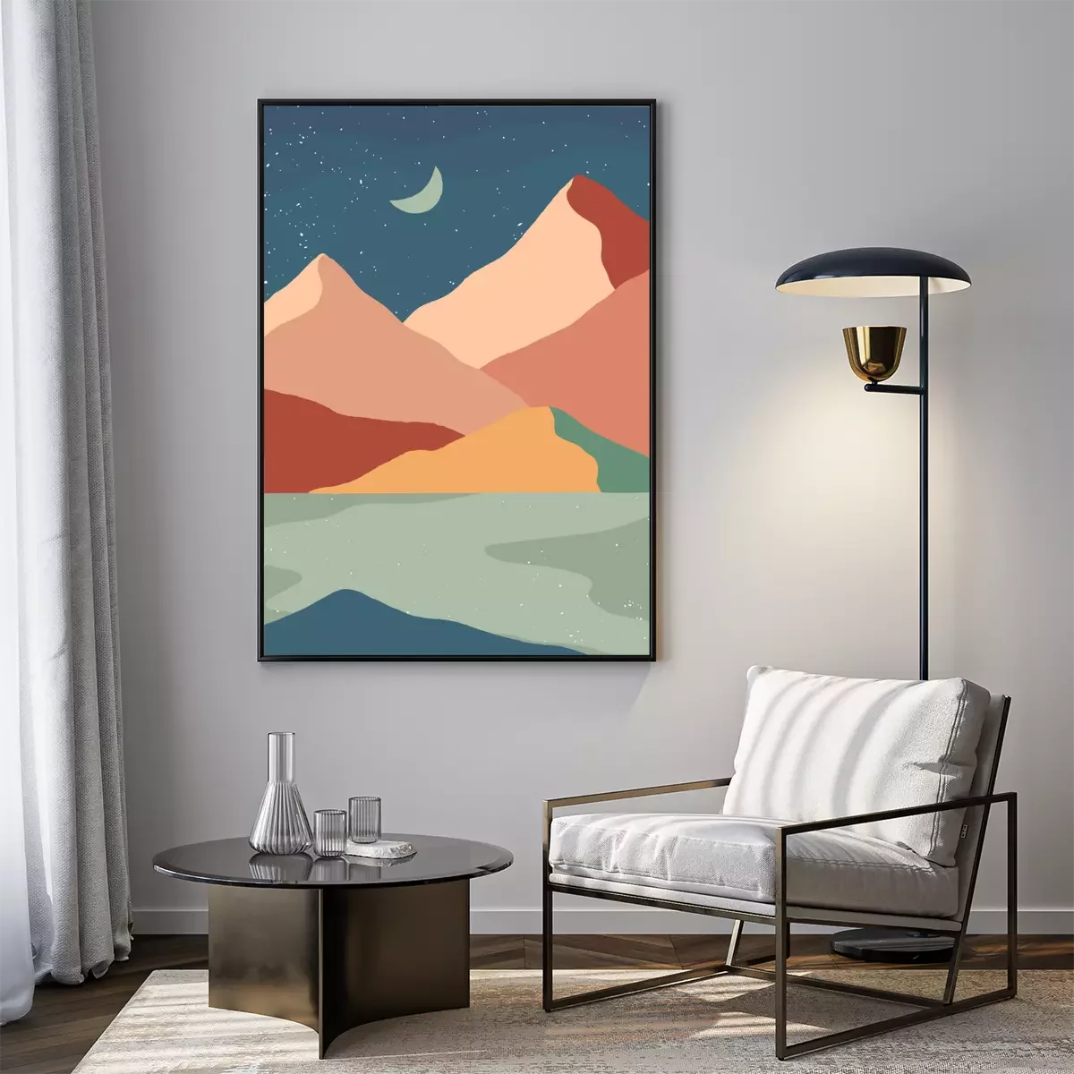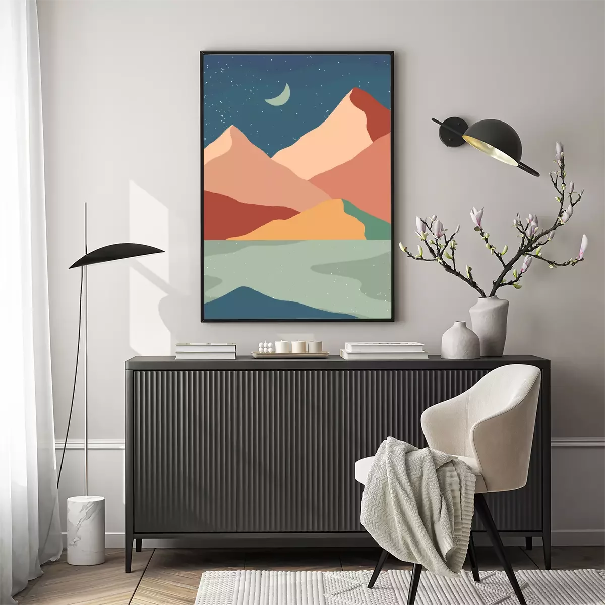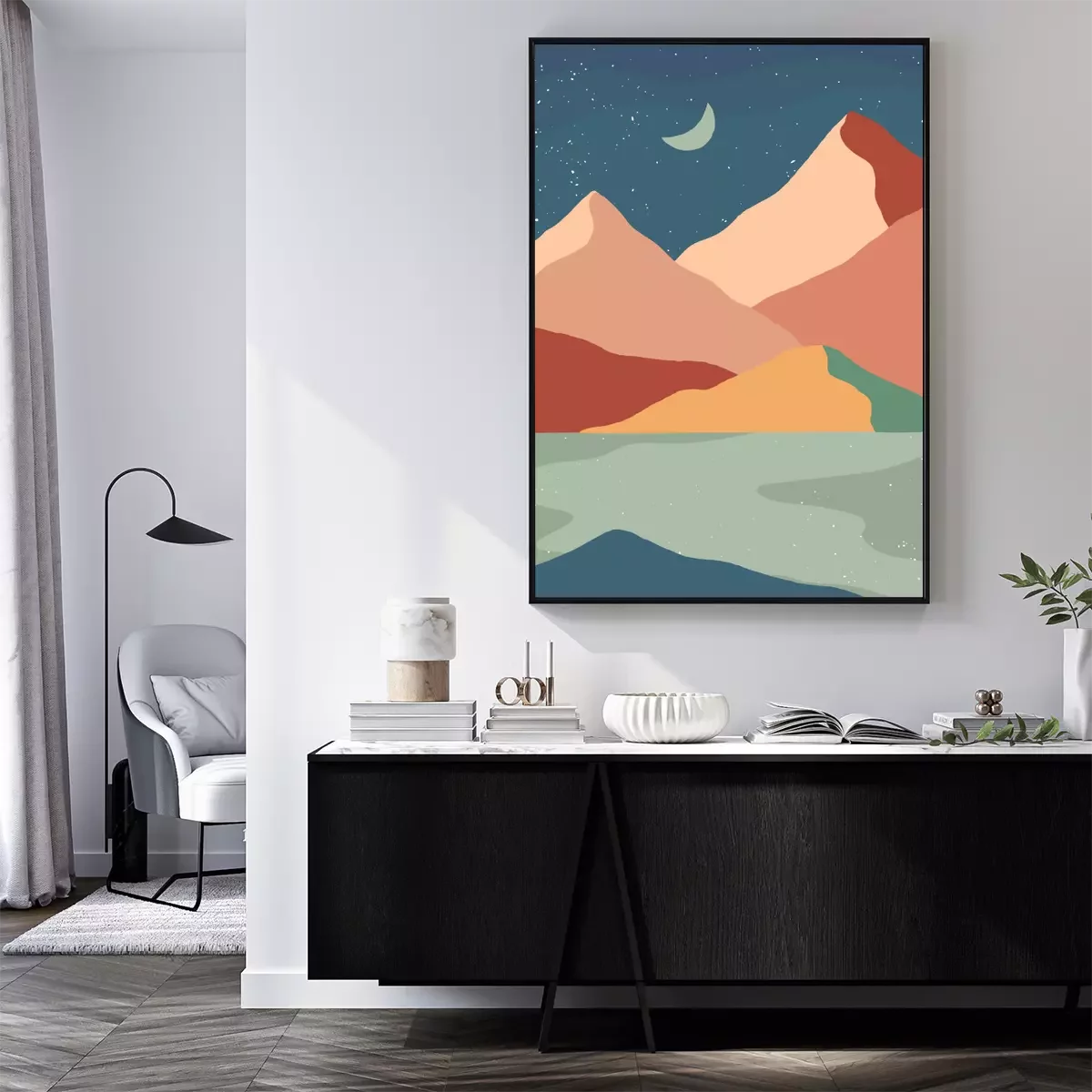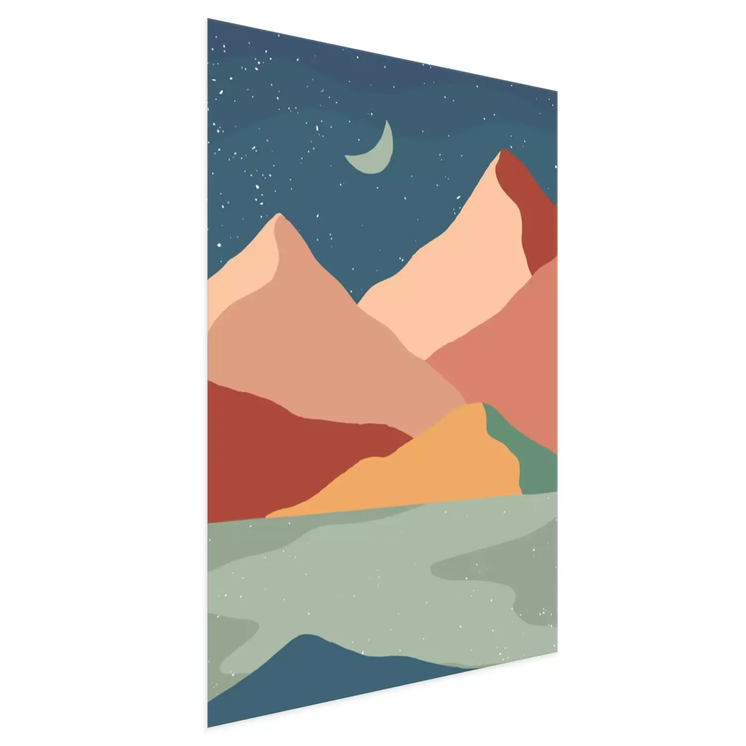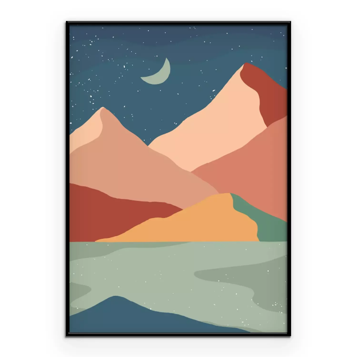Poster: Creative abstract mountain landscape background.Mid century modern vector illustration with hand drawn mountains; sea or river; sky and moon.Trendy contemporary design.Futuristic wall art decor.