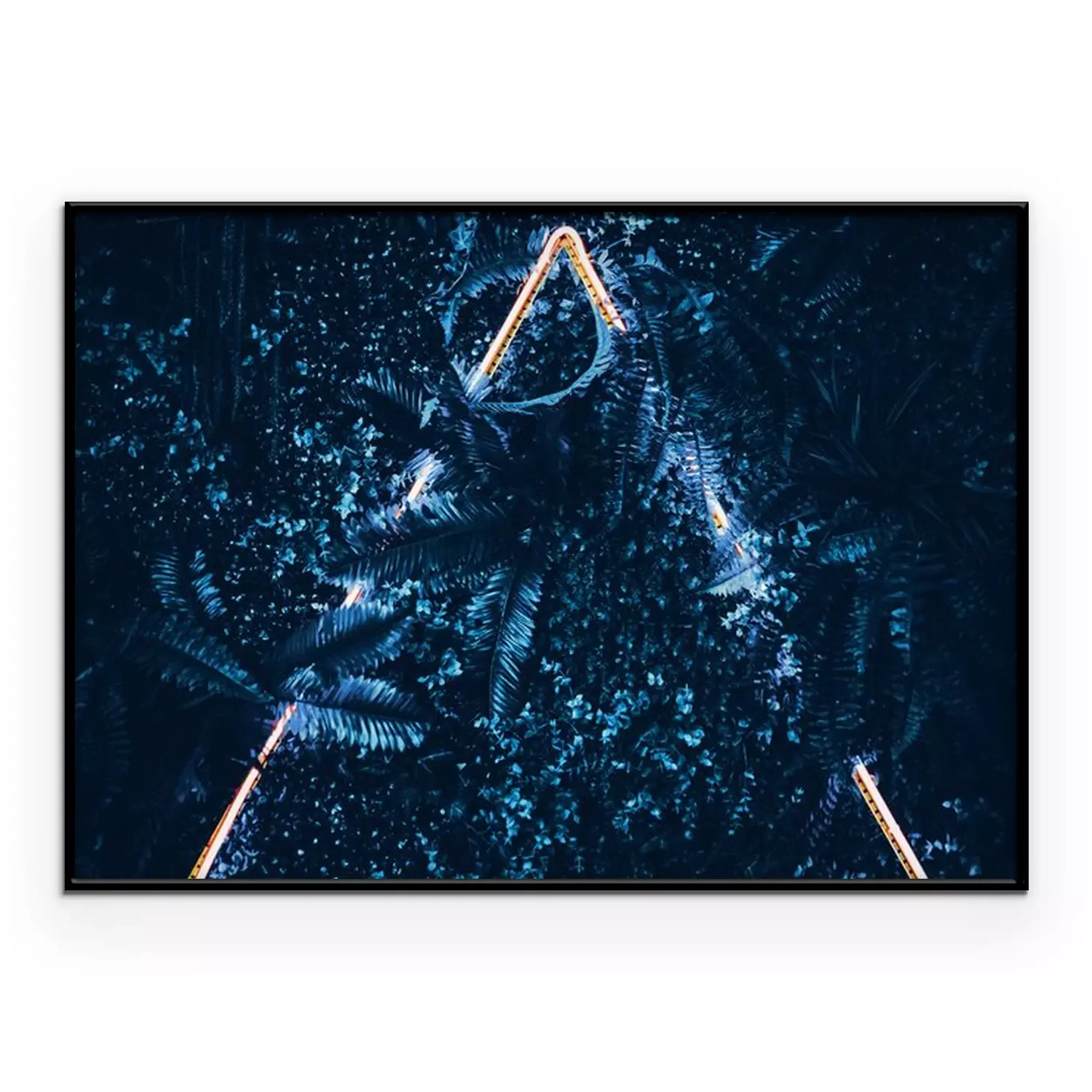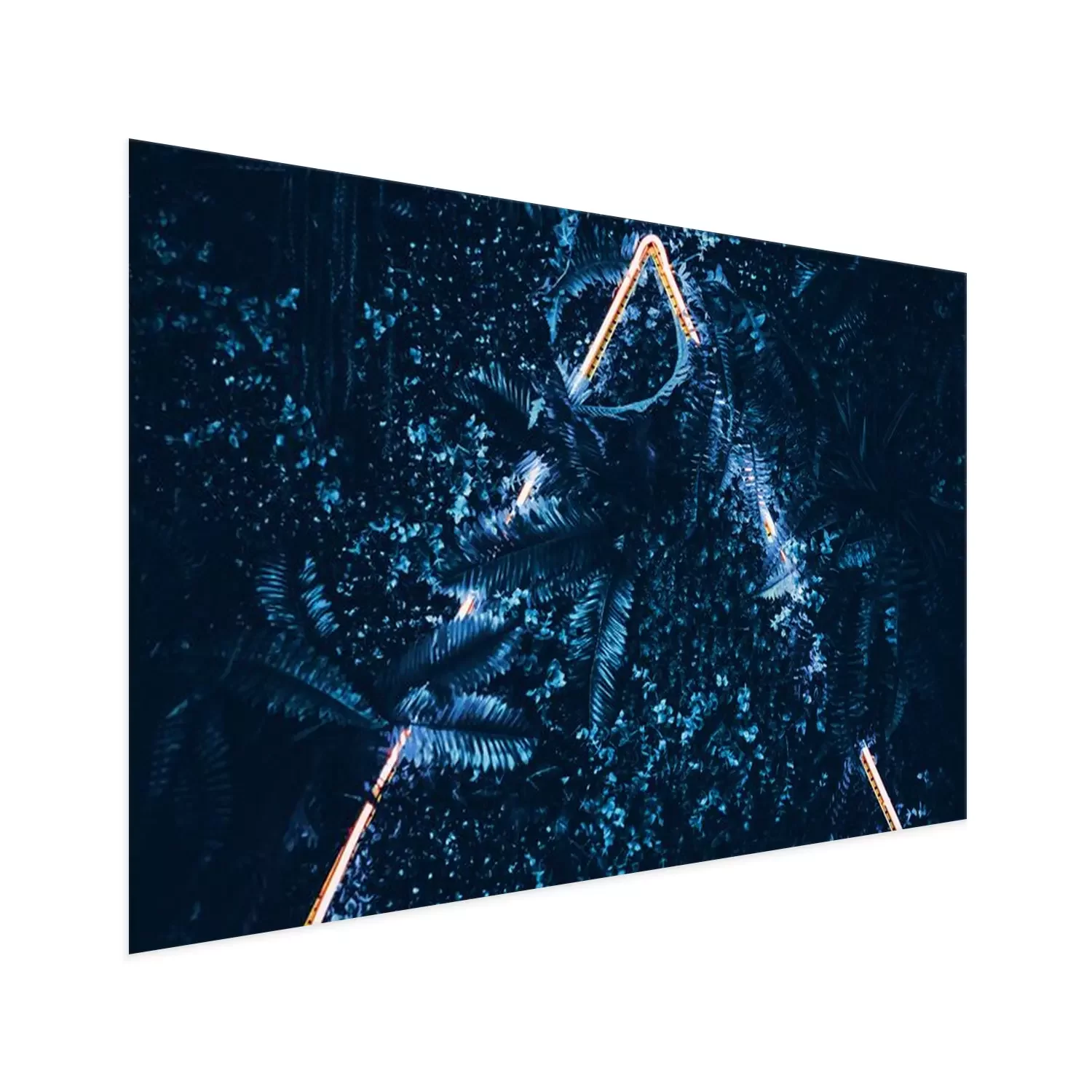 Poster: Creative fluorescent color layout made of blue tropical leaves with neon light triangle .