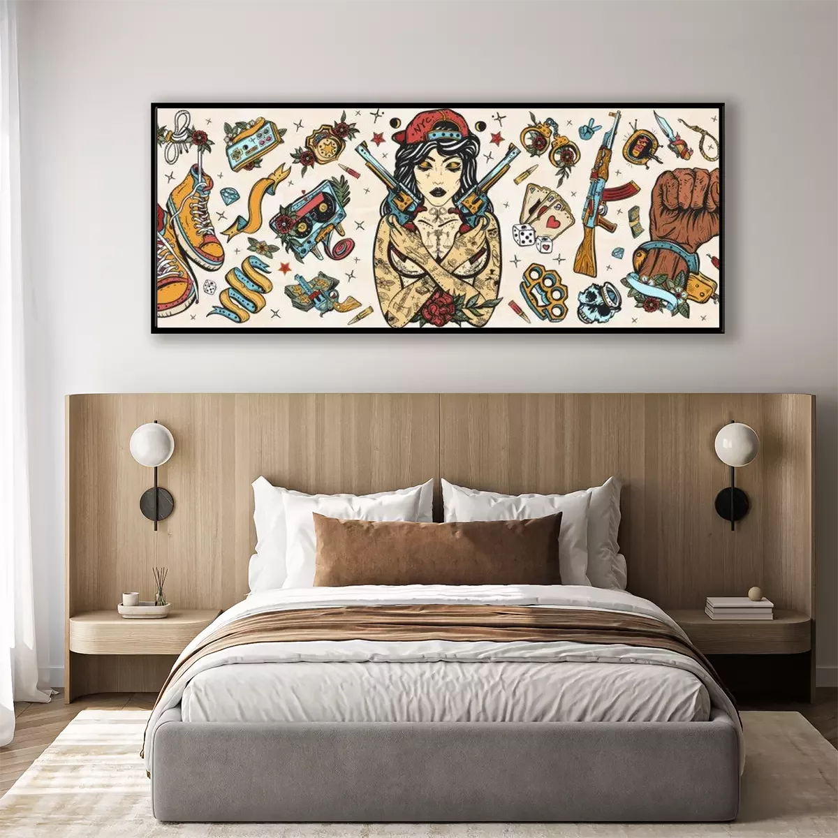 Bad girl, crossed guns, wings and mayan sun. Criminal street culture art. Favela style. Swag. Hip-hop and rap lifestyle. Cool gangster tattooed woman in baseball cap