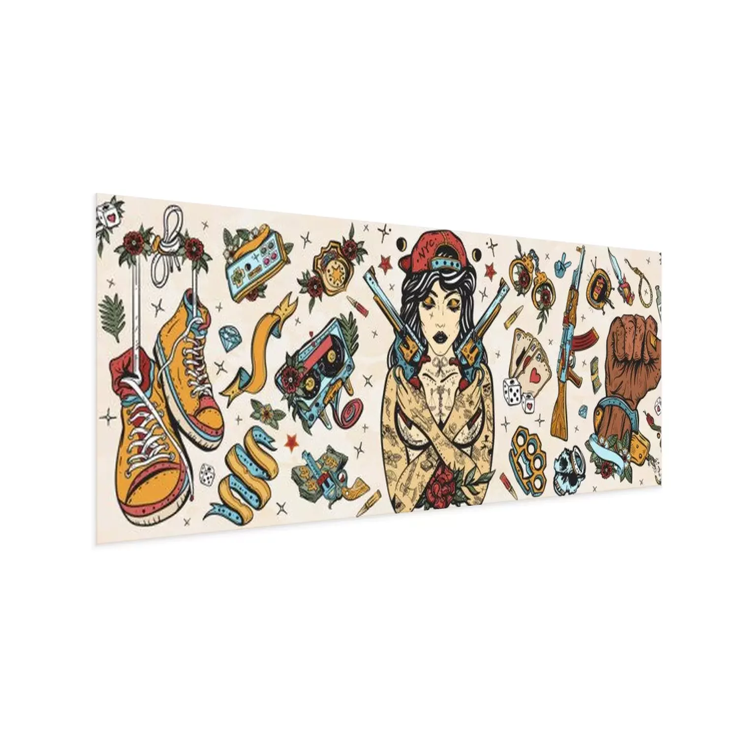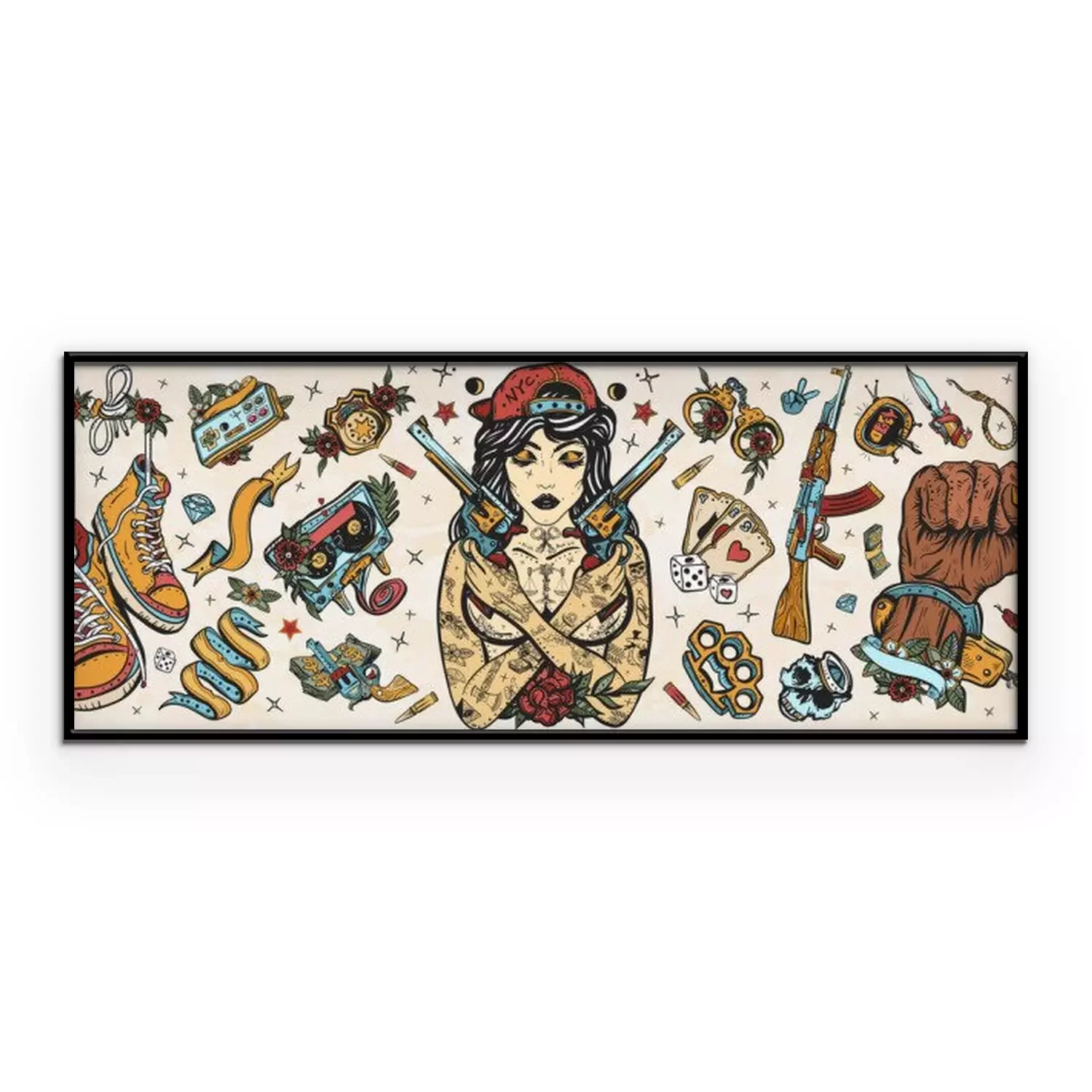 Poster Criminal street culture. Old school tattoo vector collection. Bad girl and crossed guns, handcuffs, audio cassette. Swag. Hip-hop lifestyle. Cool gangster tattooed woman in baseball cap. Crime favela
