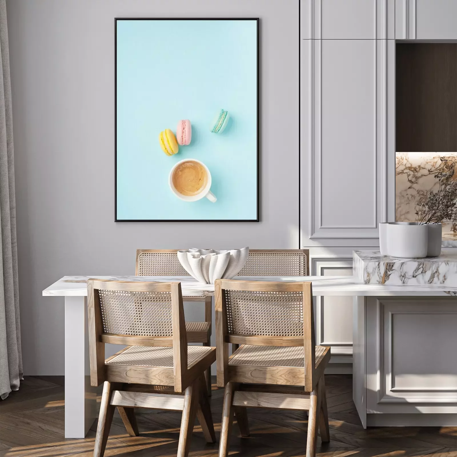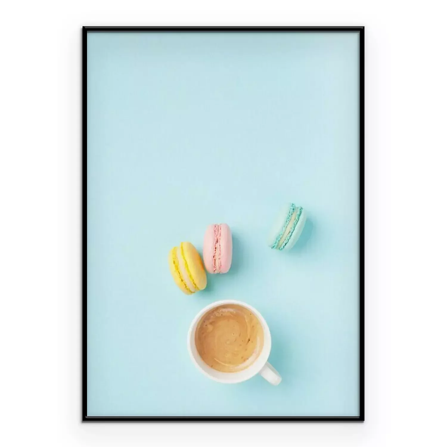 Poster: Cup of coffee and colorful macaron on pastel blue background top view. Cozy morning breakfast. Fashion flat lay style. Sweet macaroons.