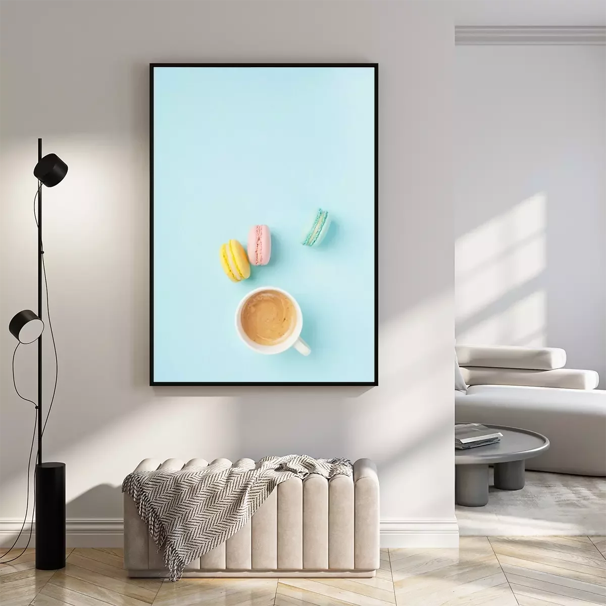 Poster Cup of coffee and colorful macaron on pastel blue background top view. Cozy morning breakfast. Fashion flat lay style. Sweet macaroons.