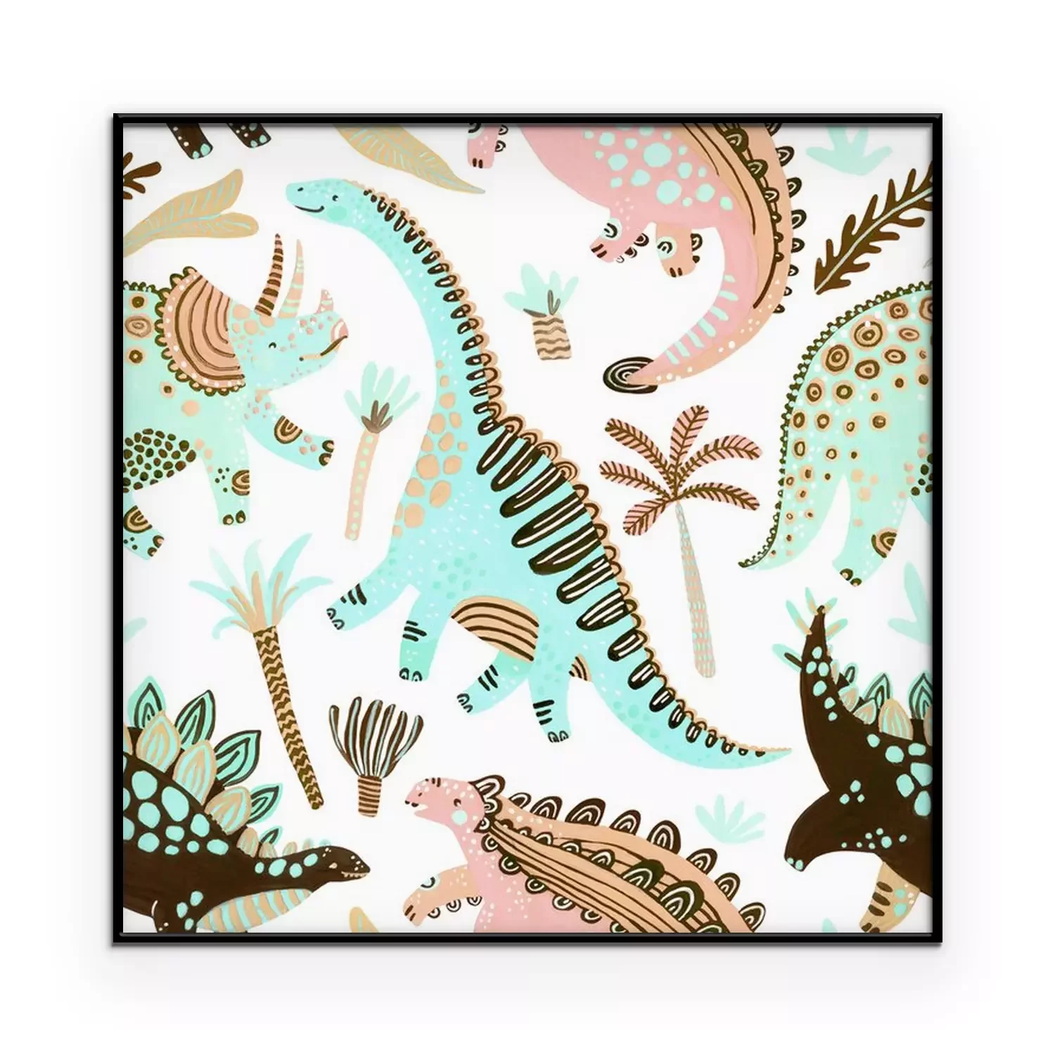 Poster: Cute cartoon dinosaurs seamless pattern in scandinavian style