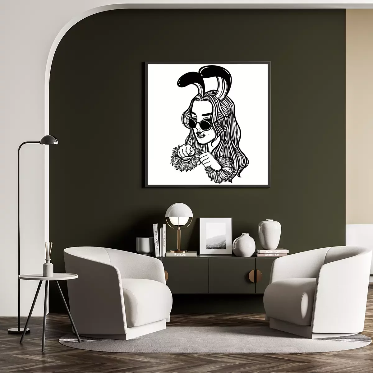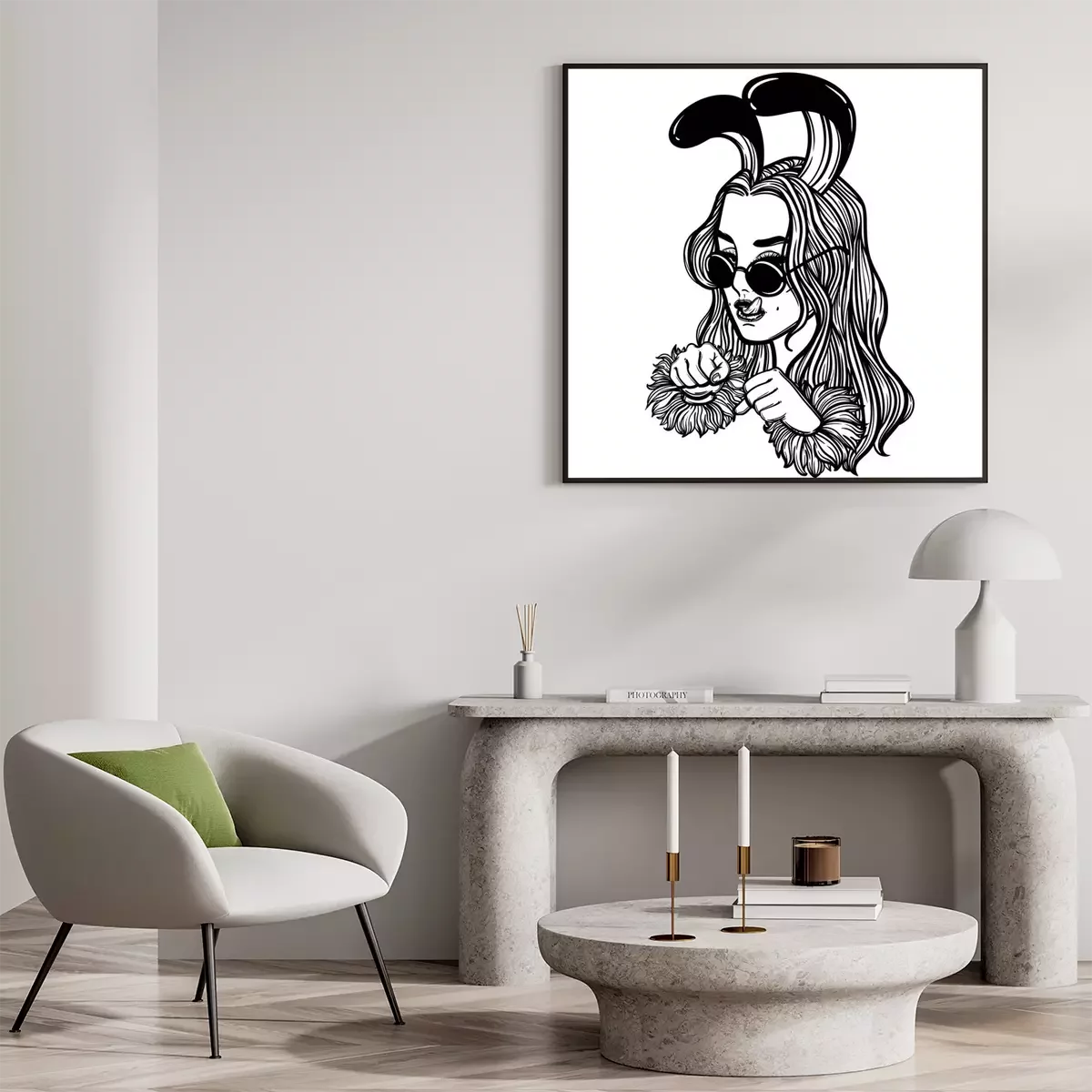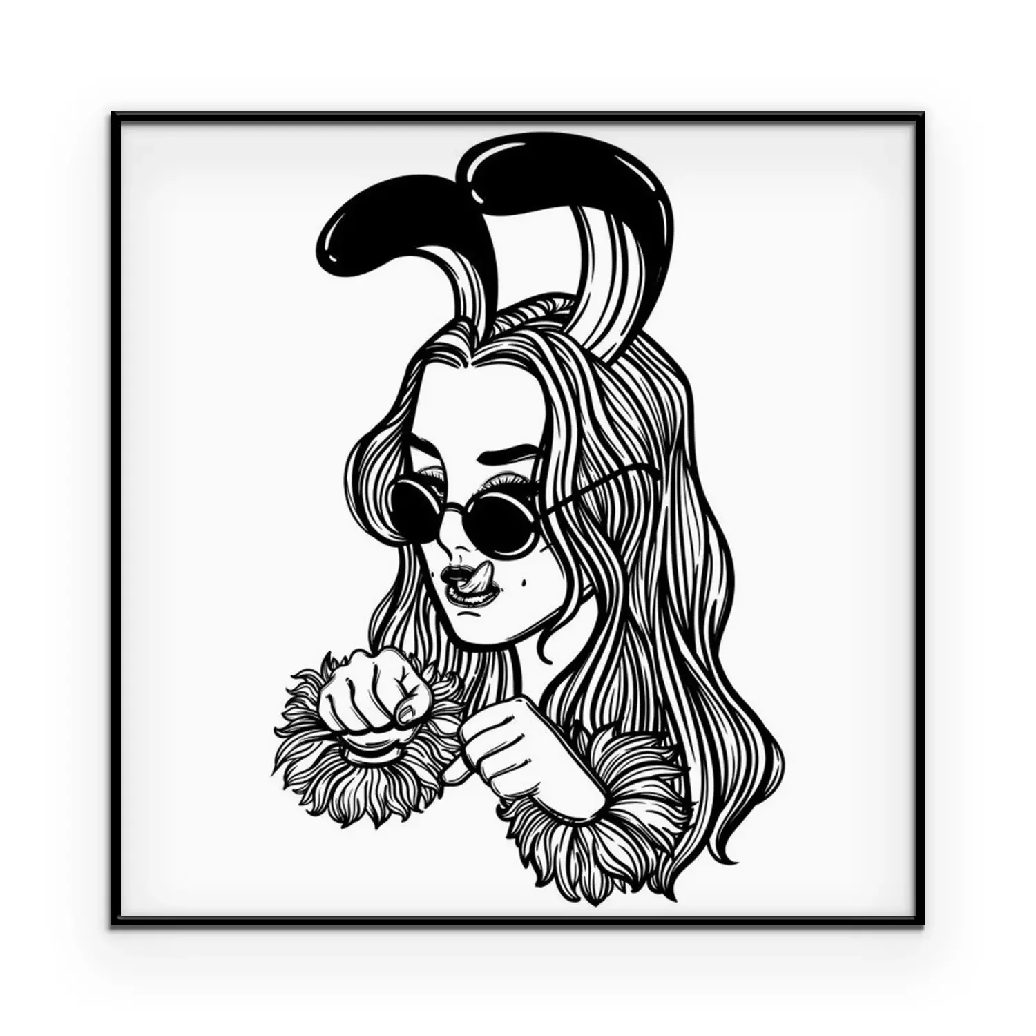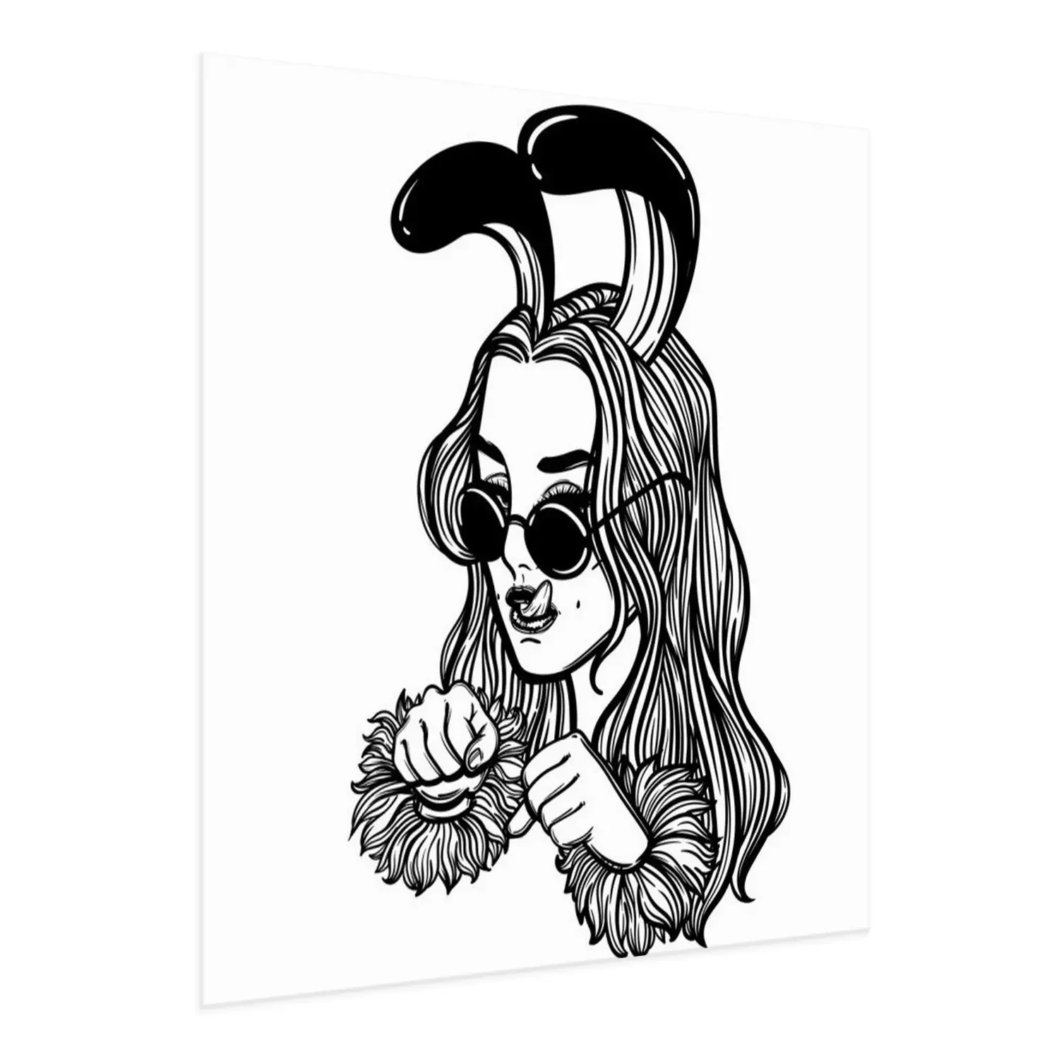 Poster: cute vector art card with bunny girl. Fashion woman. Rabbit woman. linear tattoo print illustration.