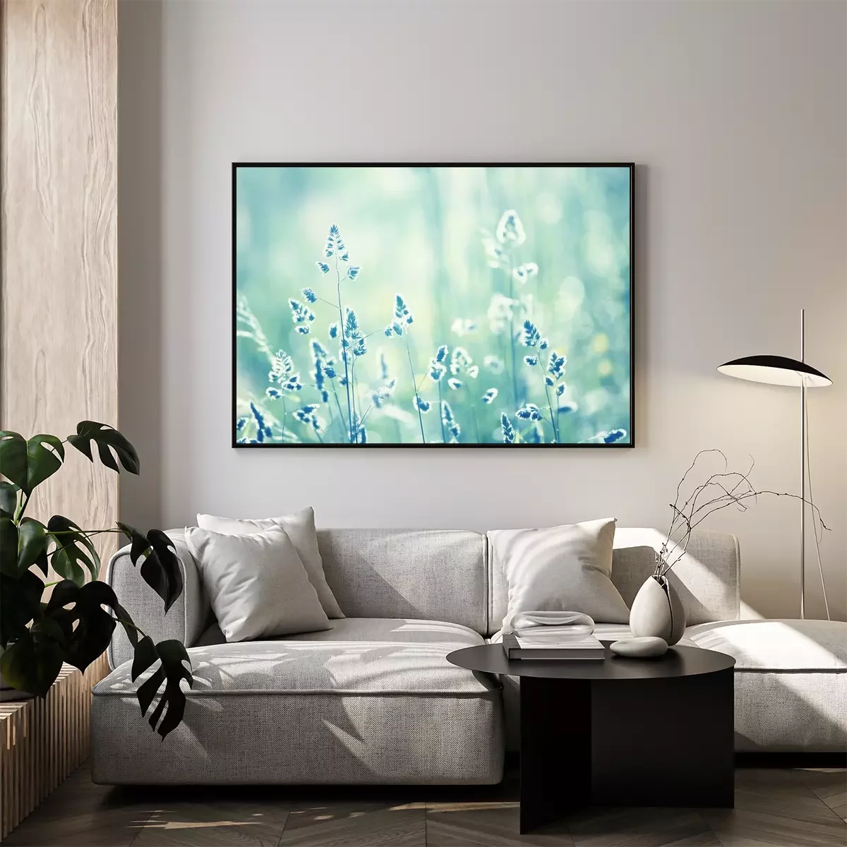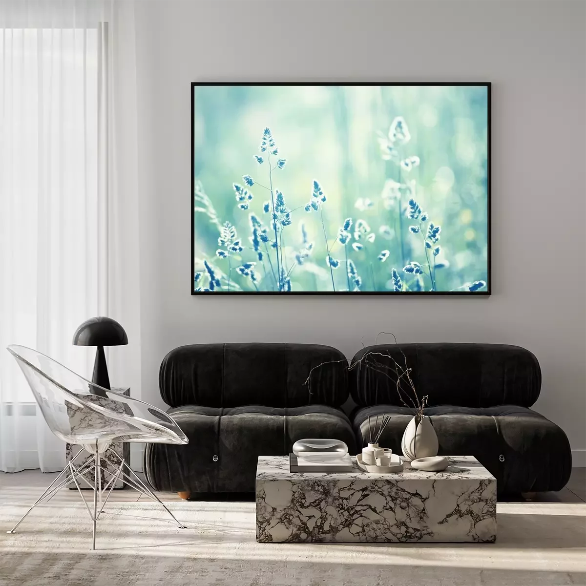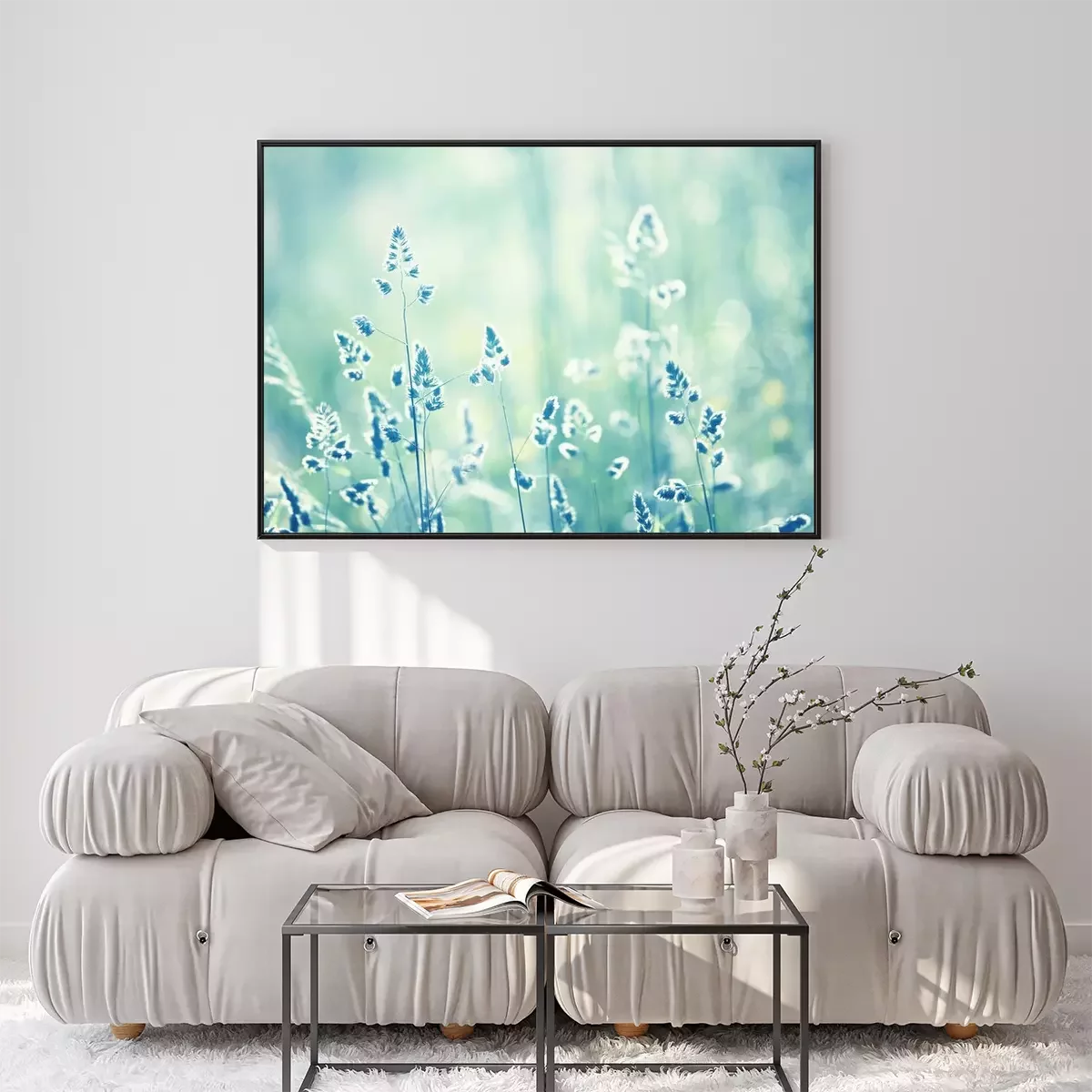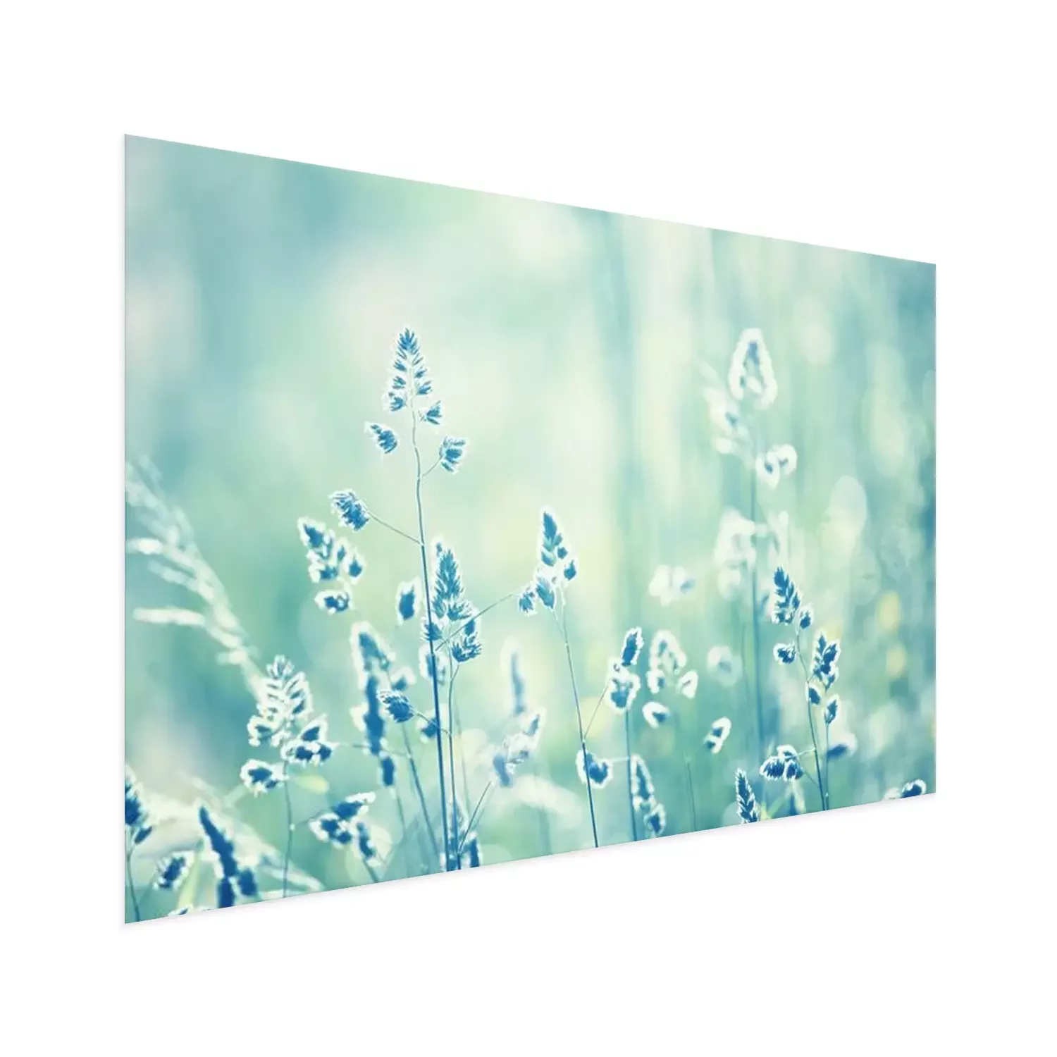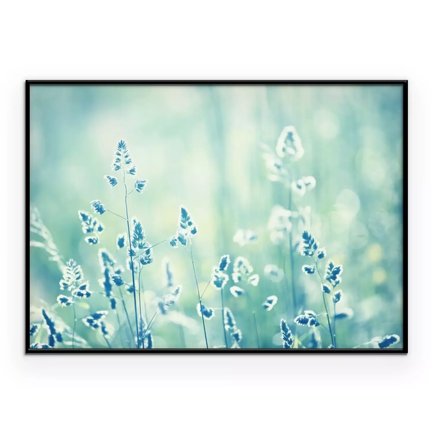 Poster: Cyaan blauwe kleur wazig weide detail achtergrond bij zonsondergang licht. Selectieve aandacht gebruikt.