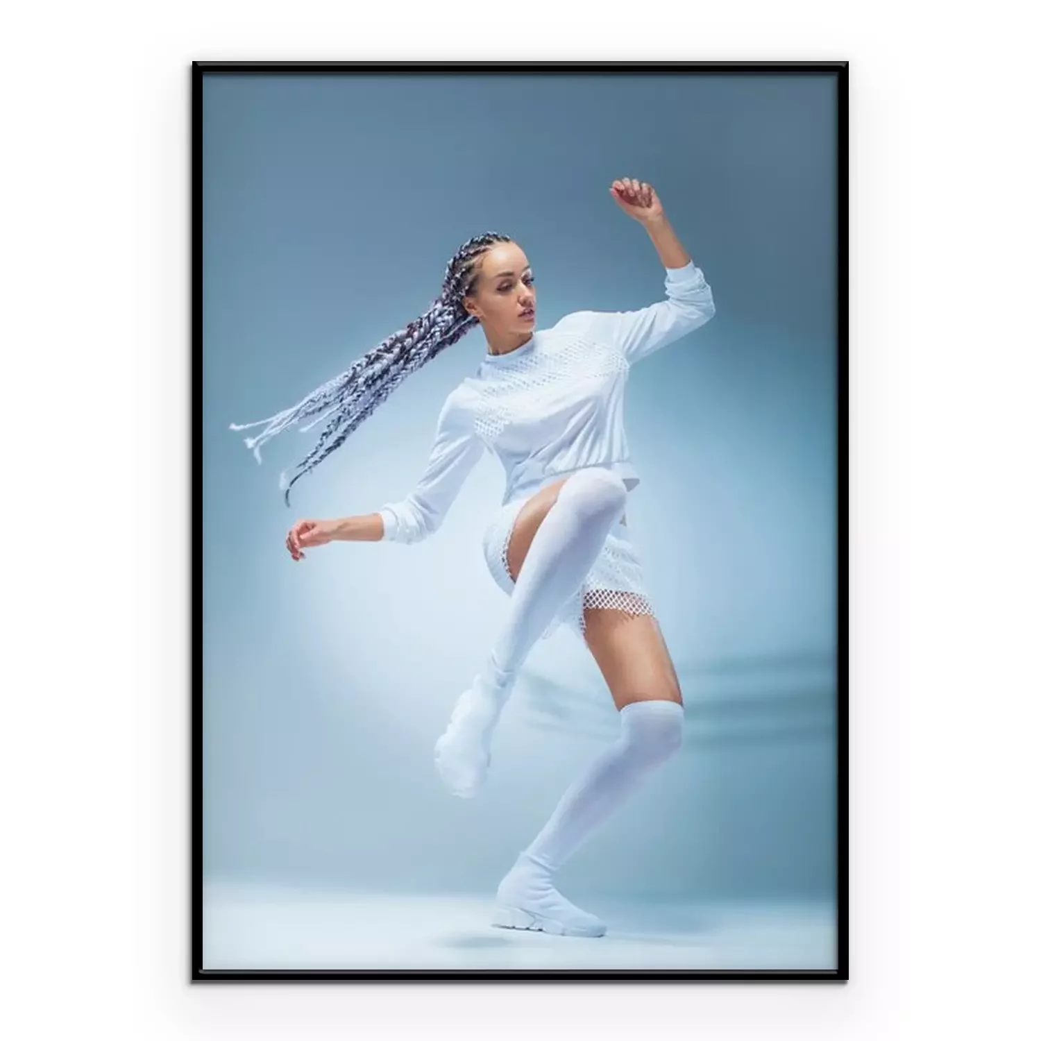 Poster: De aantrekkelijke opgewekte danser van het geschiktheidsmeisje in sportwear dans die over blauwe achtergrond wordt geïsoleerd. Mode- en livestyle-concept.