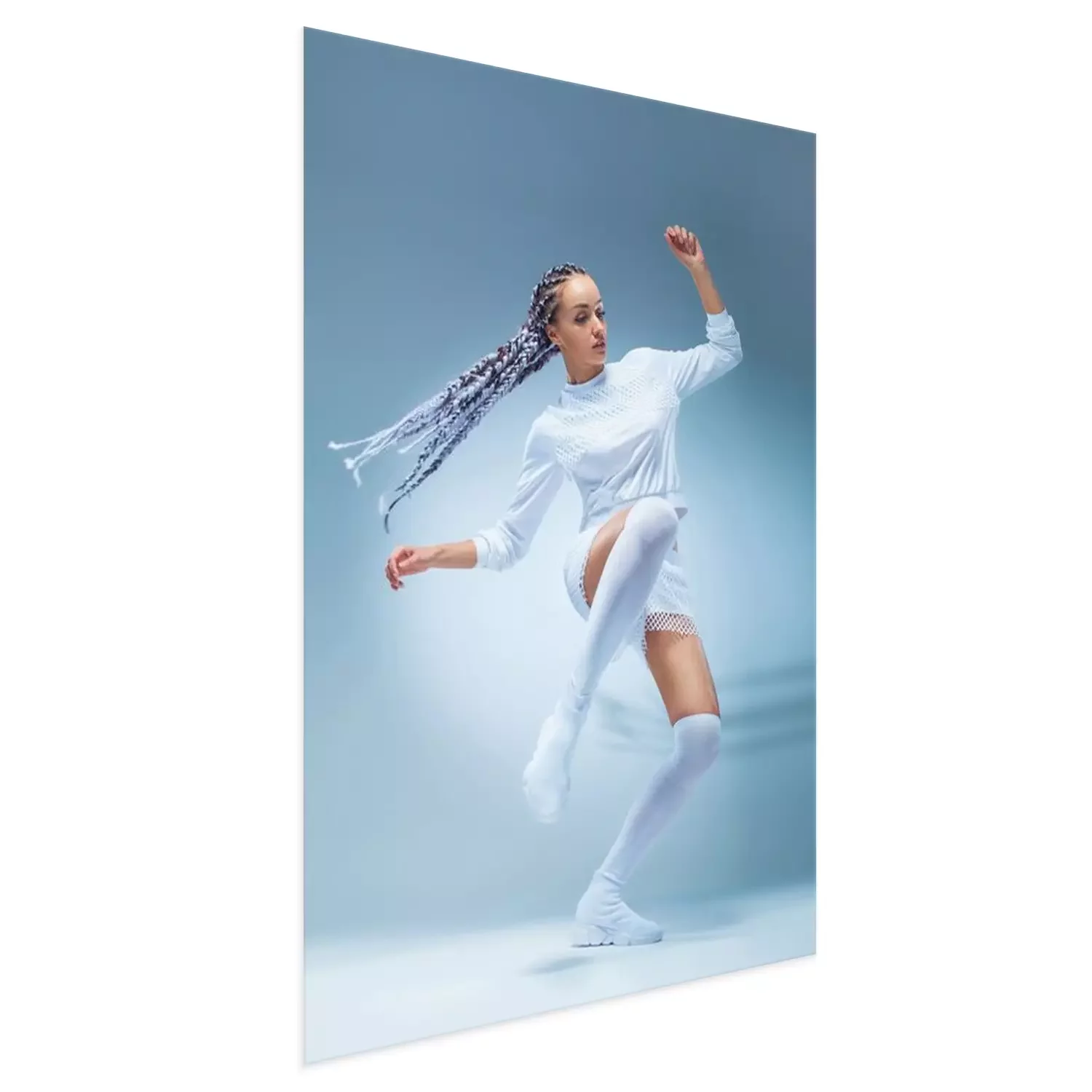 Poster De aantrekkelijke opgewekte danser van het geschiktheidsmeisje in sportwear dans die over blauwe achtergrond wordt geïsoleerd. Mode- en livestyle-concept.