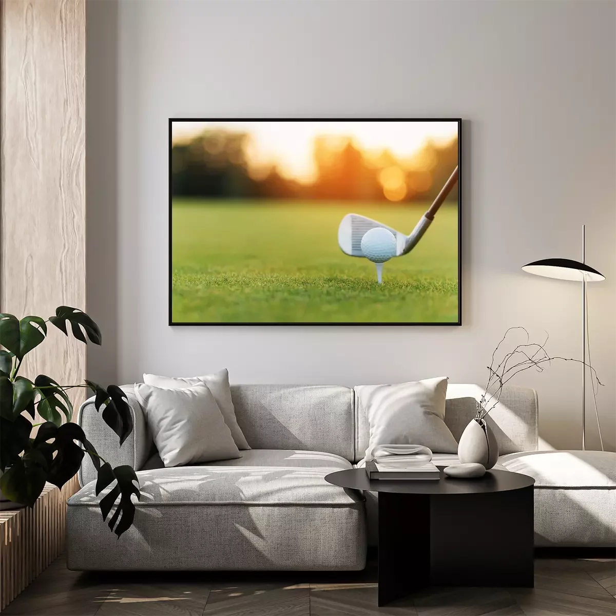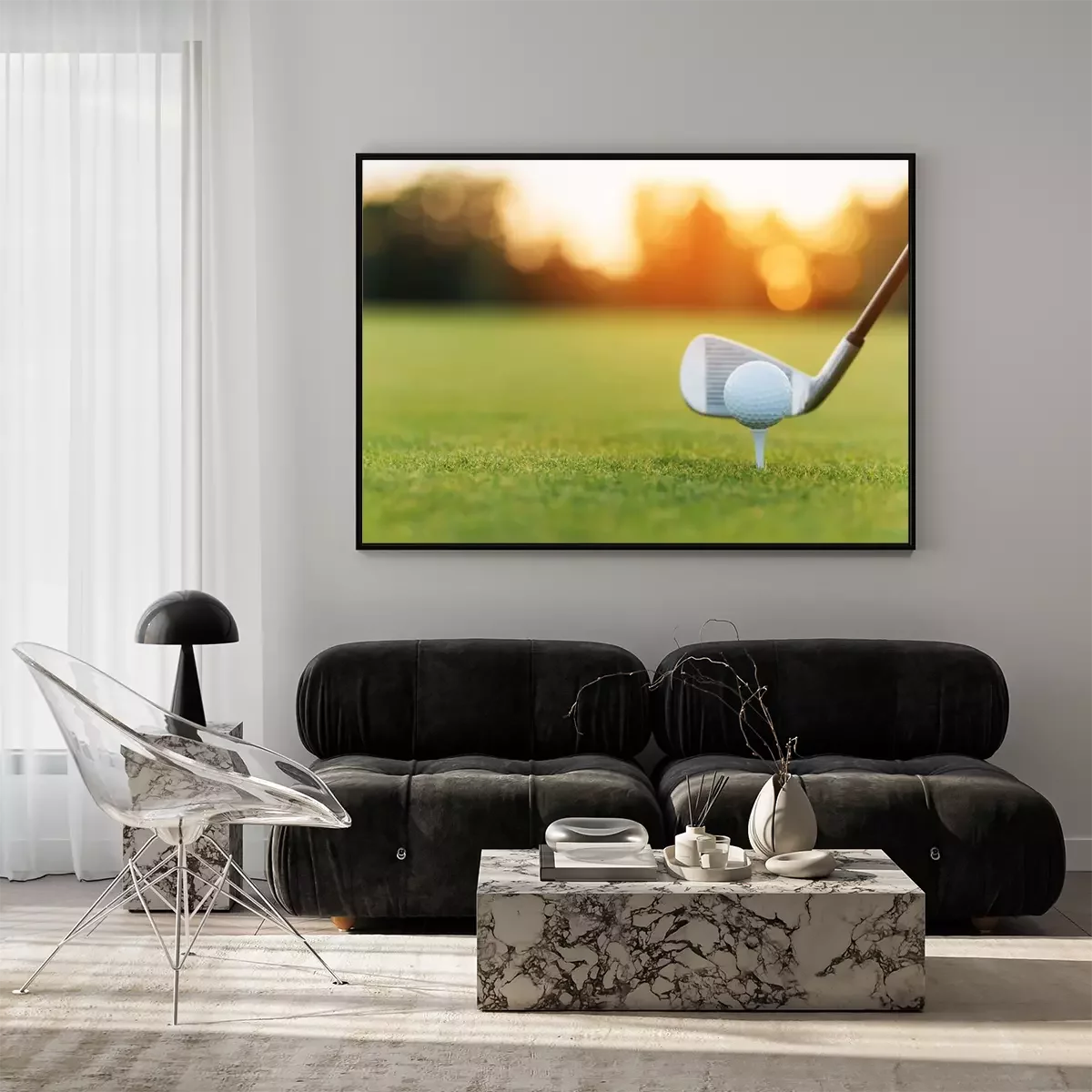 Poster: De golfclub achter de golfbal op de tribune. Tegen de achtergrond van gras en zonsondergang