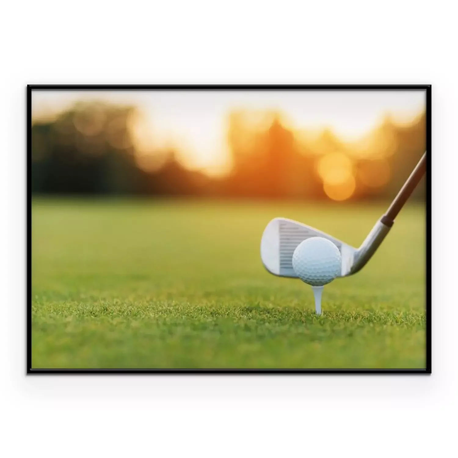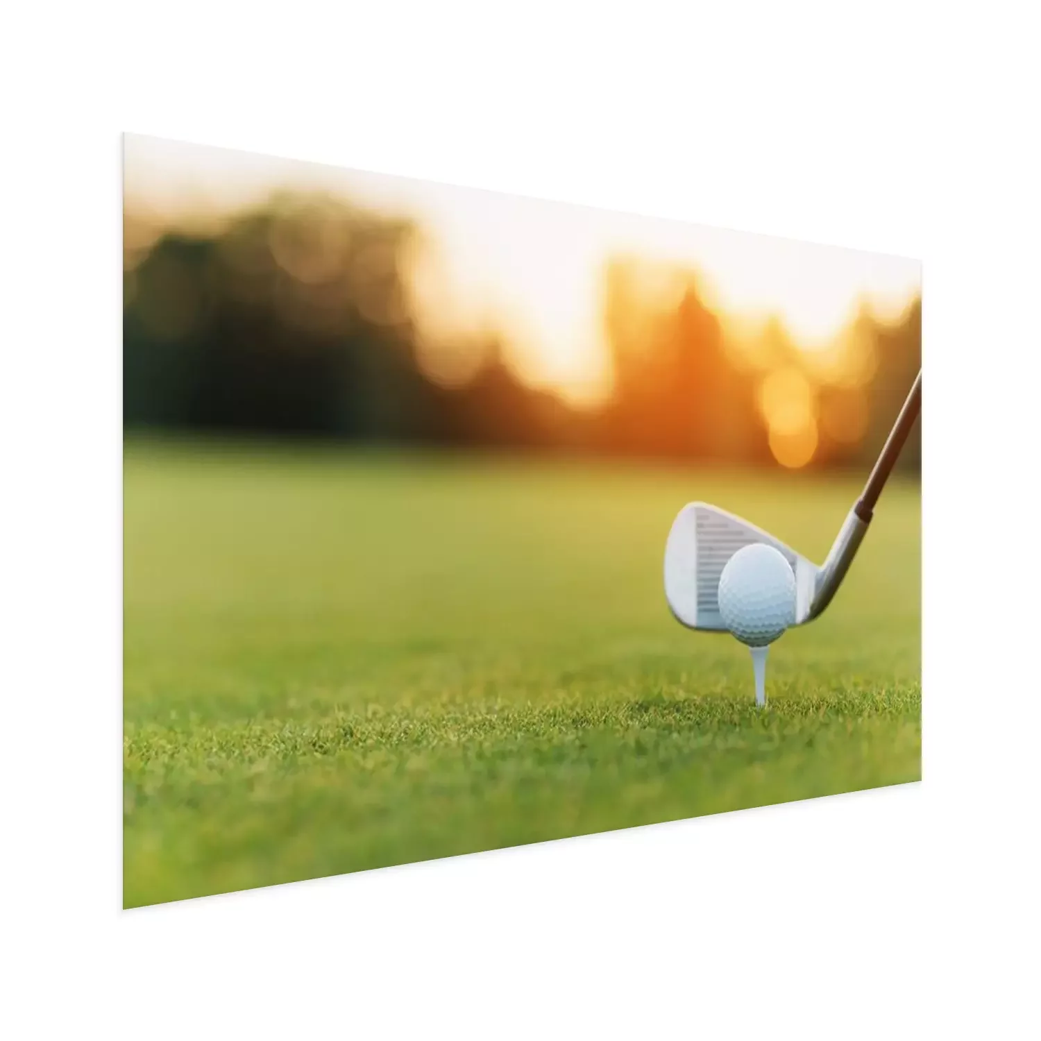 Poster De golfclub achter de golfbal op de tribune. Tegen de achtergrond van gras en zonsondergang