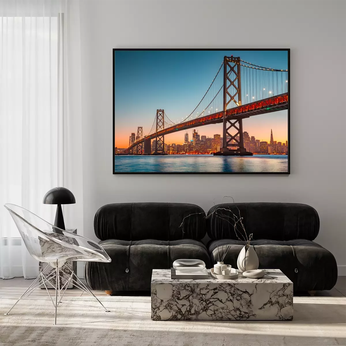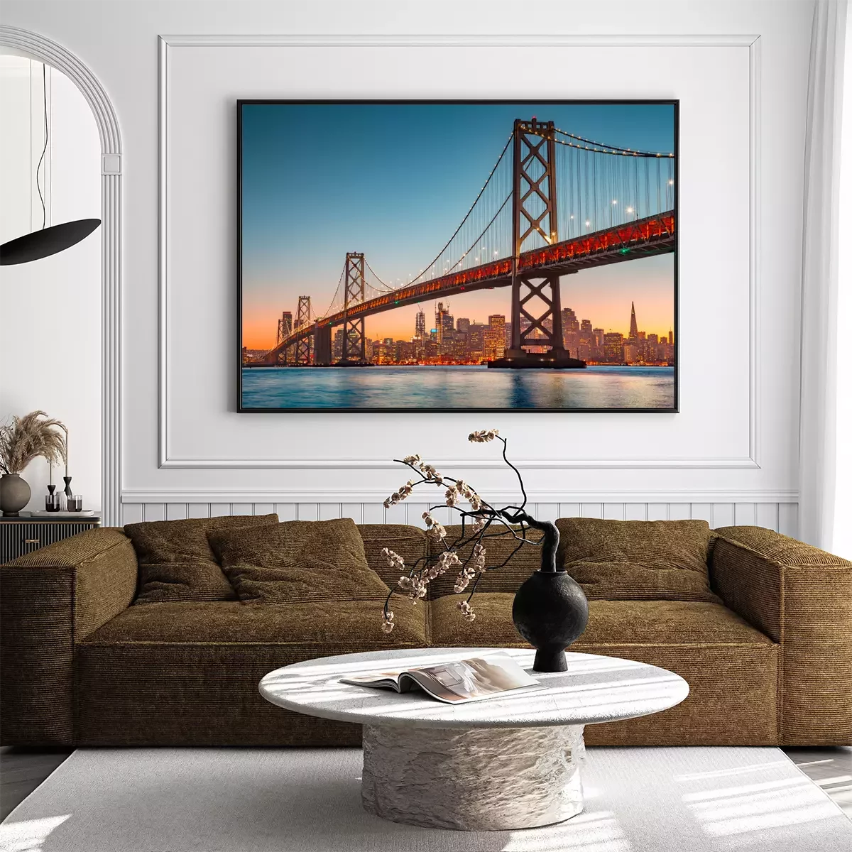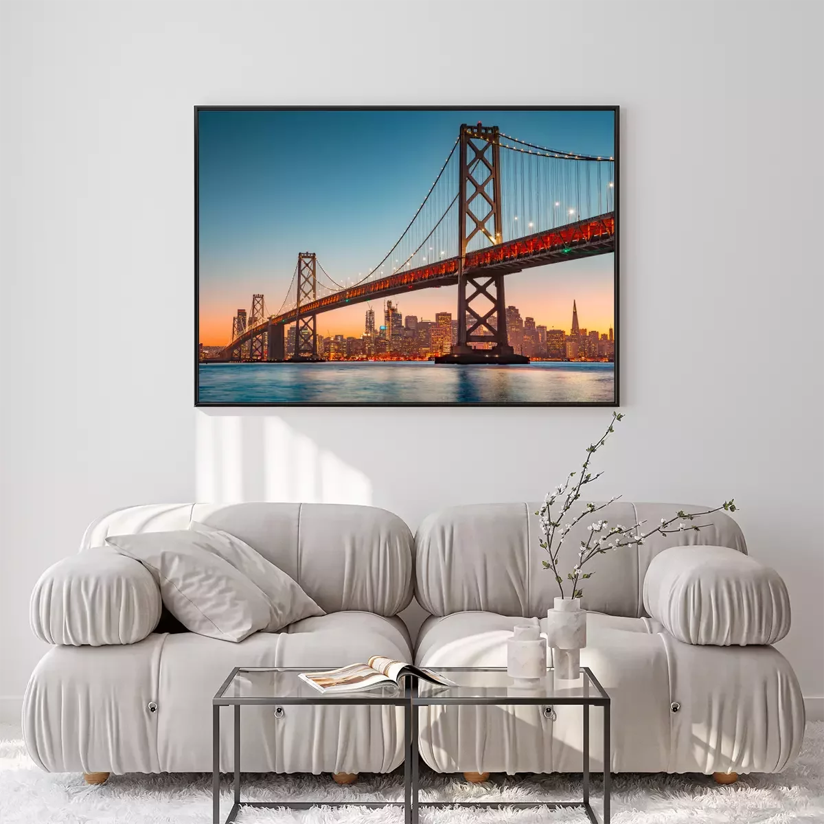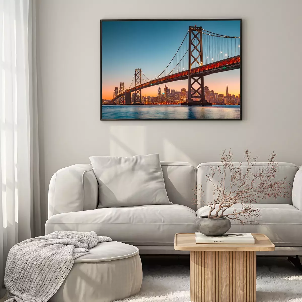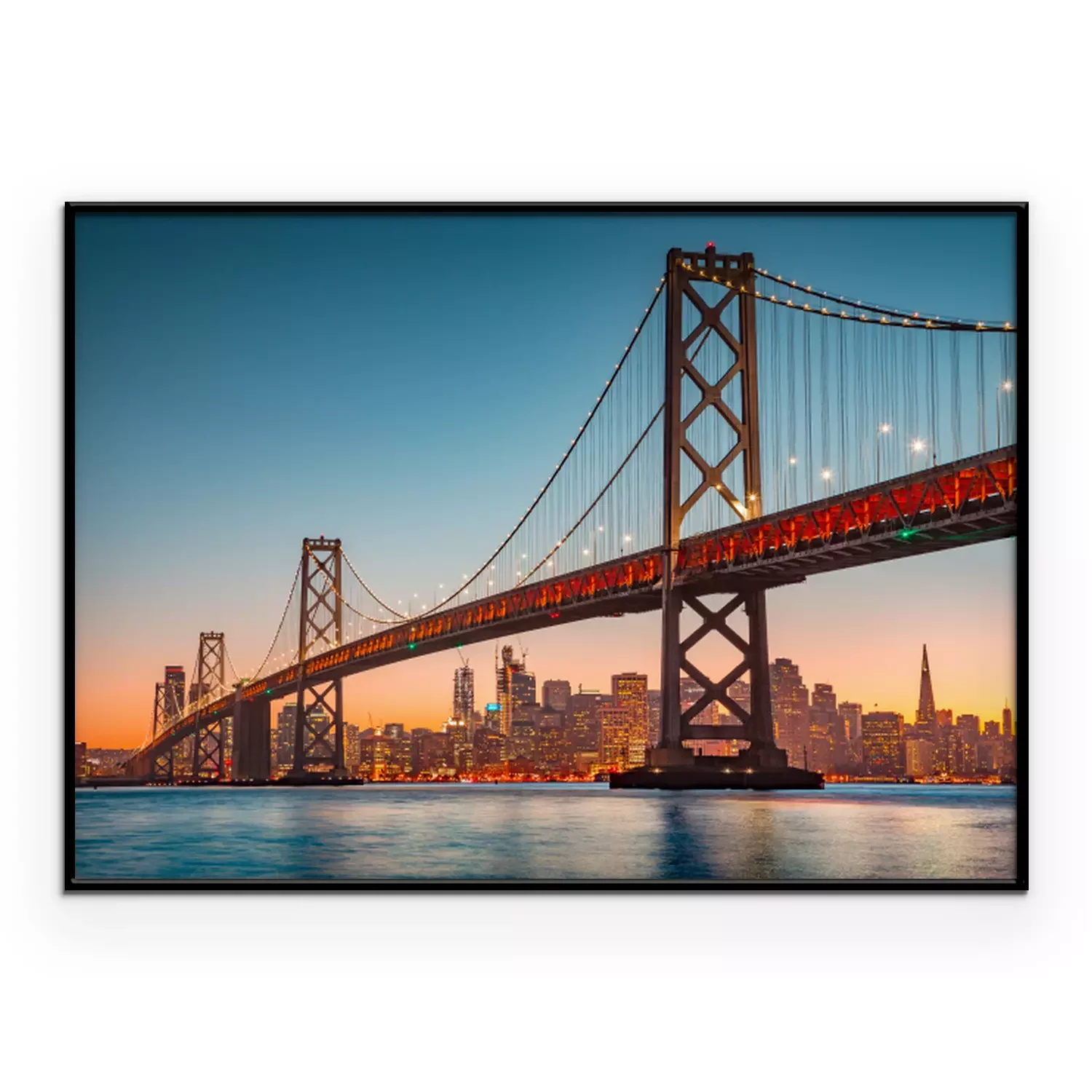 Poster De horizon van San Francisco met de Baaibrug van Oakland bij zonsondergang, Californië, de VS