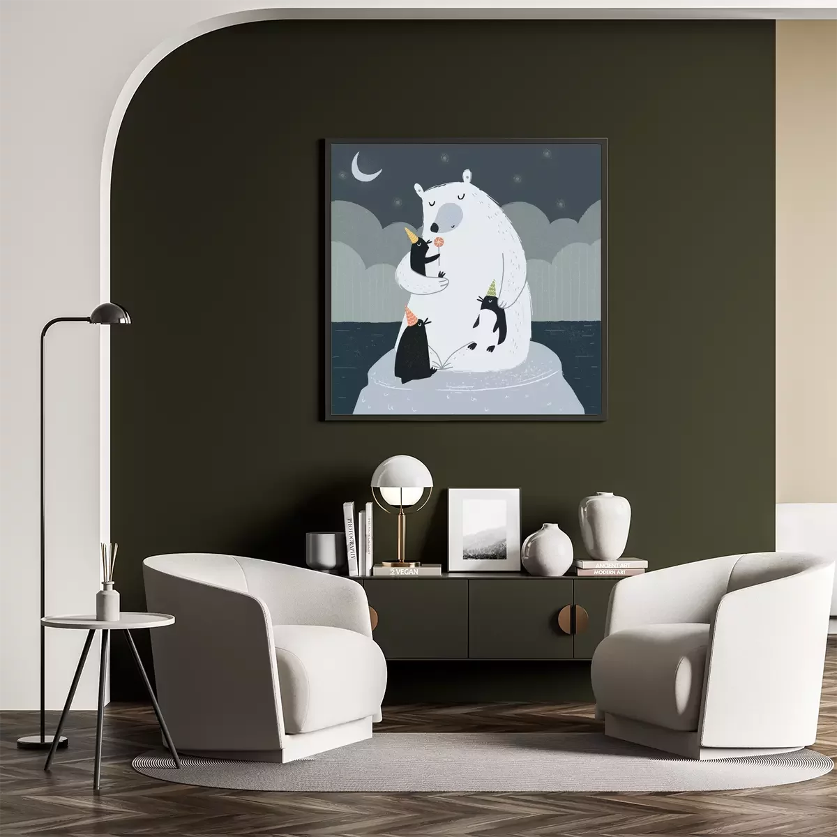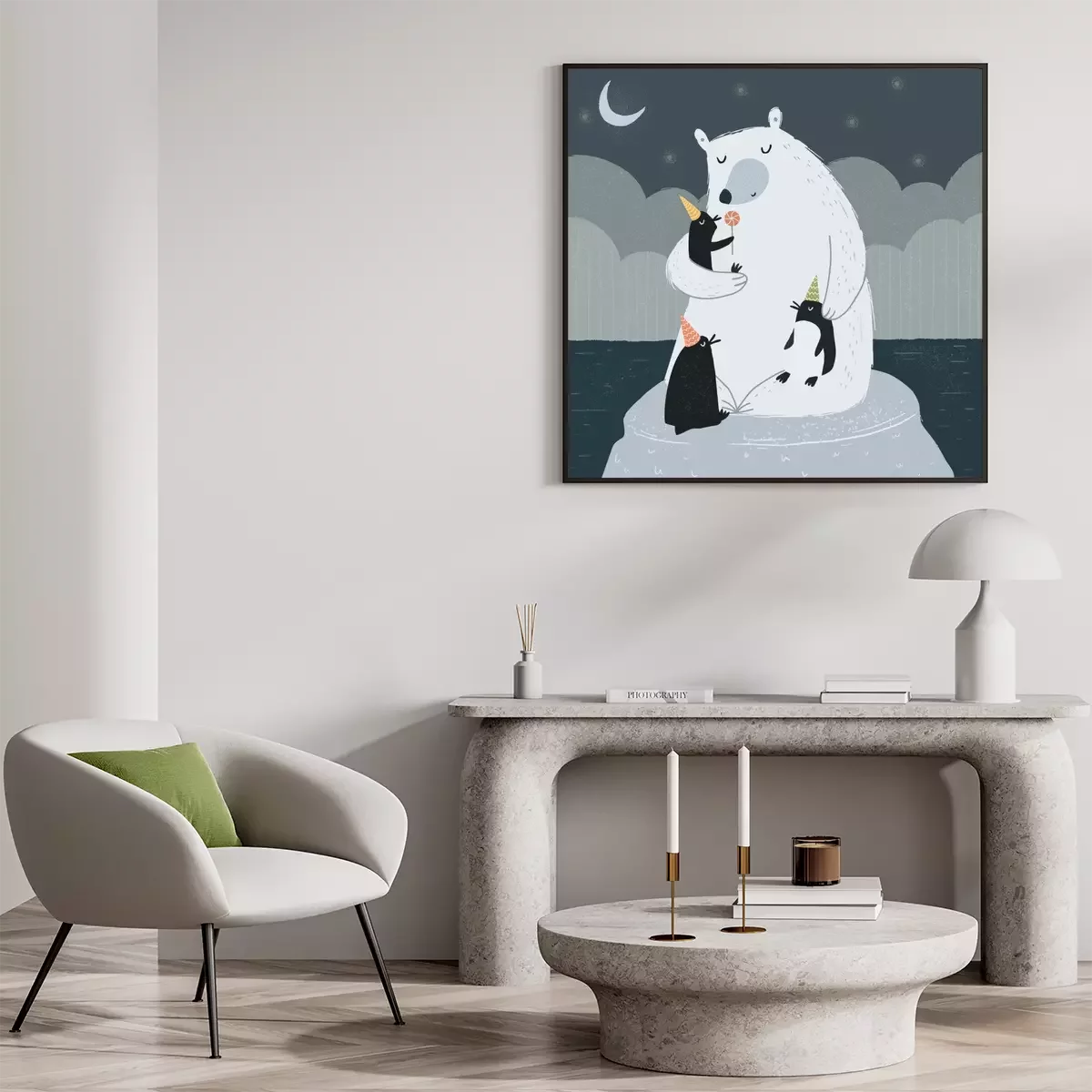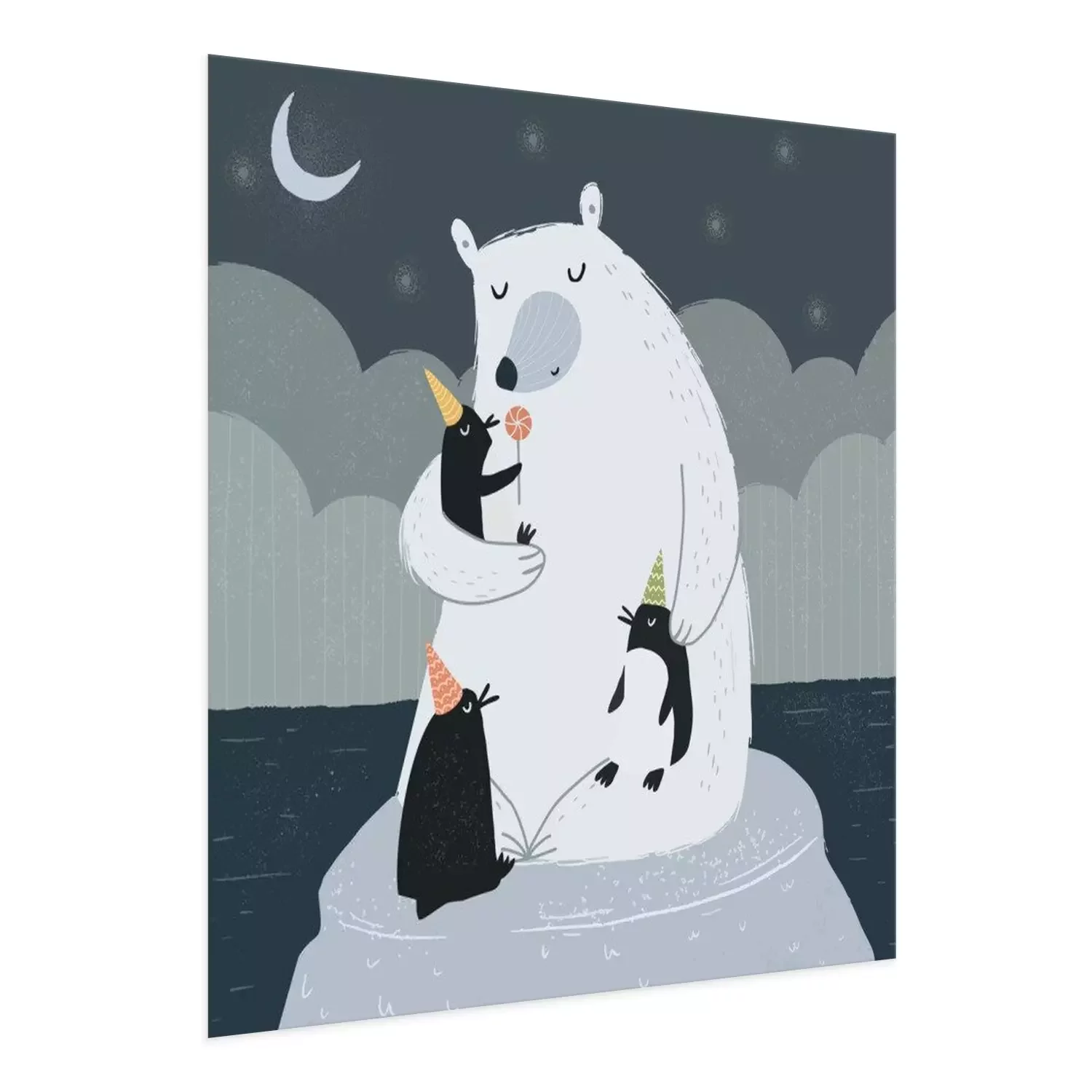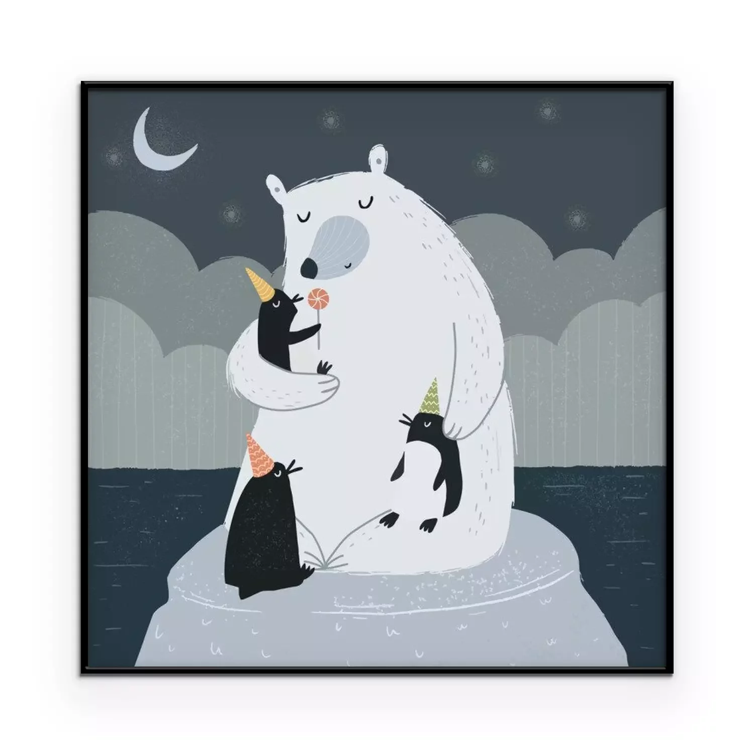 Als je de kinderkamer op een unieke manier wilt decoreren, is het de moeite waard om op zoek te gaan naar originele decoratieve accenten. Een geweldig voorbeeld is die we uit onze collectie hebben geselecteerd de poster. Ijsbeer, die op een ijsschots zit met drie pinguïns die feesthoedjes dragen, zal zeker in de smaak vallen bij een kind dat van dieren houdt. Dit soort winterposter met een sprookjesachtige illustratie zal perfect passen in een kinderkamer die is ingericht in Scandinavische stijl. Een groot voordeel van deze tekening is dat deze is uitgevoerd in een ingetogen kleurenpalet – voornamelijk zwart, wit en grijstinten – waardoor dit decoratieve accent het kind niet zal afleiden of overprikkelen. In een wereld waarin kinderen vaak overgestimuleerd worden, zijn dergelijke interieurkeuzes bijzonder gunstig. Een ander aspect waar je op moet letten, is de stijl waarin de poster is ontworpen. Een tekening zal een artistiek accent vormen in de kamerinrichting en een prachtig visueel effect creëren. Omdat de winterposter een ijsbeer en pinguïns toont in de nachtelijke sfeer, met een sterrenhemel en een maan boven hen, zal deze illustratie bijzonder goed tot zijn recht komen boven het kinderbed. Dit is een geweldige manier om het kind te motiveren om ’s avonds gemakkelijker naar bed te gaan, wetende dat het gezelschap heeft van deze schattige dieren. De door ons voorgestelde poster is op zo’n manier ontworpen dat hij zowel in de kamer van een pasgeborene, een kleuter als een basisscholier goed past. Wanneer is een dergelijke poster een goede keuze? Een Ijsbeer is een perfecte optie voor een kind dat niet alleen van dieren houdt, maar ook van de winter en alle activiteiten die bij dit seizoen horen. Onze collectie bevat meer Winterposters met sprookjesachtige illustraties van dieren. Dus als er veel lege ruimte op de muren in de kinderkamer is, kun je in plaats van slechts één poster op te hangen, meerdere bij elkaar passende illustraties in dezelfde stijl kiezen en een indrukwekkende gallery wall creëren.
