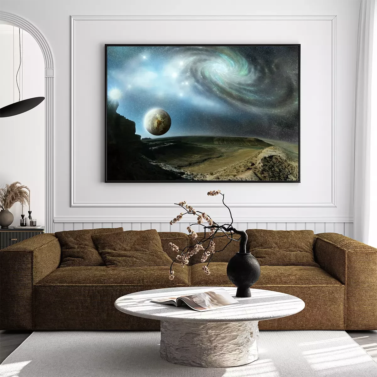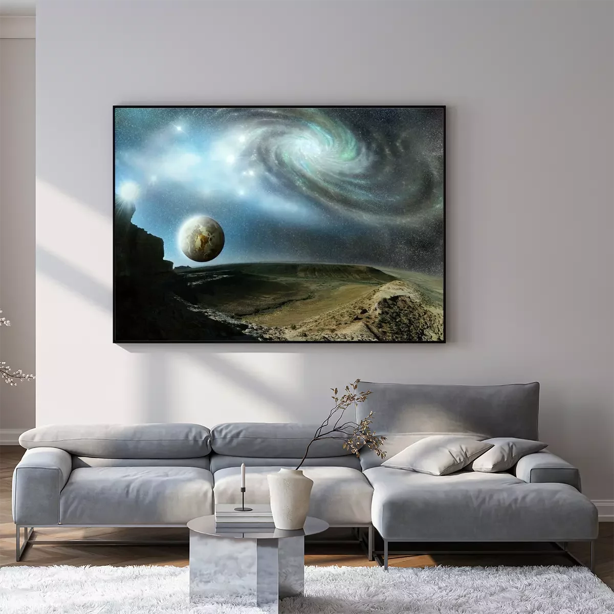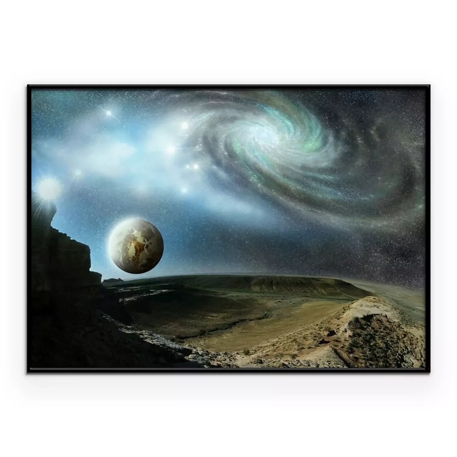 Poster: De ruimte die zich uitstrekt over een onbekende planeet
