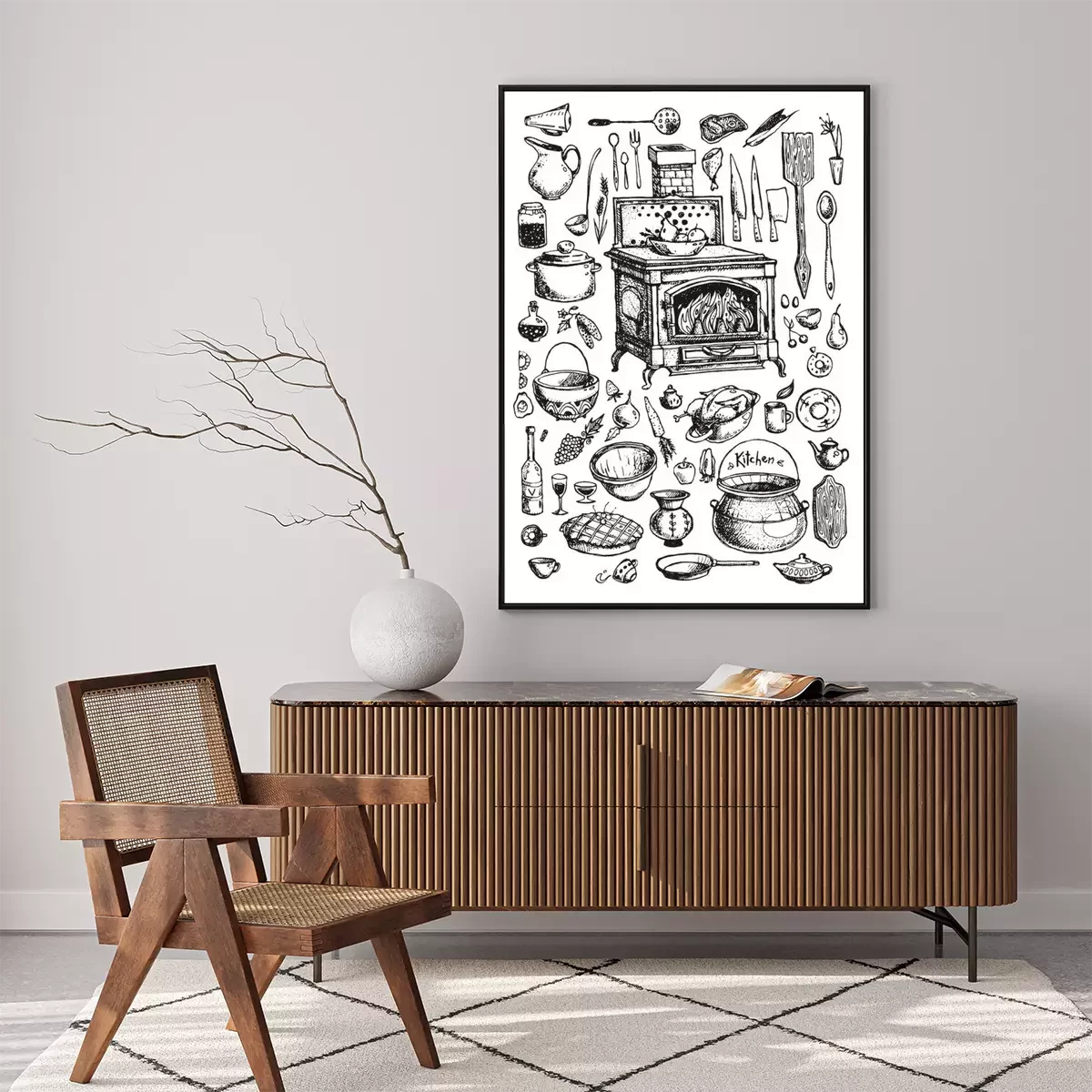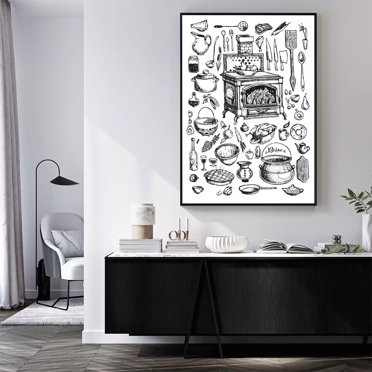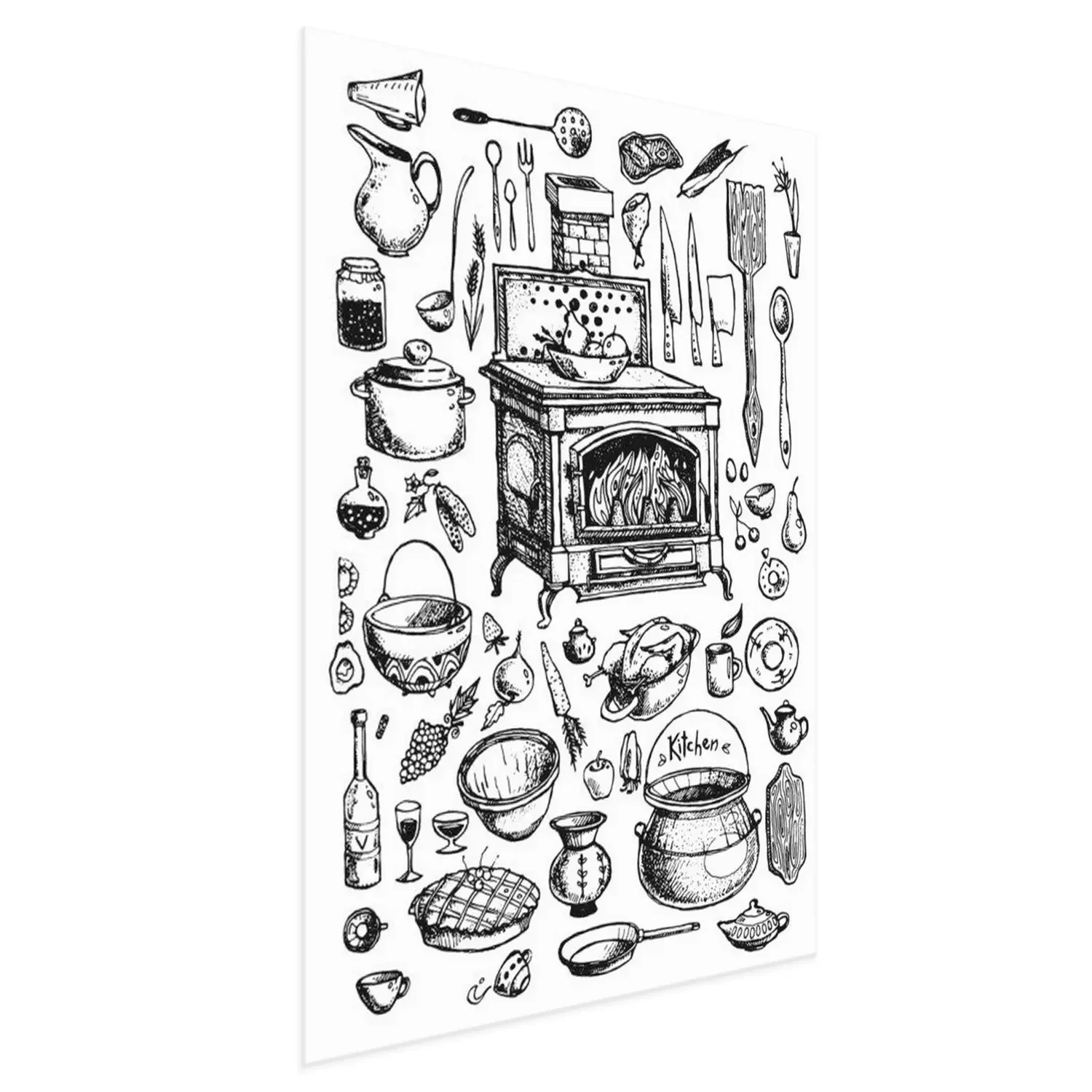 Poster: De set van vintage keukengerei. Verzameling van oude keuken spullen. Inkt hand getrokken illustratie. Oude oven, borden, lepels, messen, potten, waterkokers, etc.