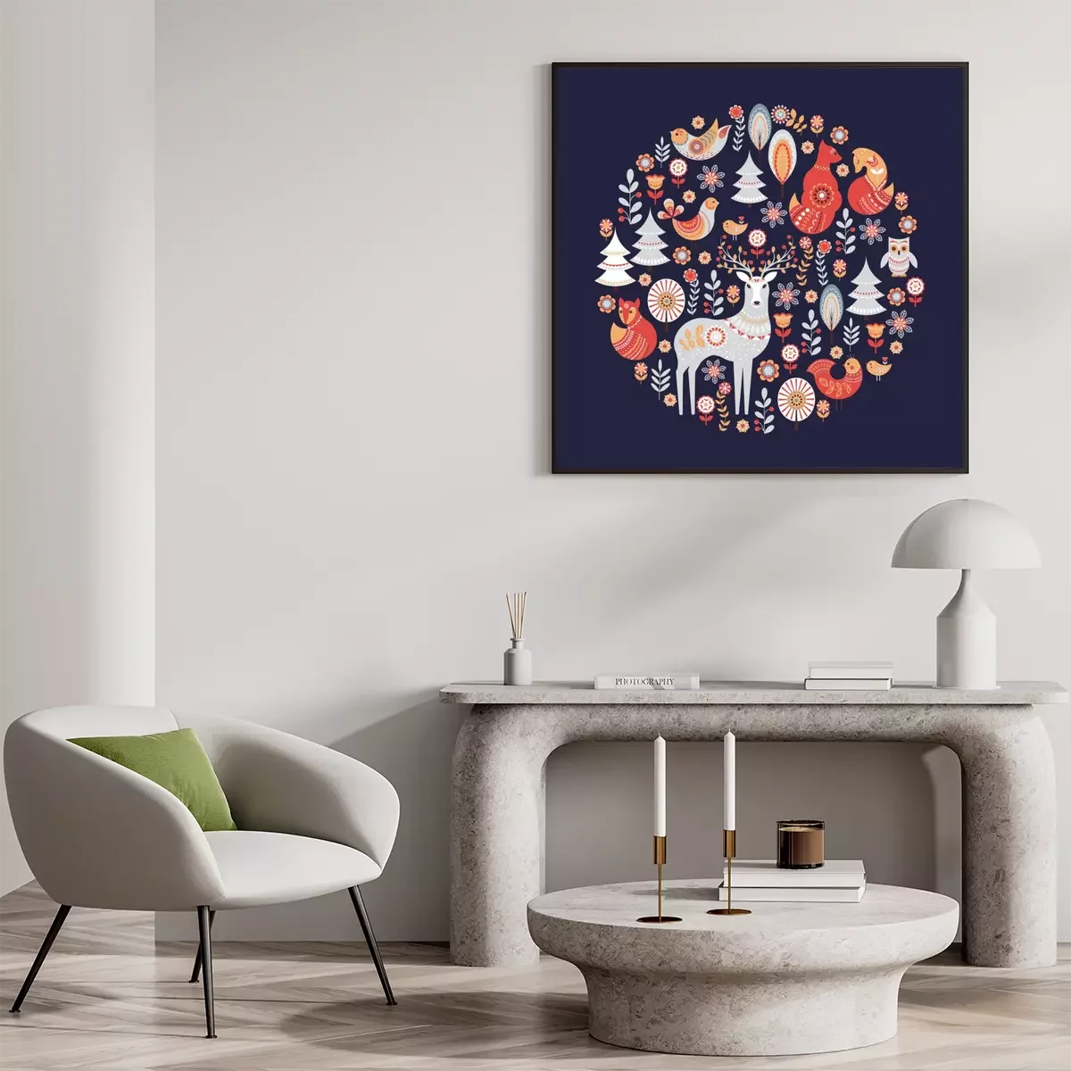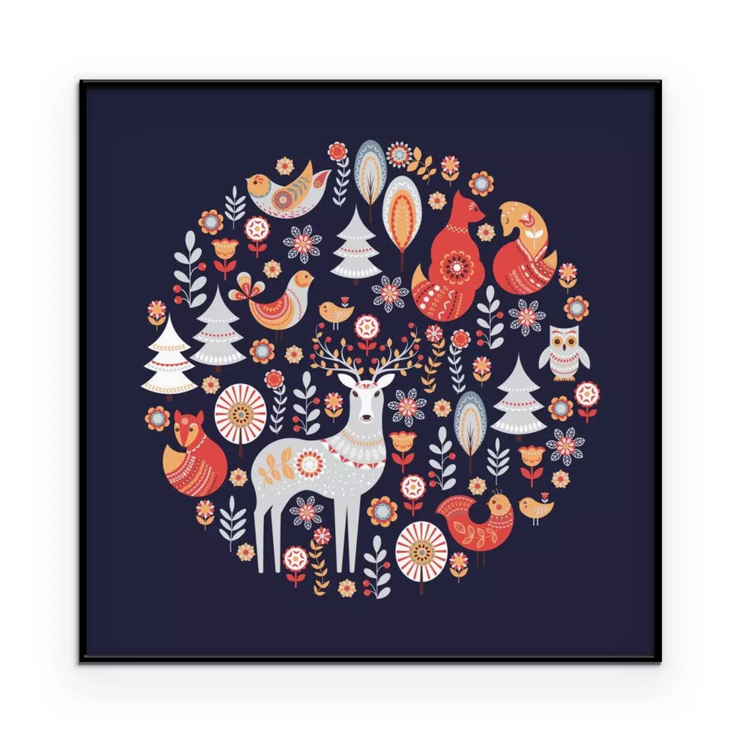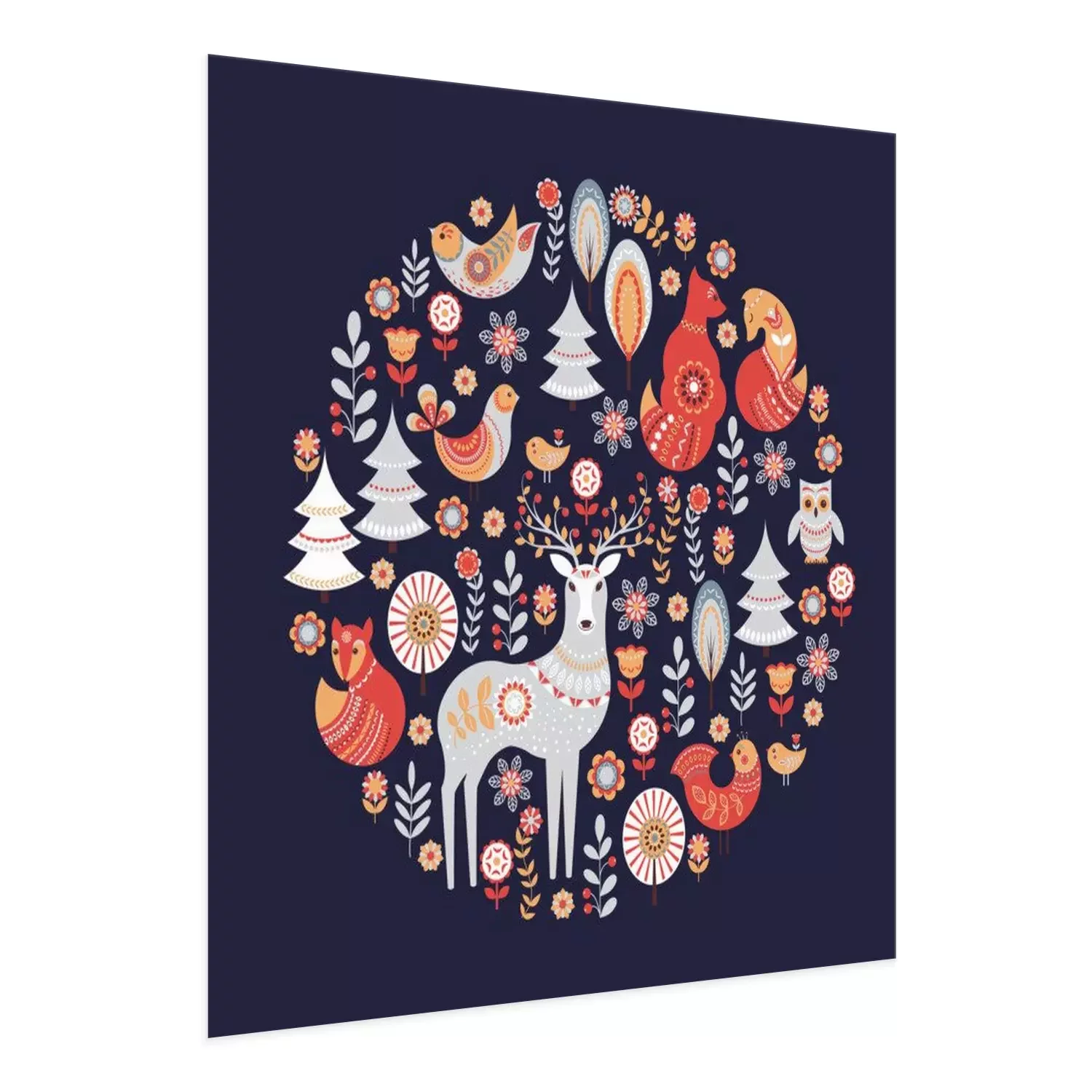 Poster: Decoratief cirkelornament met dieren, vogels, bloemen en bomen.