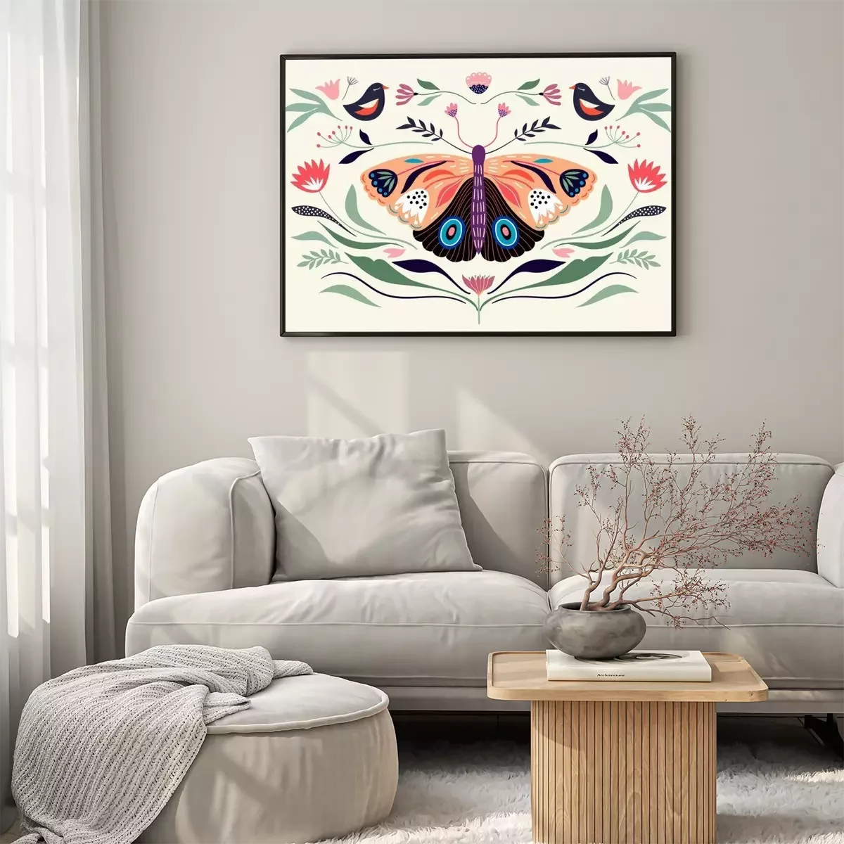 Poster: Decorative poster/banner/composition with floral elements, butterfly,different flowers and plants