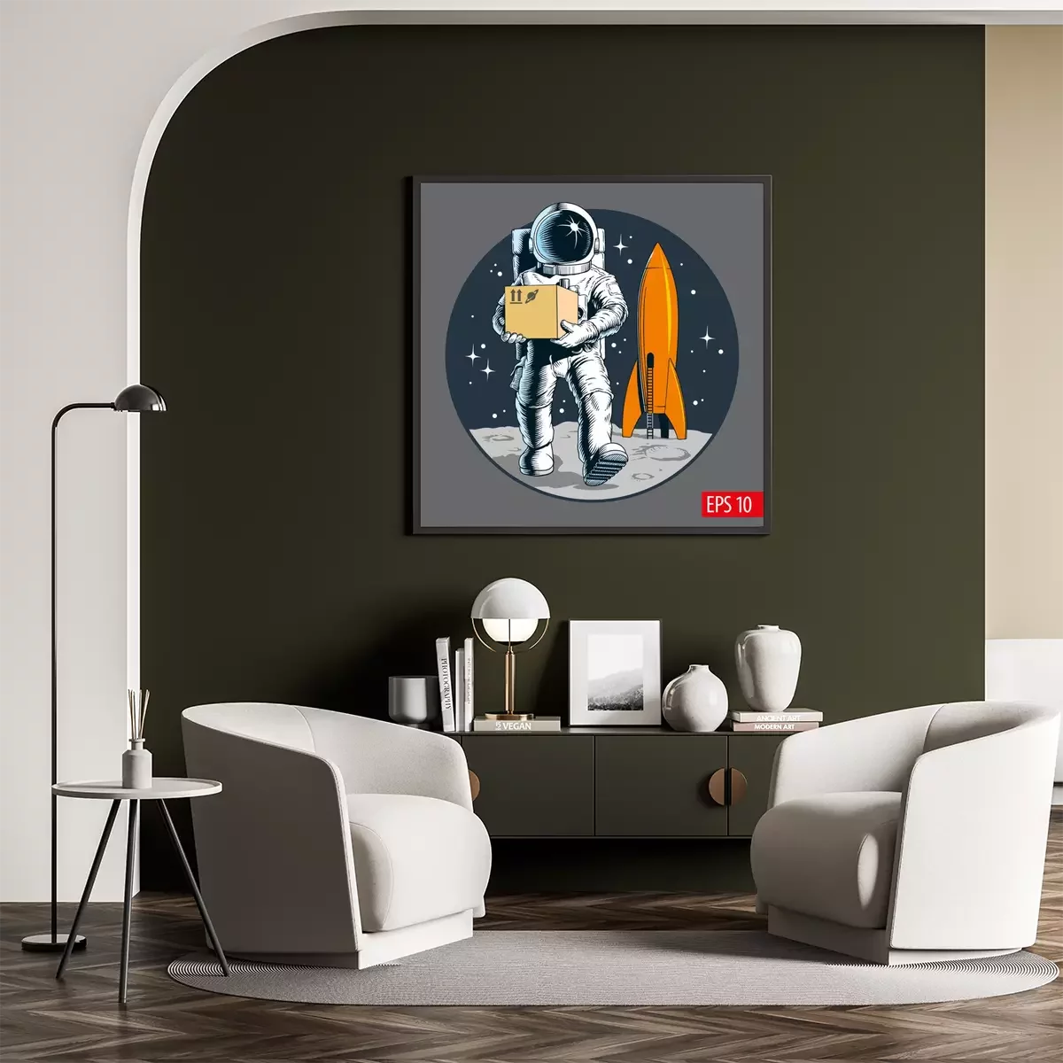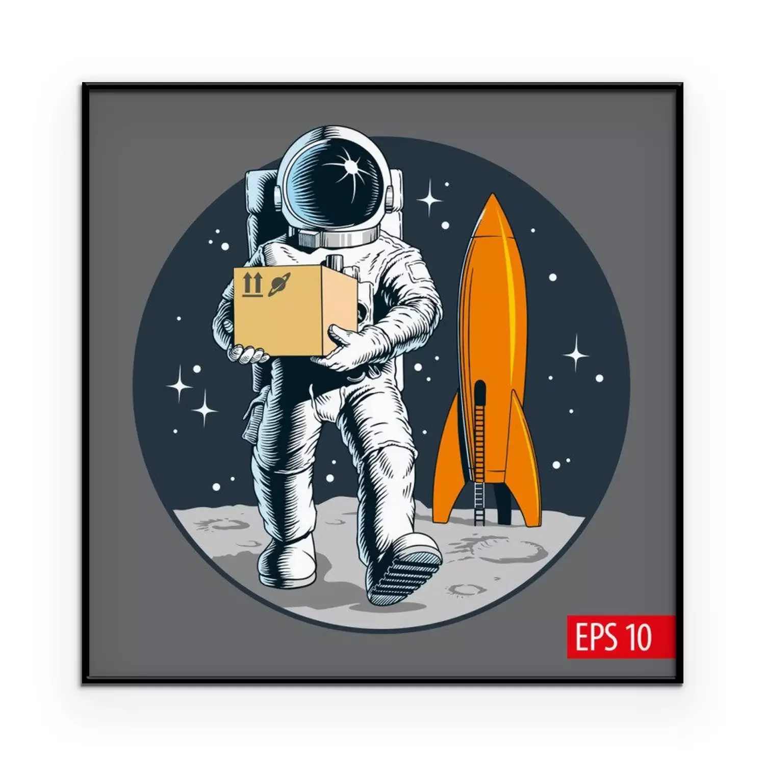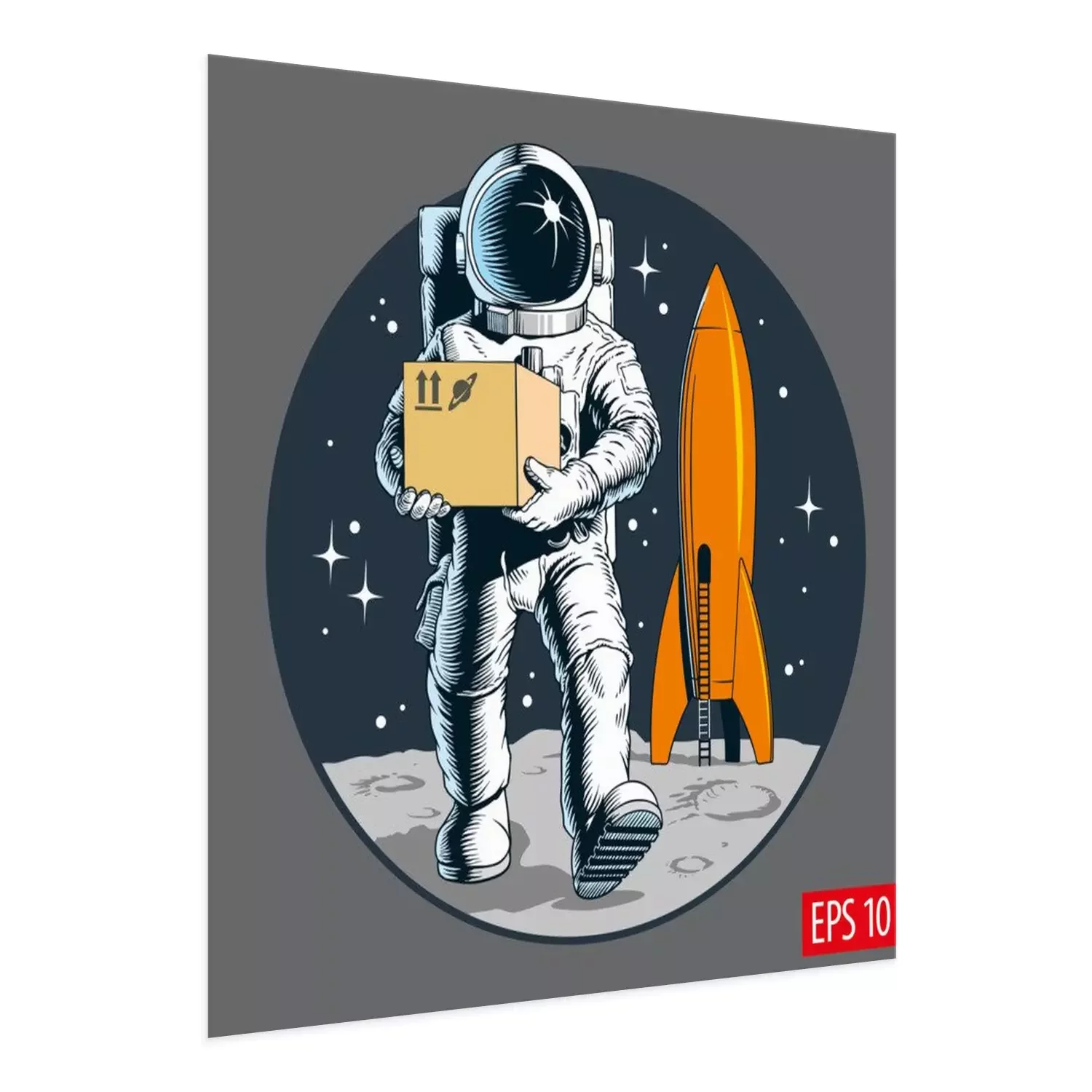Poster Delivery service, astronaut holding package or cardboard box. Space colonization. Shipping cargo to space. Vector illustration.