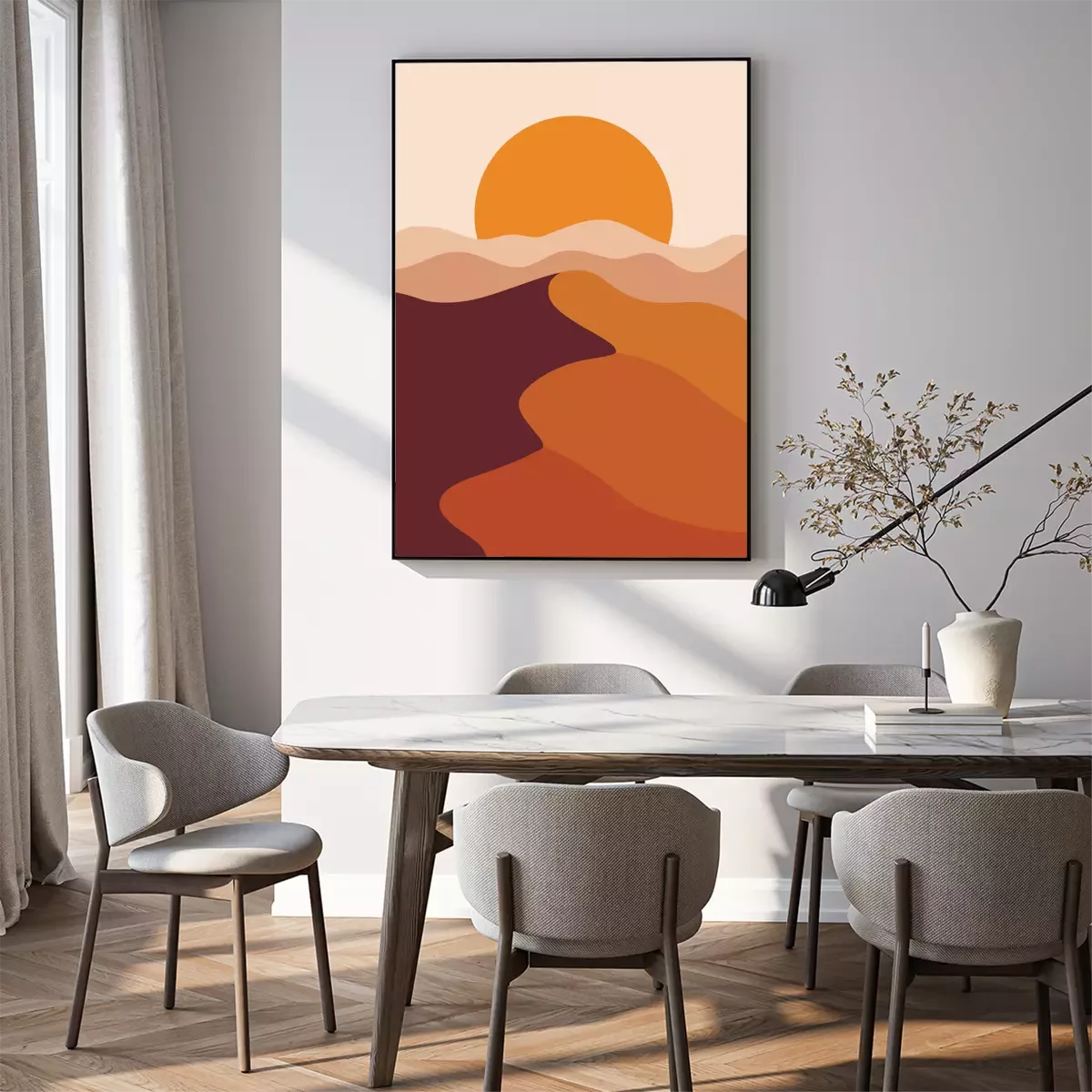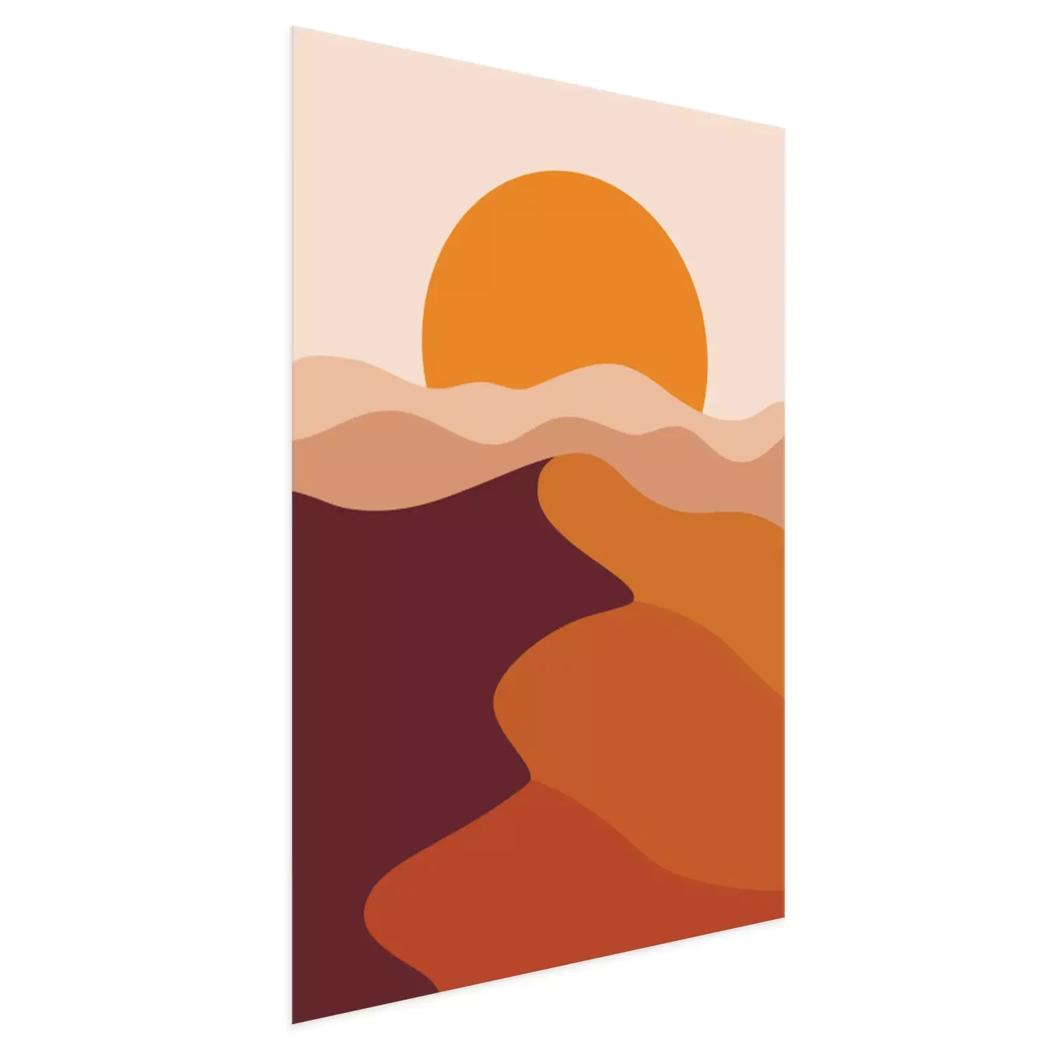 Poster Desert landscape in a vertical format, warm beige colors. Vector illustration with sunset in mountains. Abstract landscape poster.
