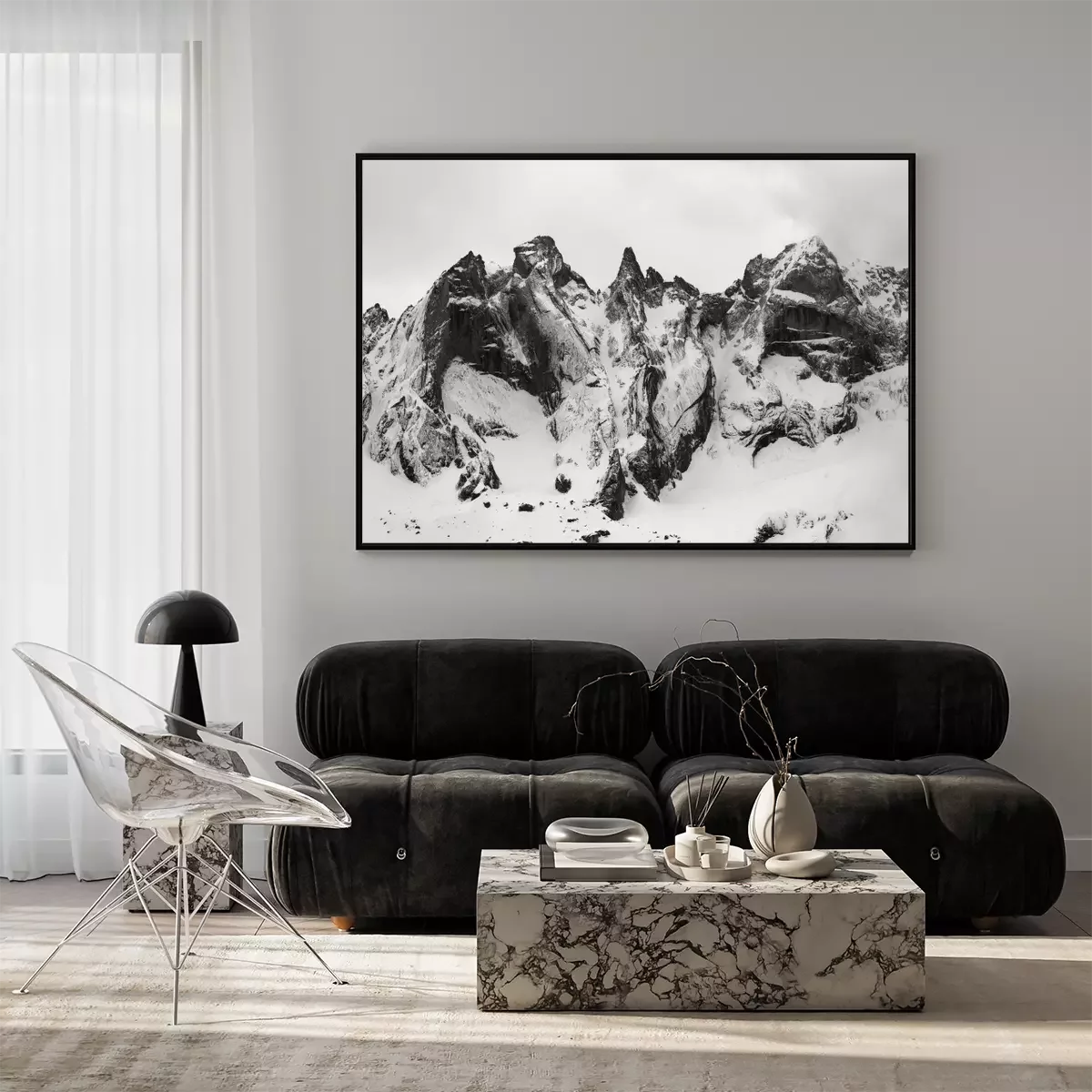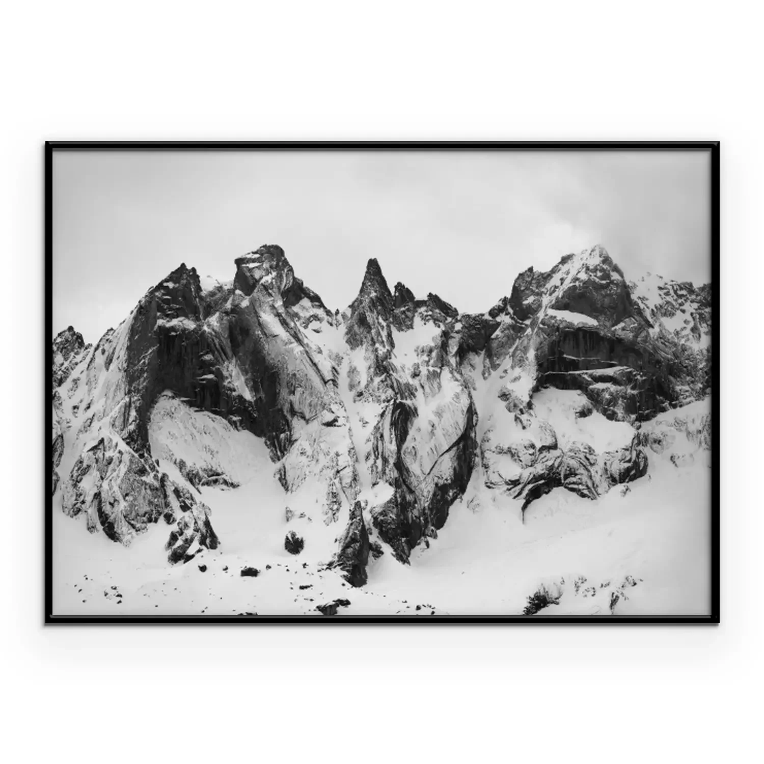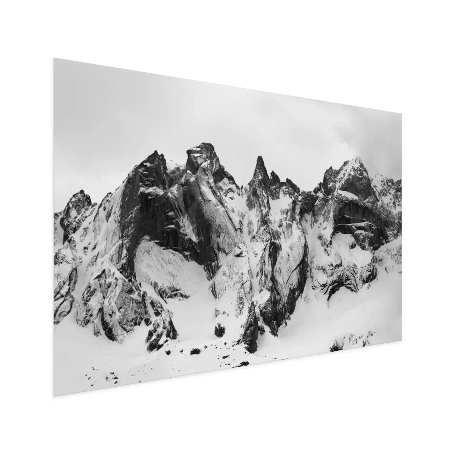 Poster: Detail van de Sciero-groep in de Rhätische Alpen in Zwitserland. Zwart-witte fijne kunstberg de winter