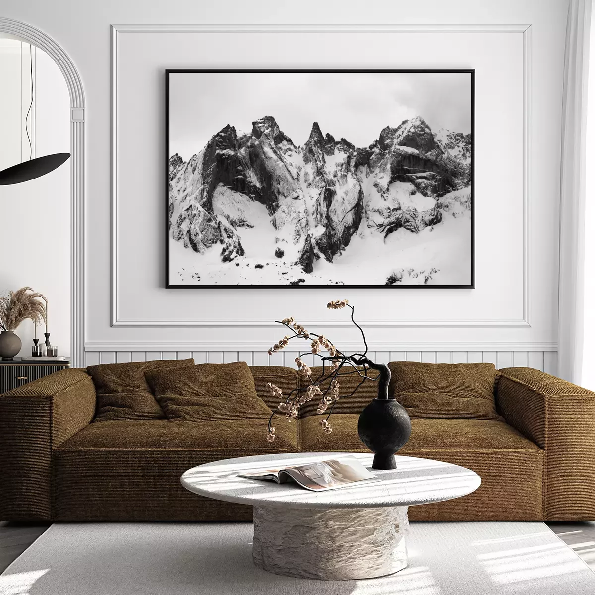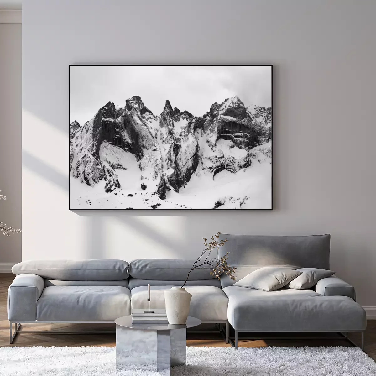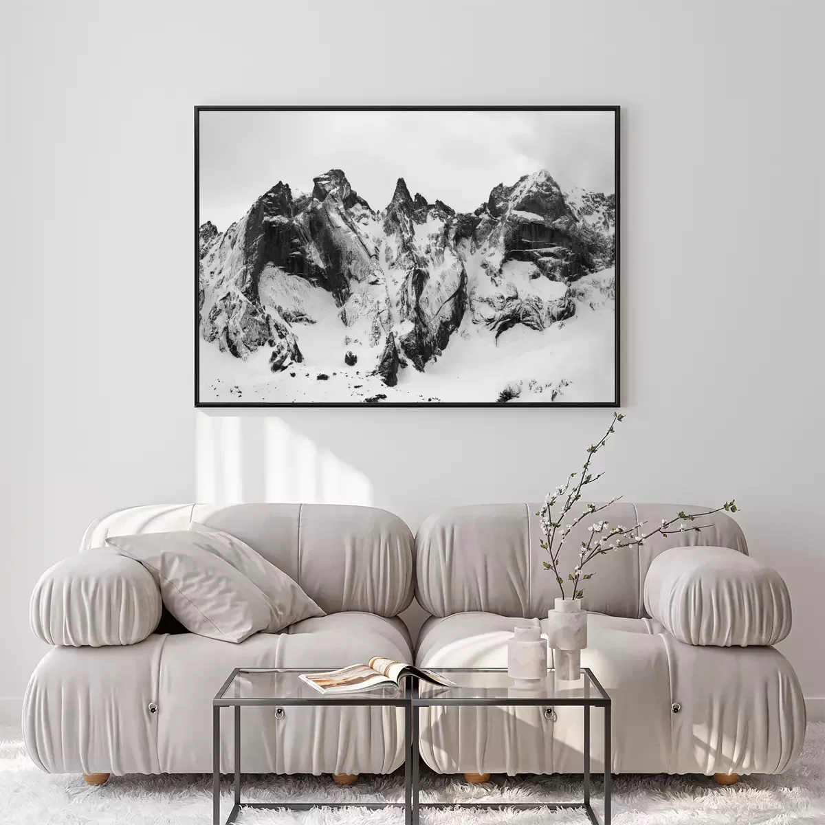 Poster: Detail van de Sciero-groep in de Rhätische Alpen in Zwitserland. Zwart-witte fijne kunstberg de winter