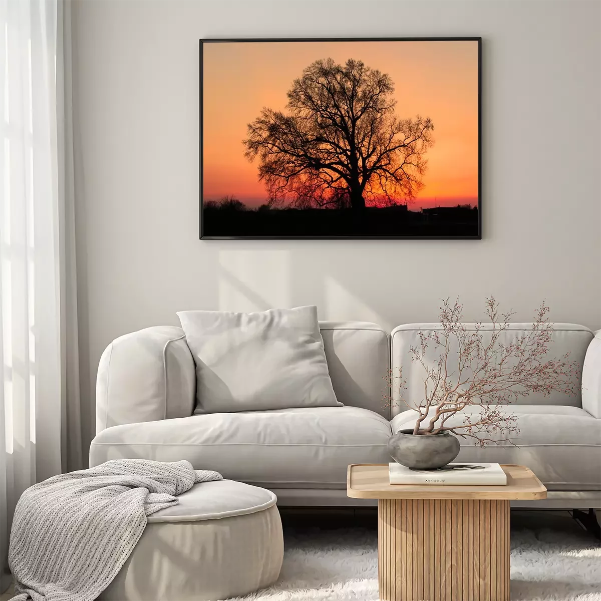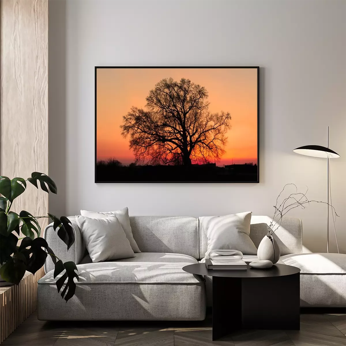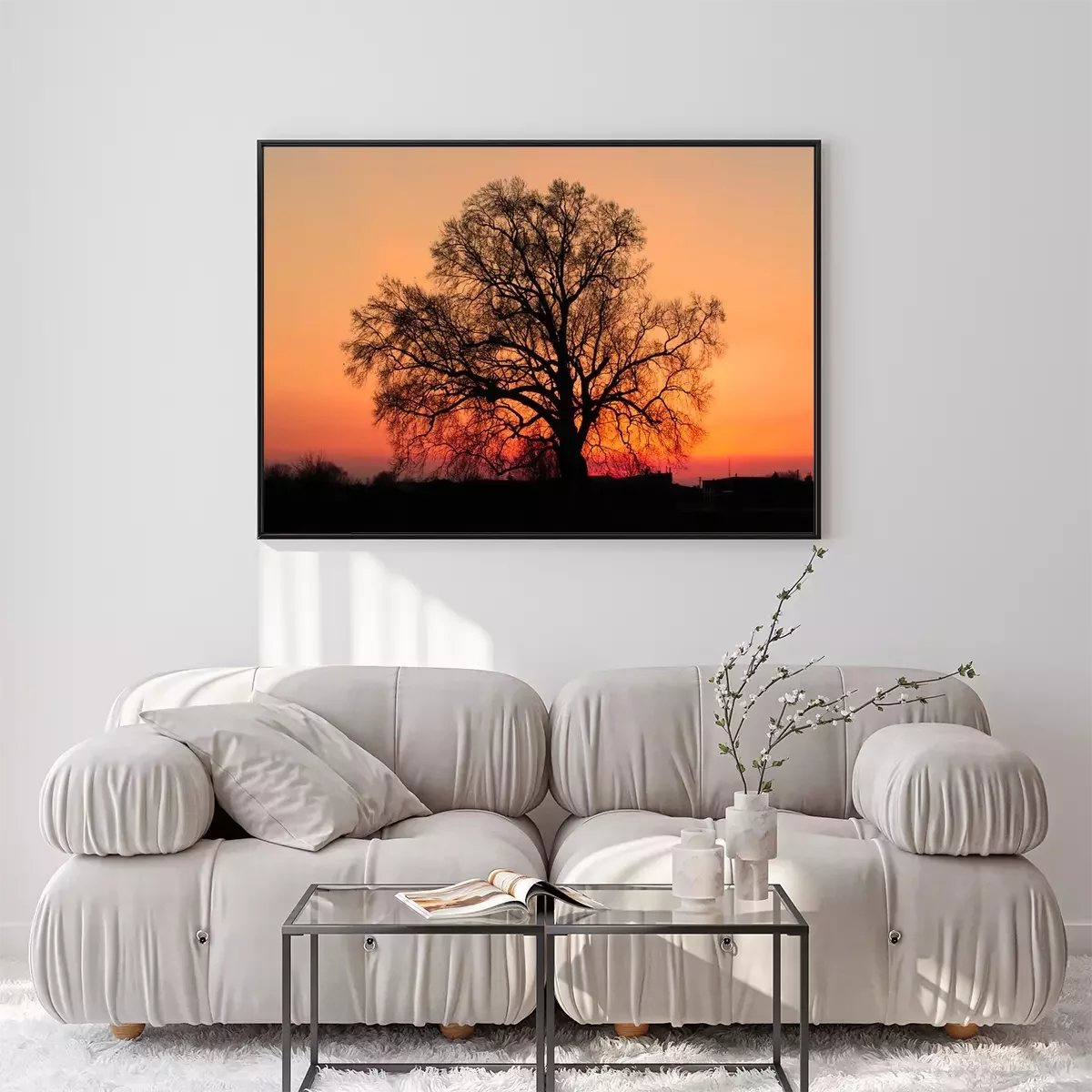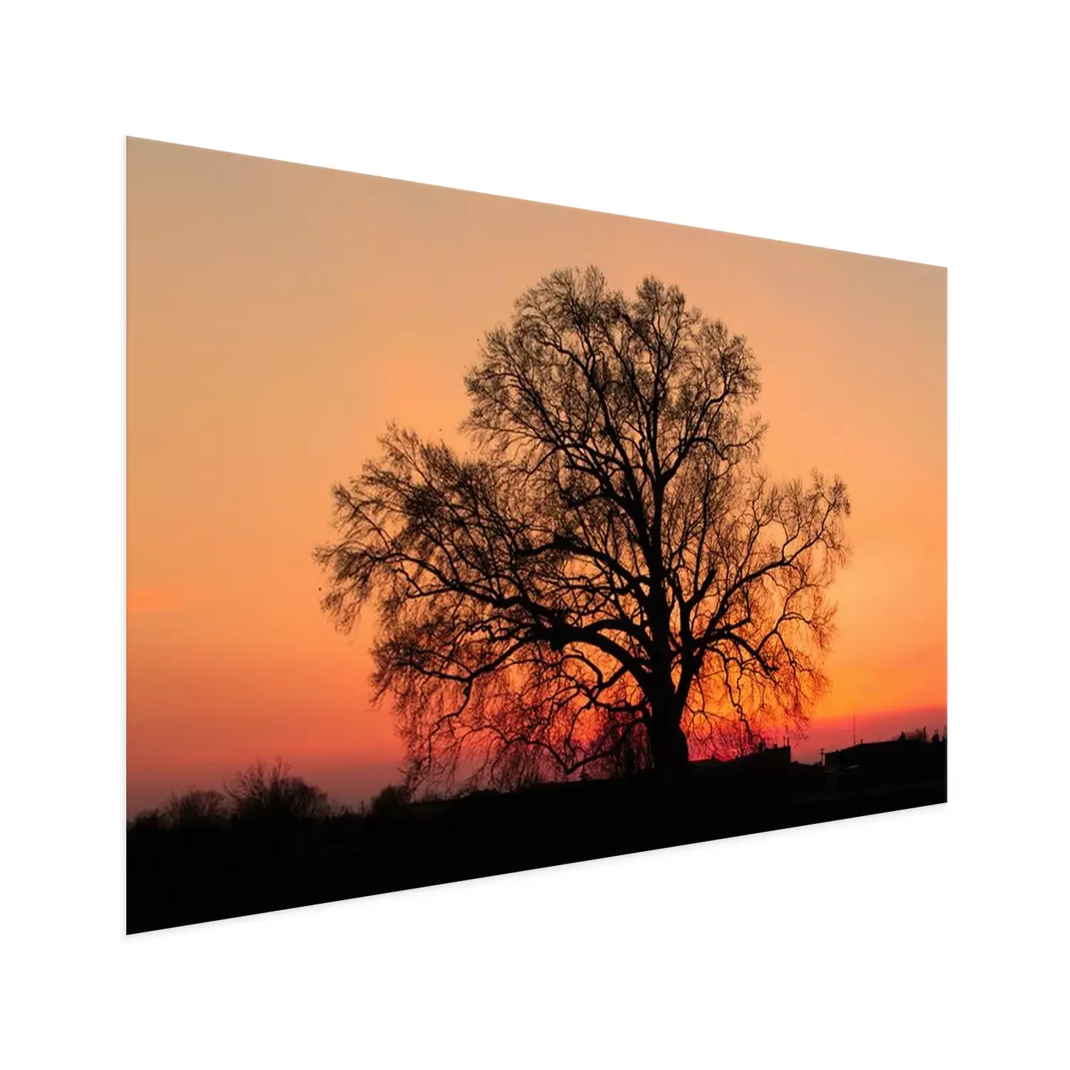 Poster: Dichte takken tegen de achtergrond van de zonsondergang