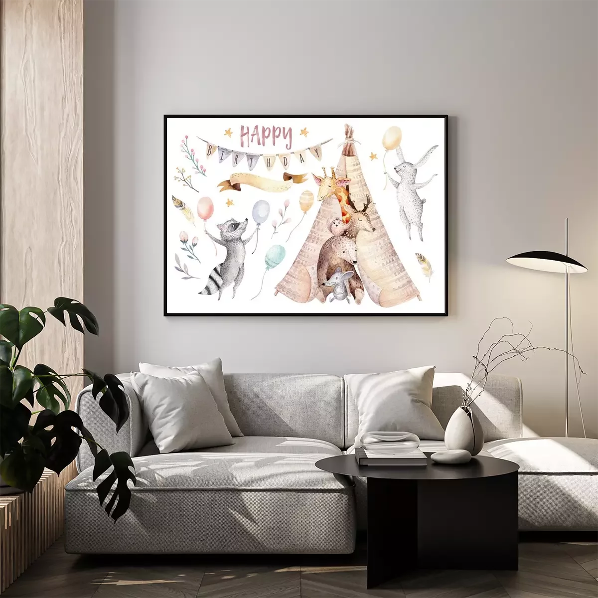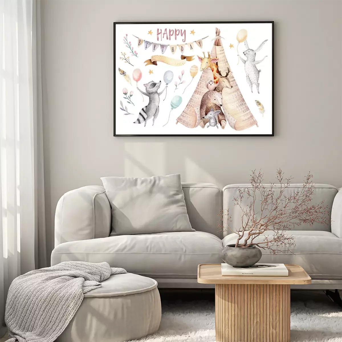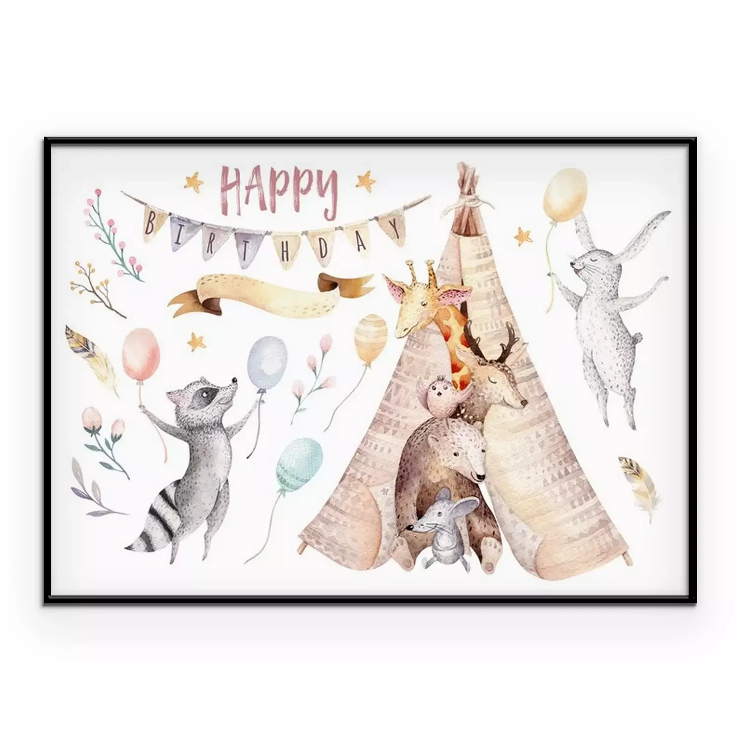 Poster Dieren die uit de tipi leunen en de inscriptie verjaardag