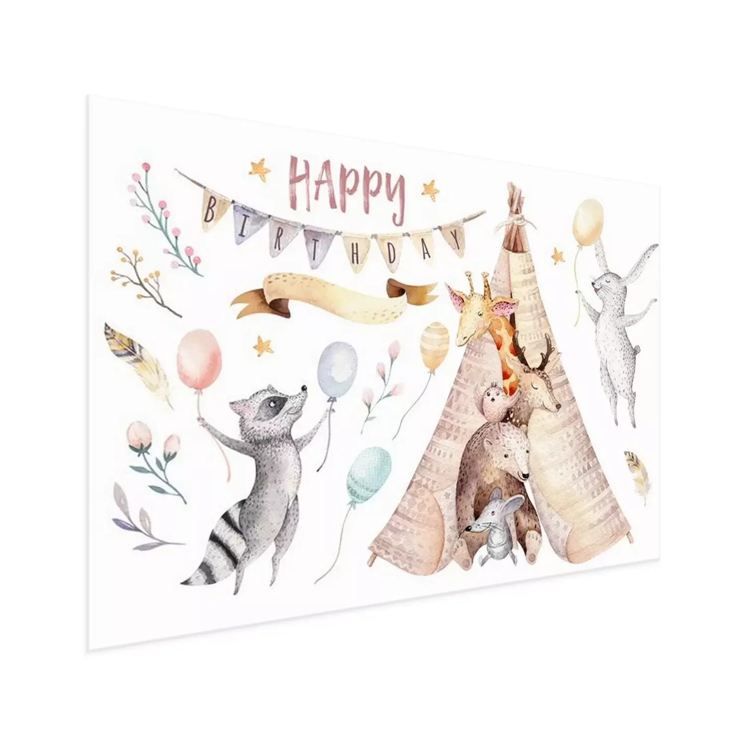 Poster: Dieren die uit de tipi leunen en de inscriptie verjaardag