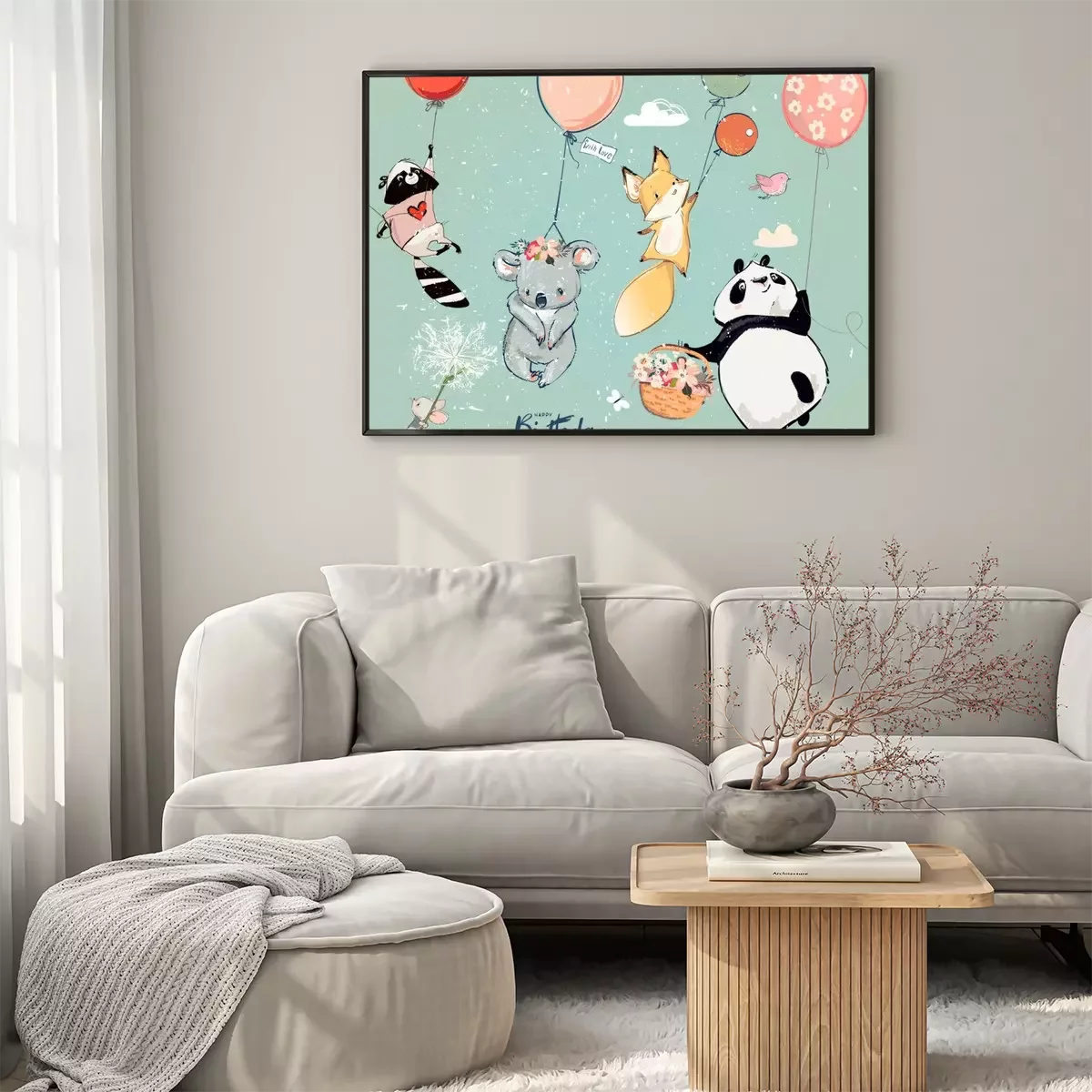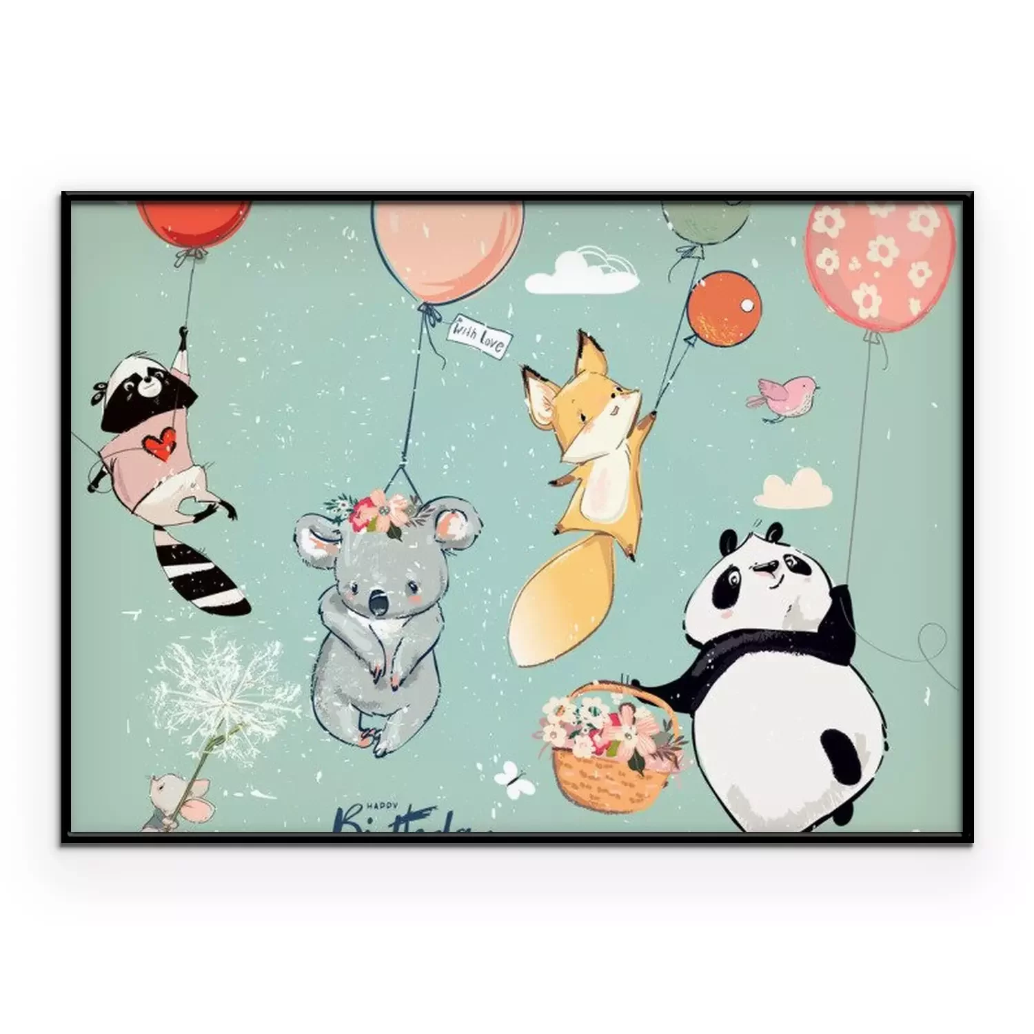 Poster Dieren opgehangen aan kleurrijke ballonnen