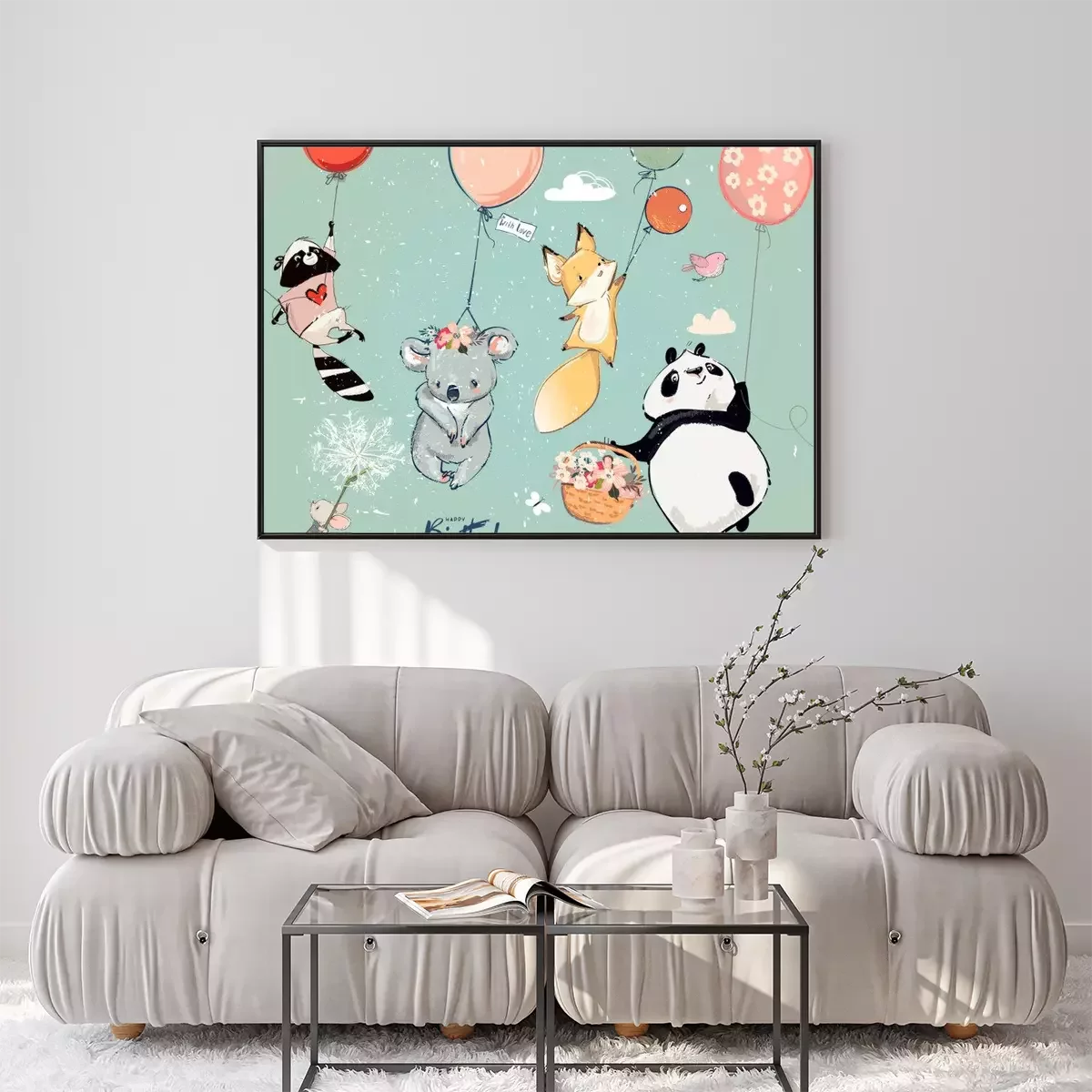 Poster: Dieren opgehangen aan kleurrijke ballonnen
