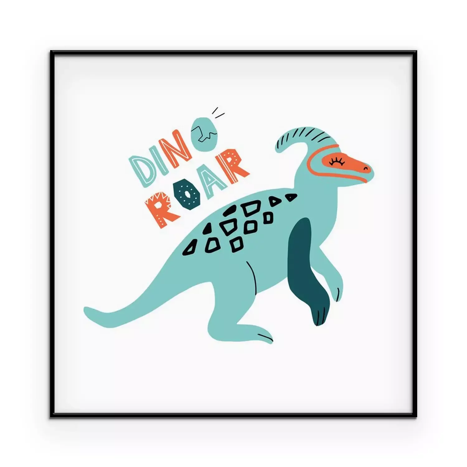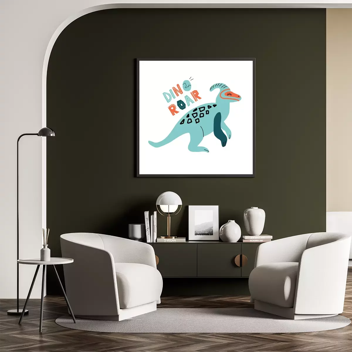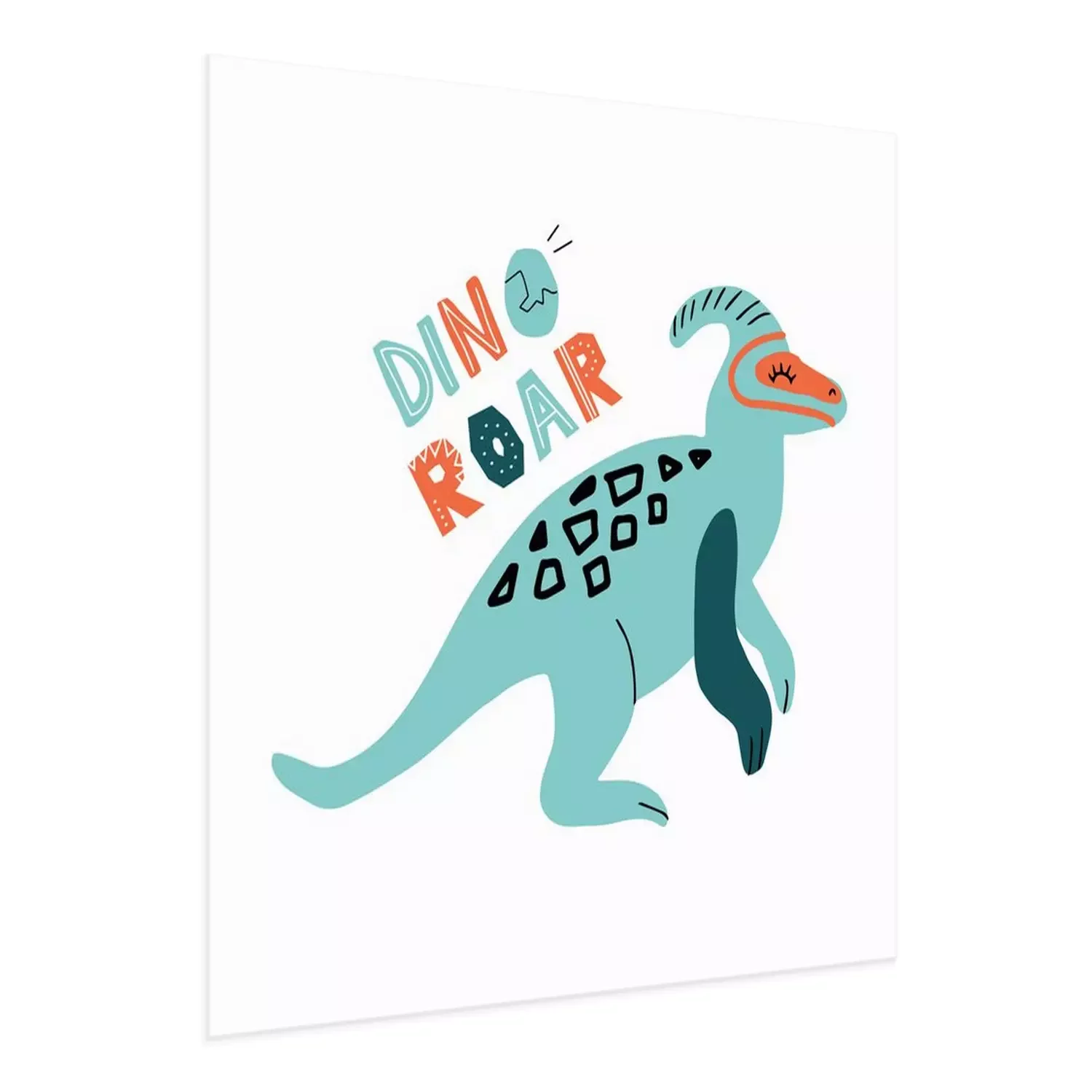 Poster: Dino parasaurolophus color flat hand drawn character. Cute childish dinosaur with lettering quote Dino roar. Sketch with decor.Isolated cartoon illustration for kid game, book, t-shirt, textile
