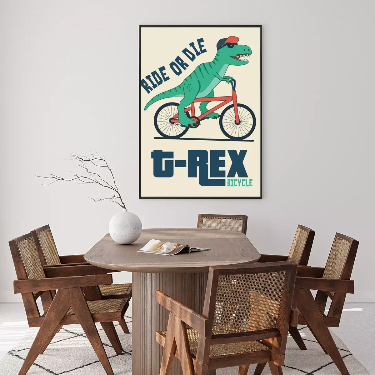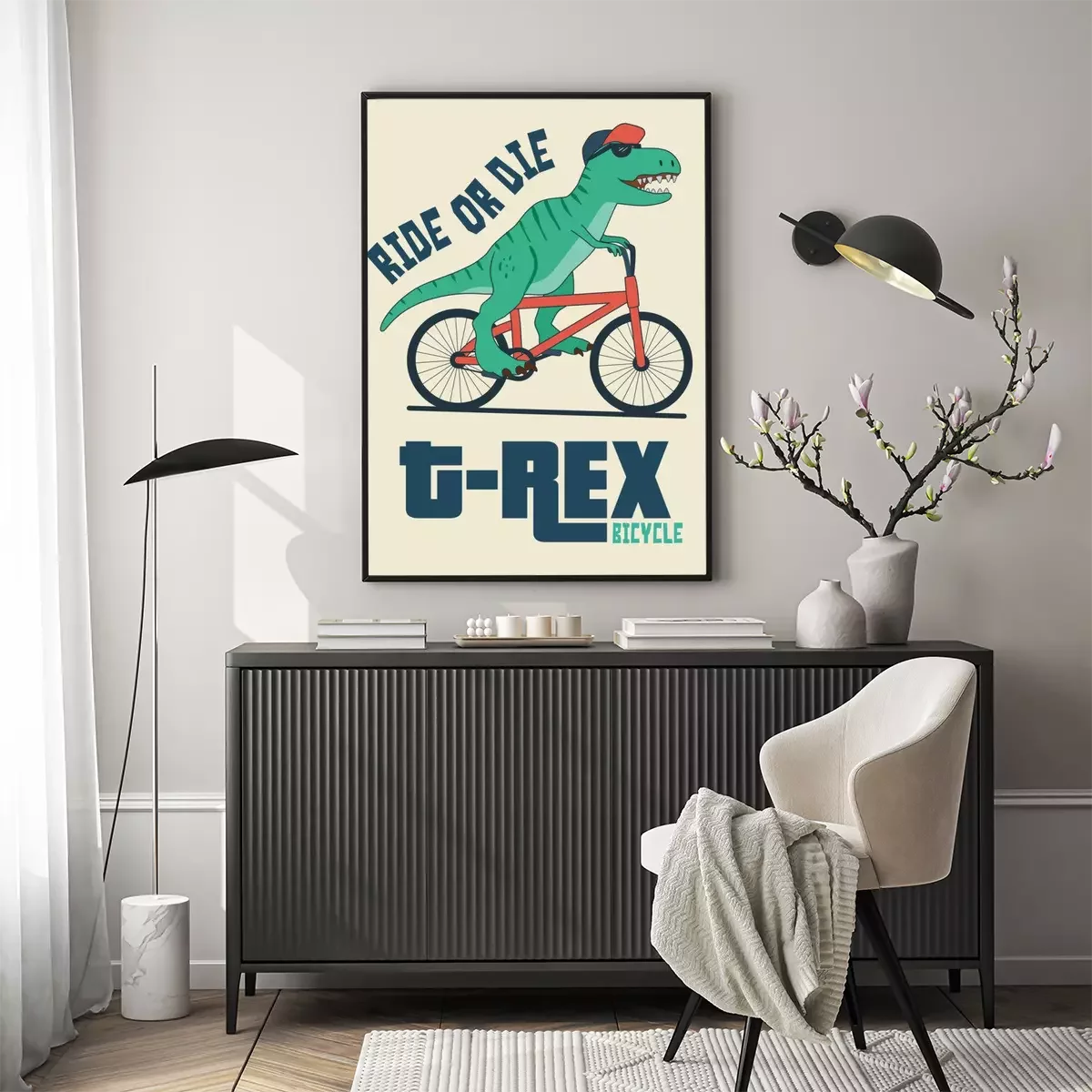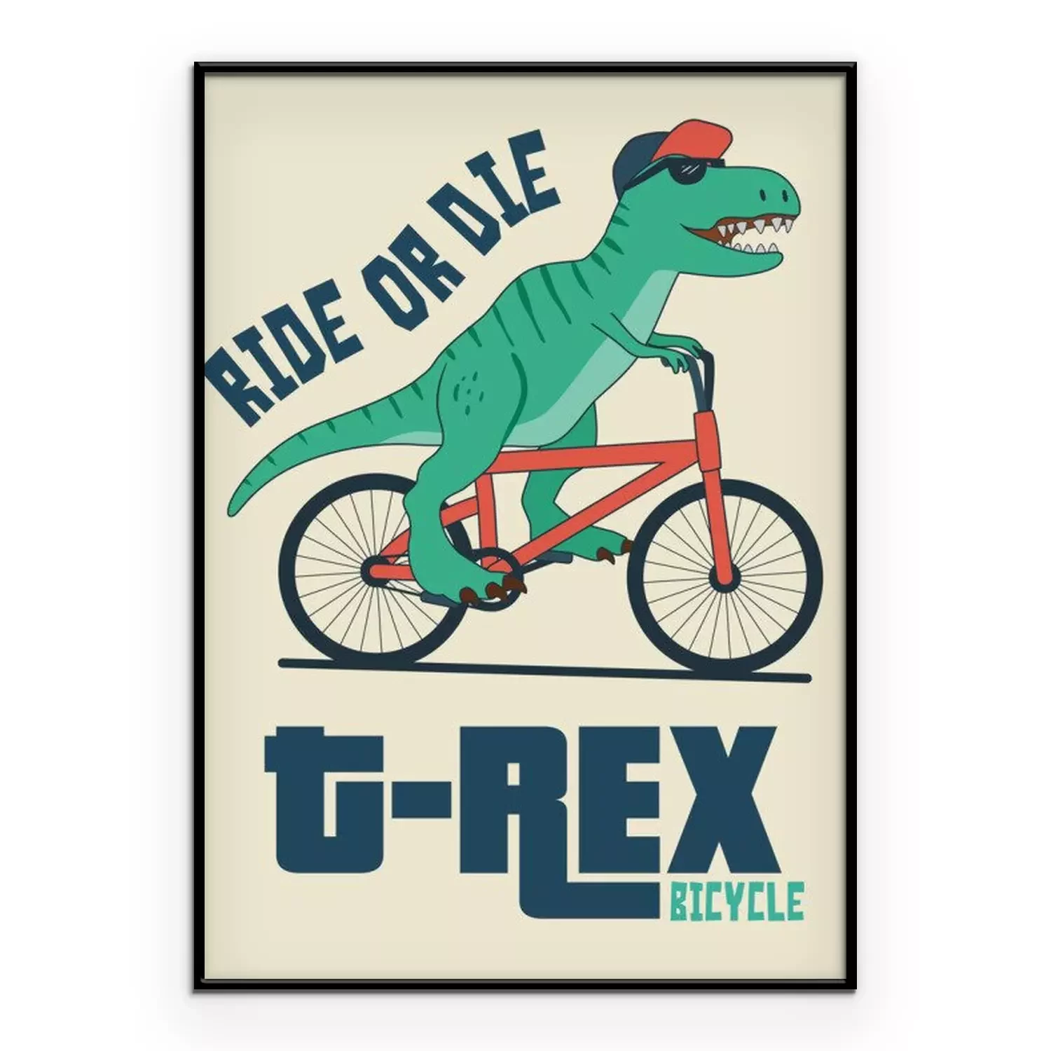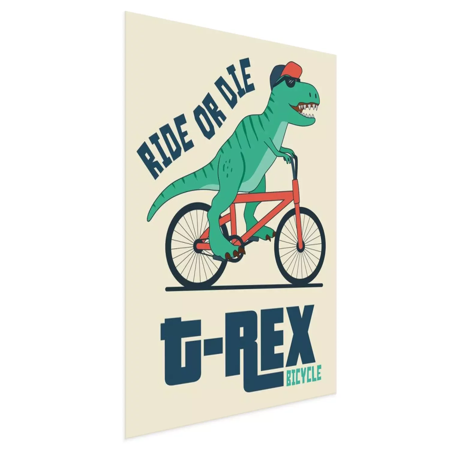 Poster: Dinosaurus in zwarte bril op een rode fiets