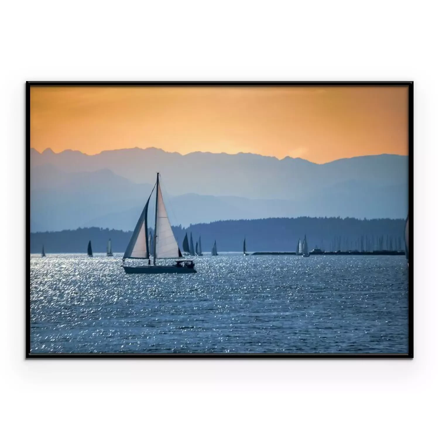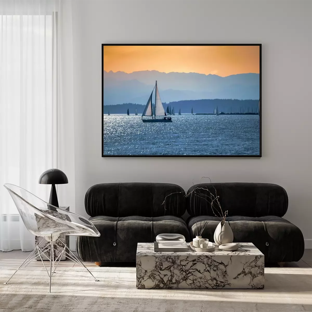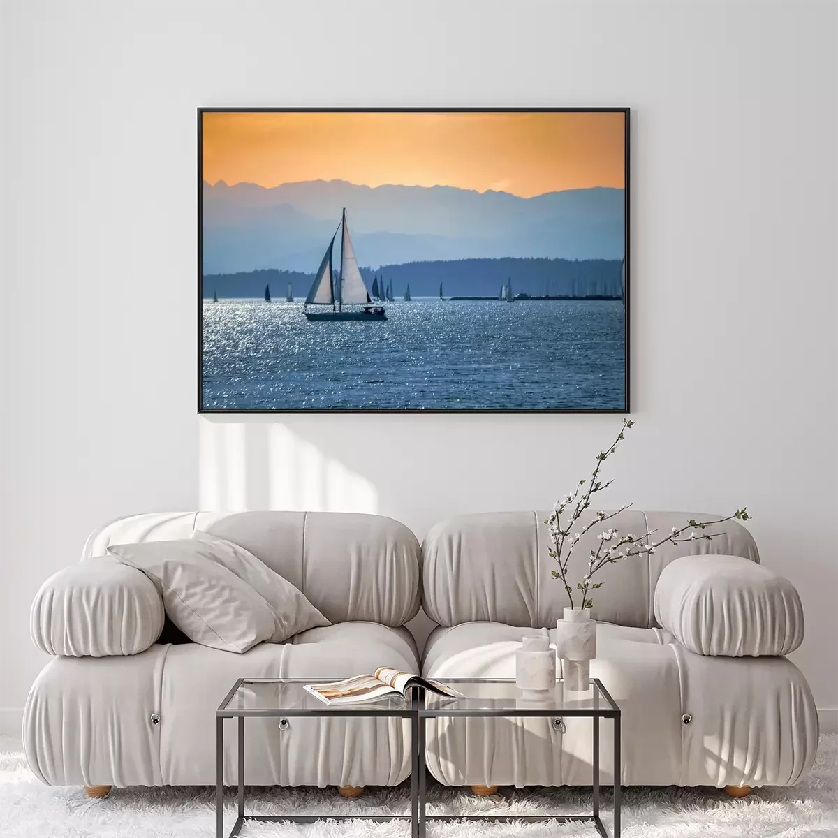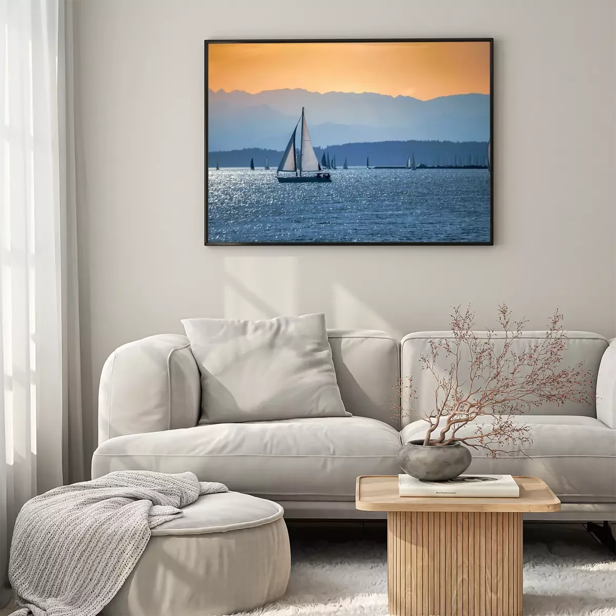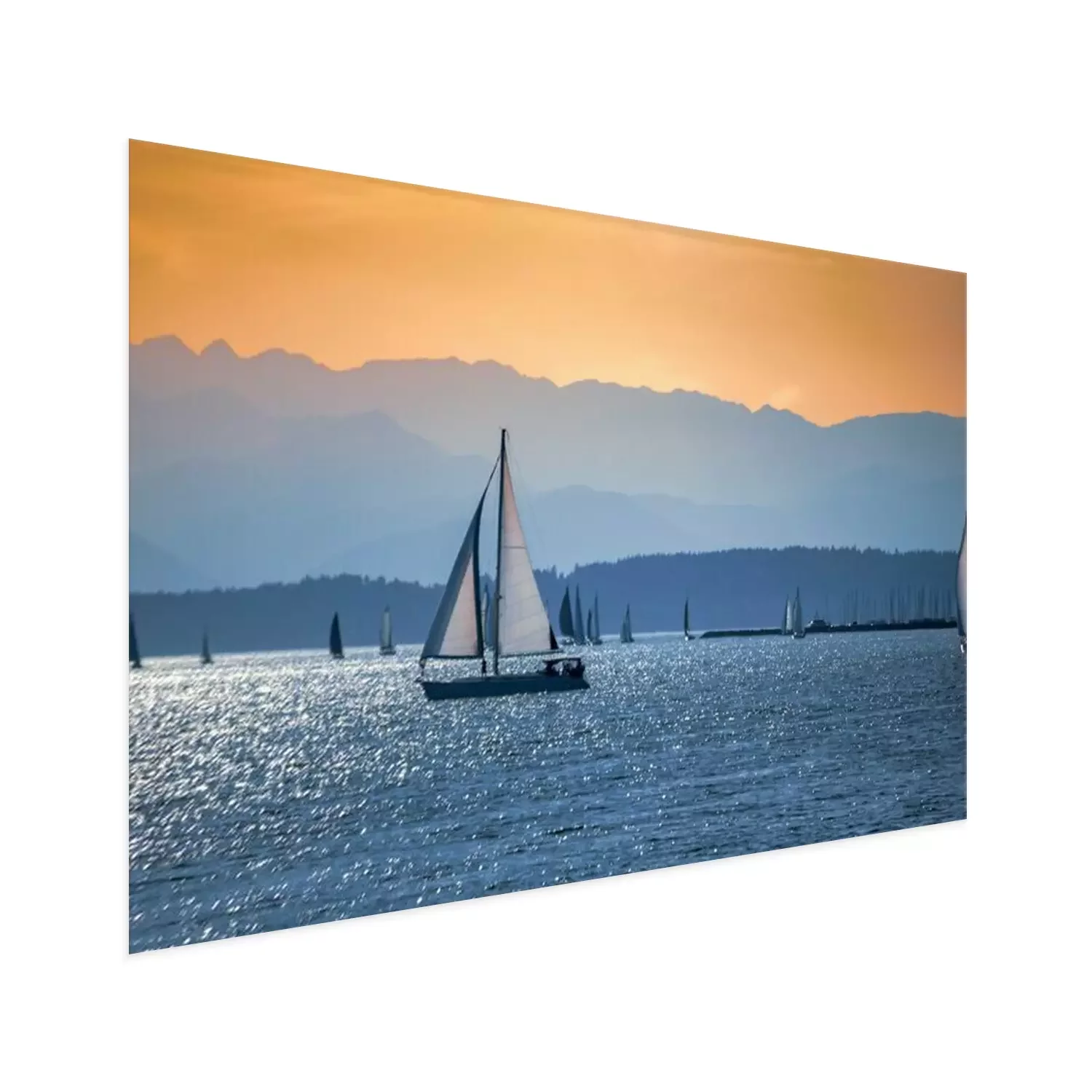 Poster Distant sailboats on the Salish sea with Olympic Mountains at sunset.
