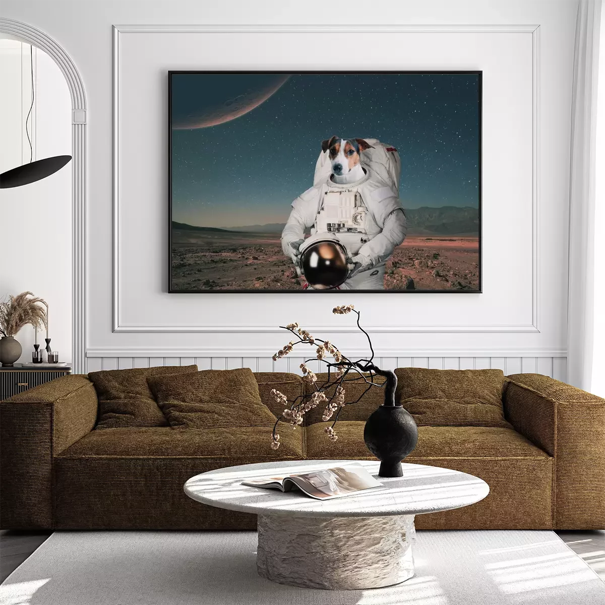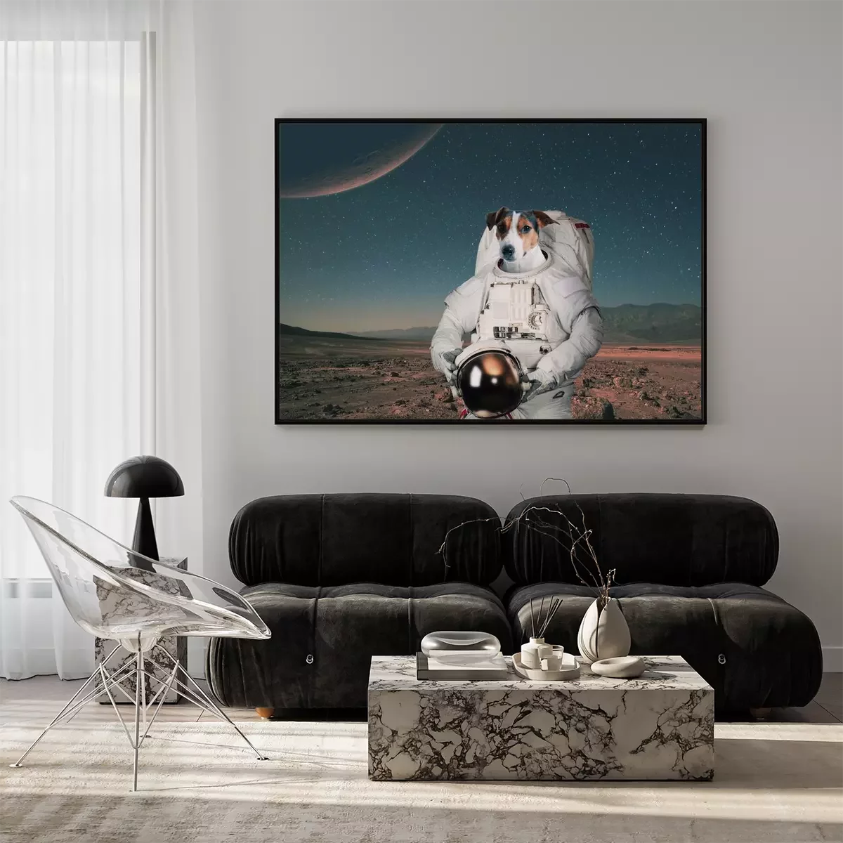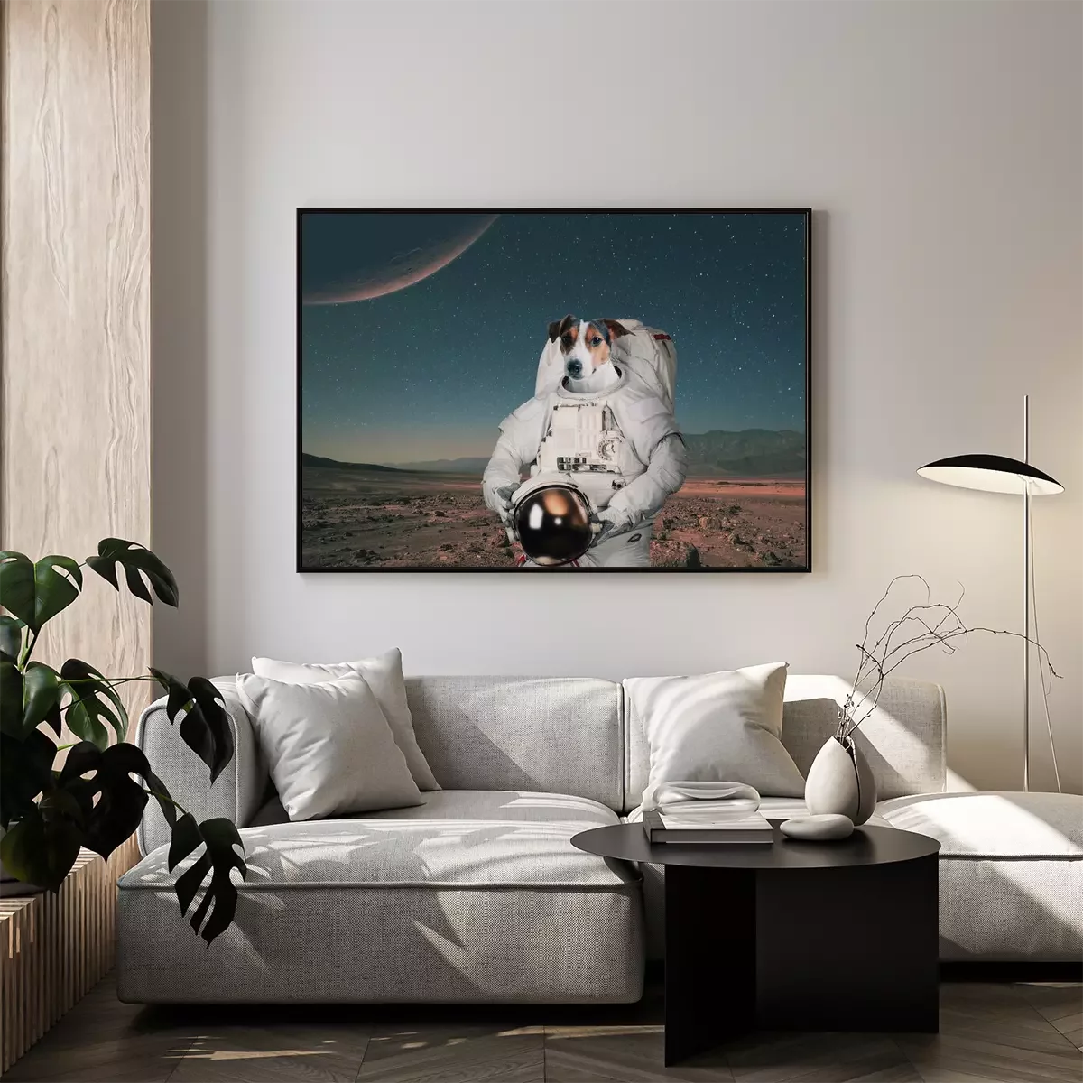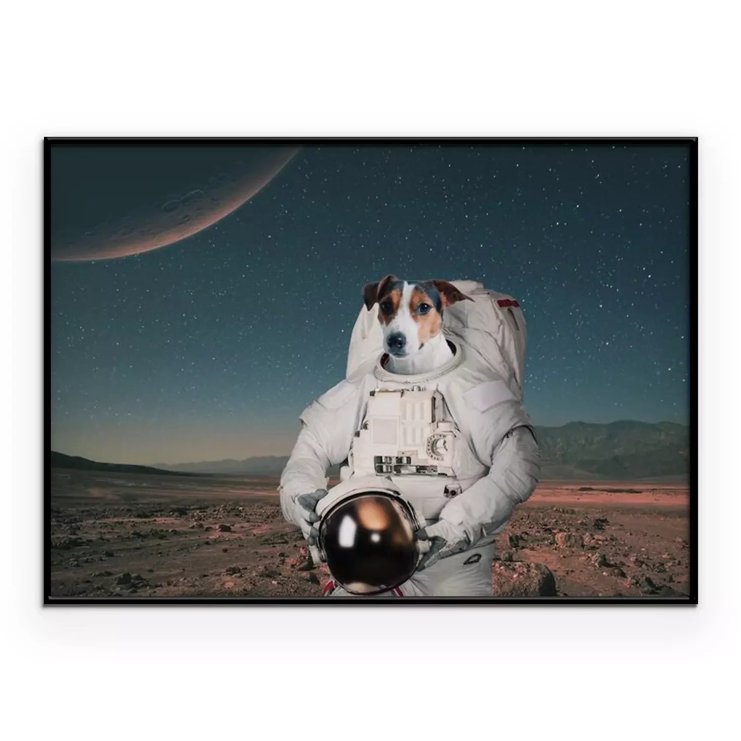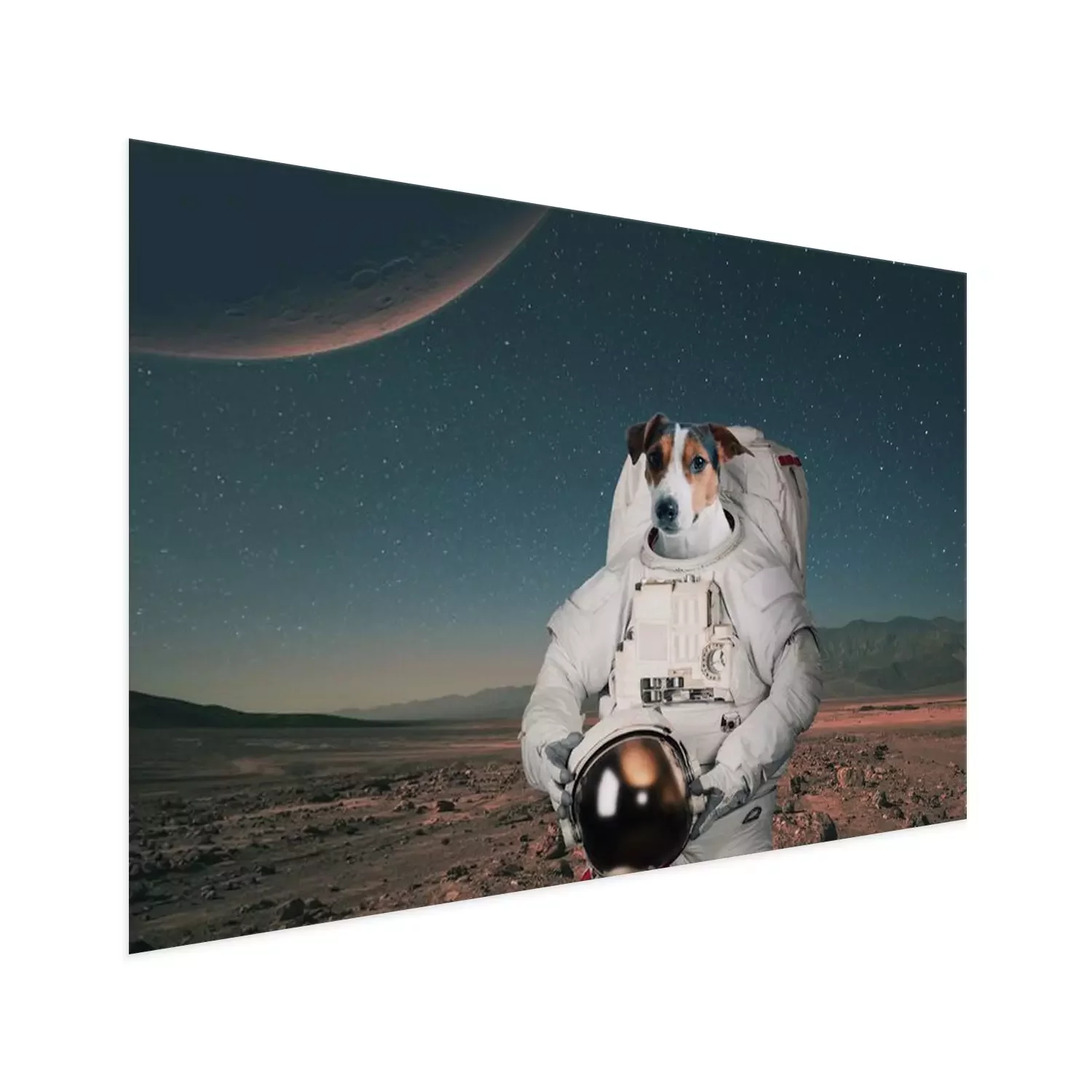 Poster Dog astronaut in a space suit with a helmet travels on Mars. Spaceman animal on a red planet. Space journey concept