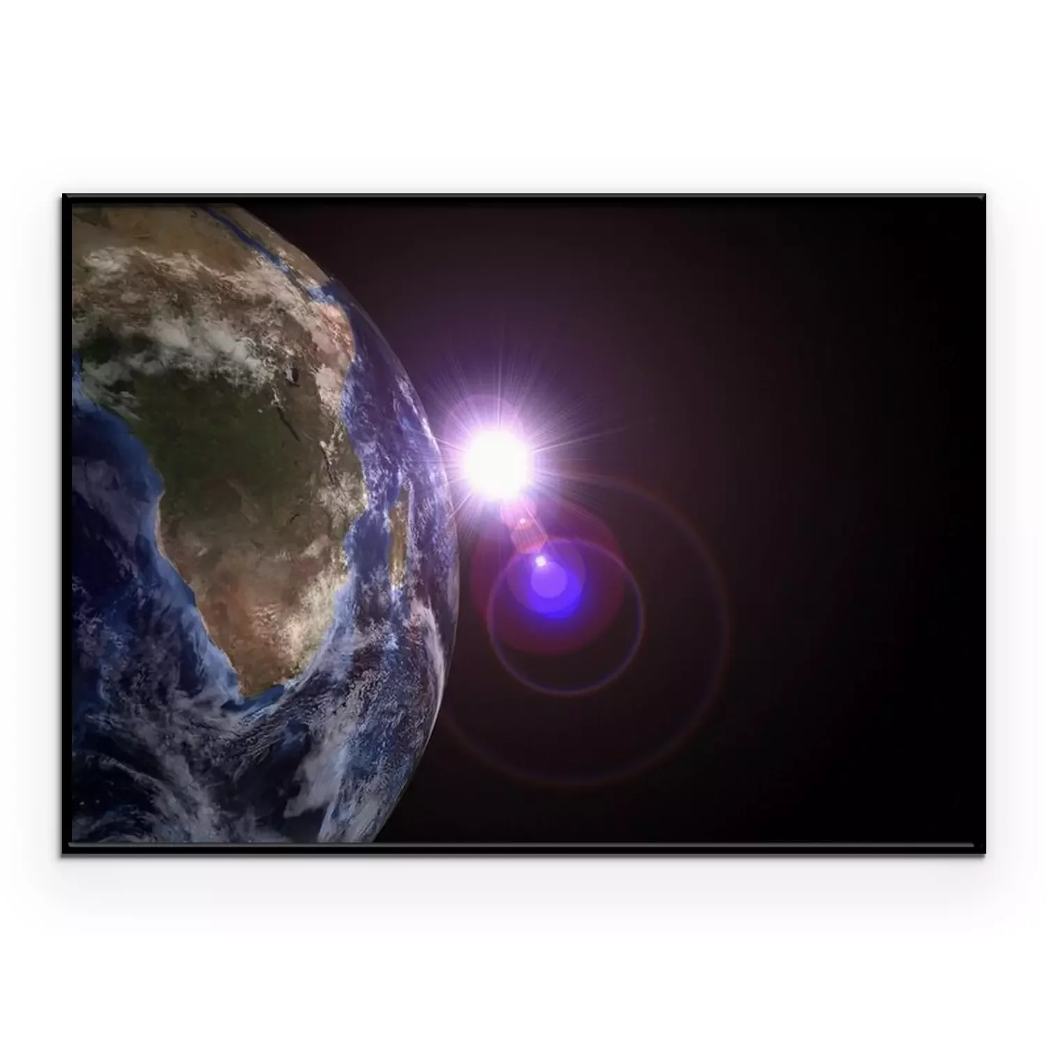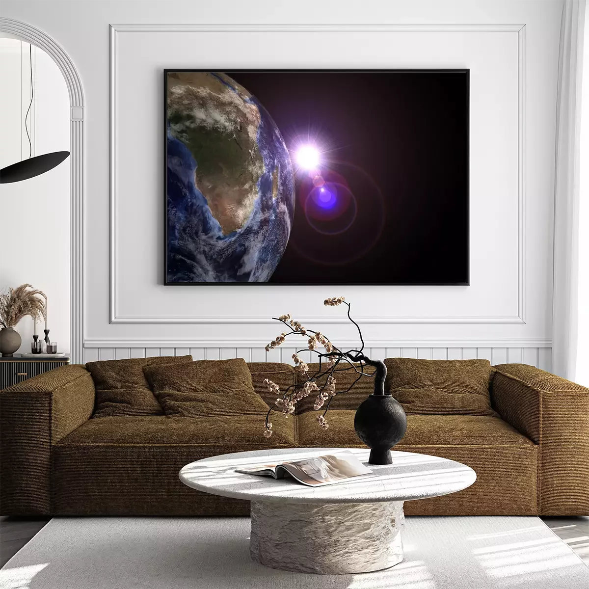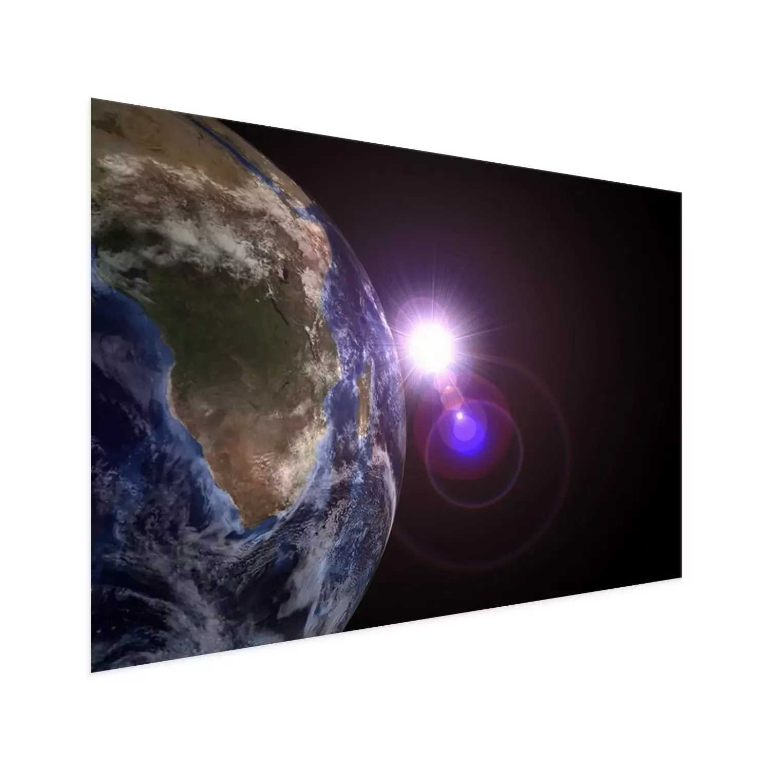Poster: Donkere kosmos en de aarde verlicht door de zon
