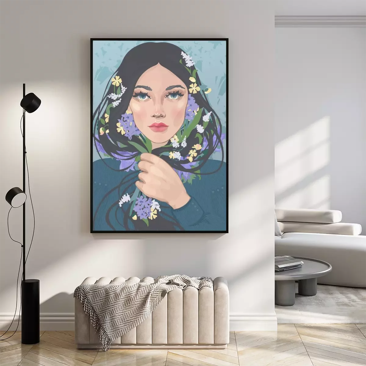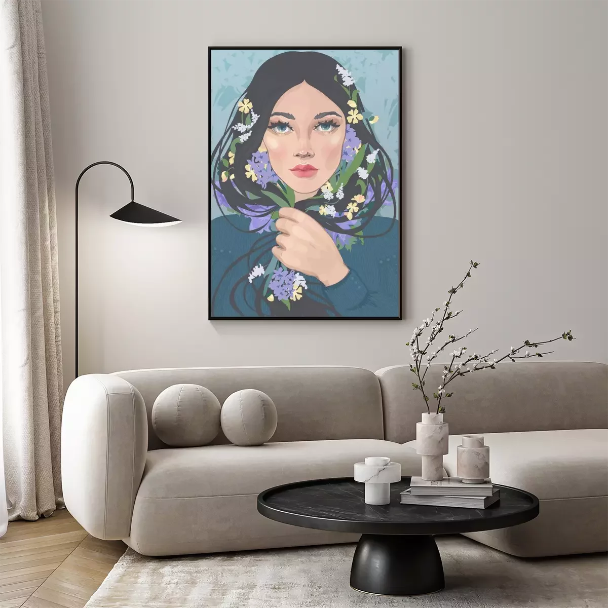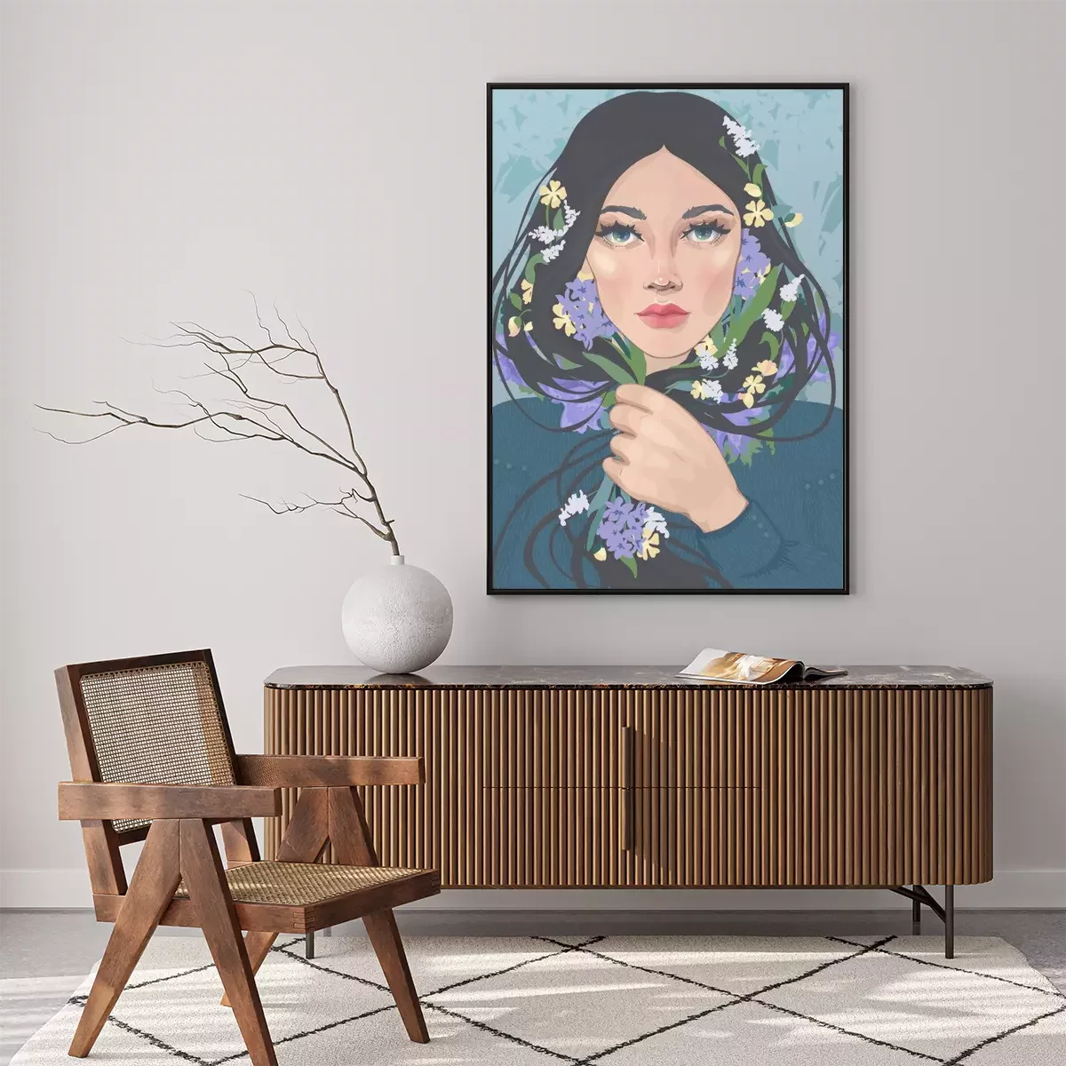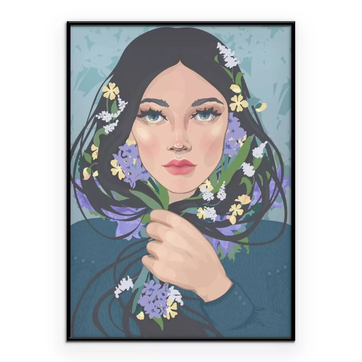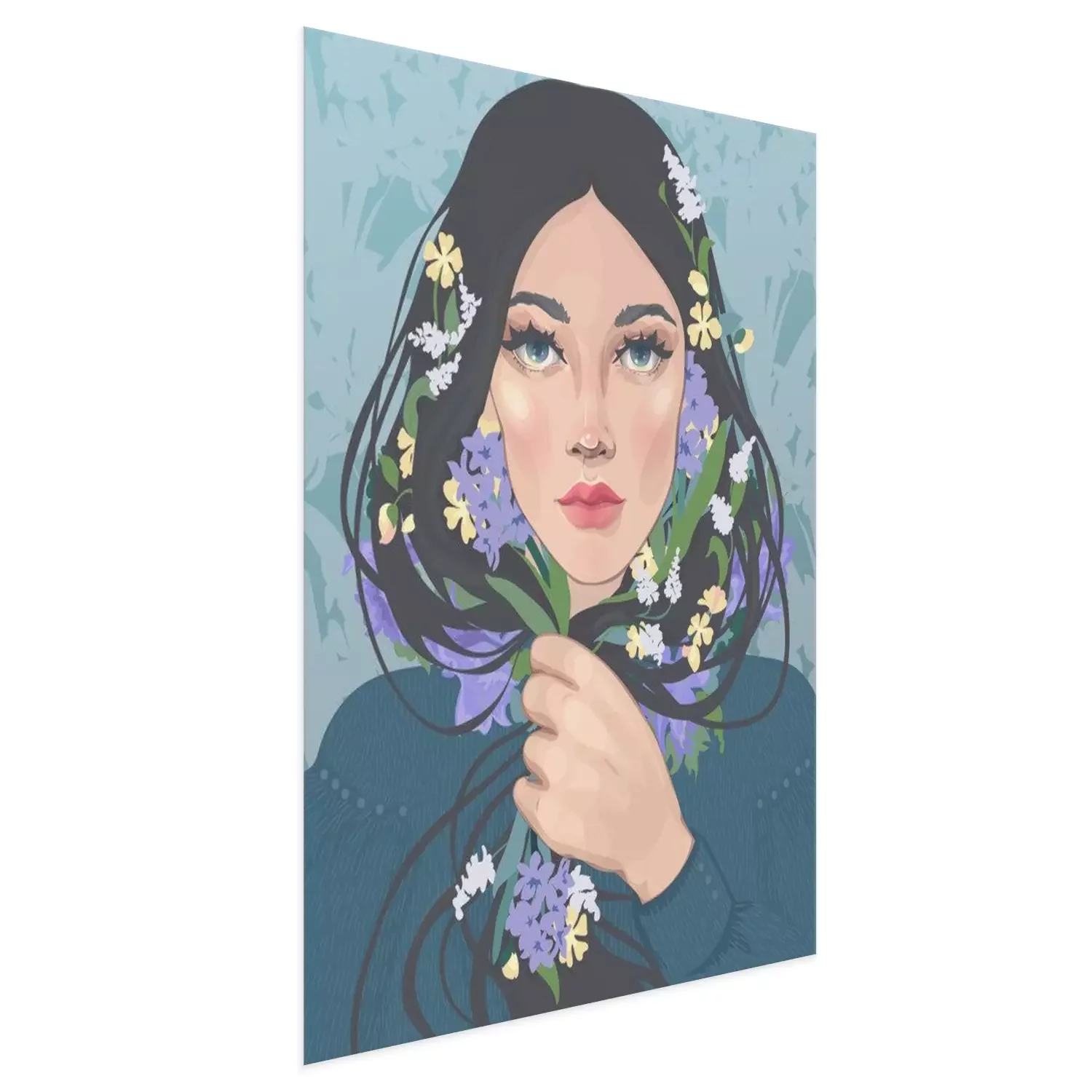 Poster: Donkerharige vrouw met kleurrijke bloemen in haar haar