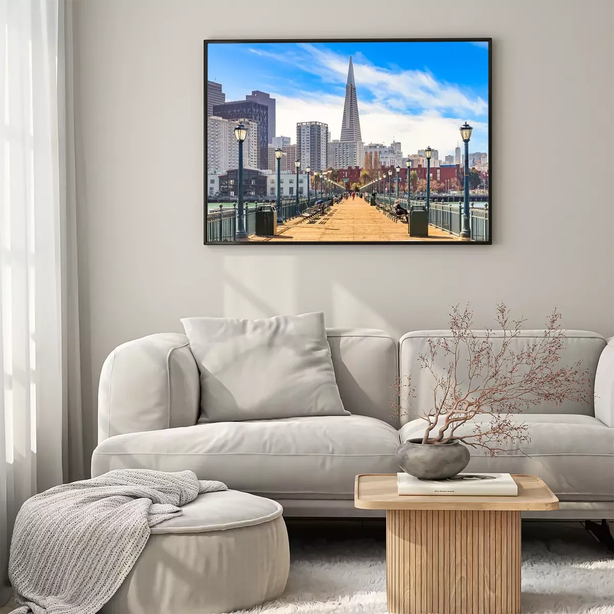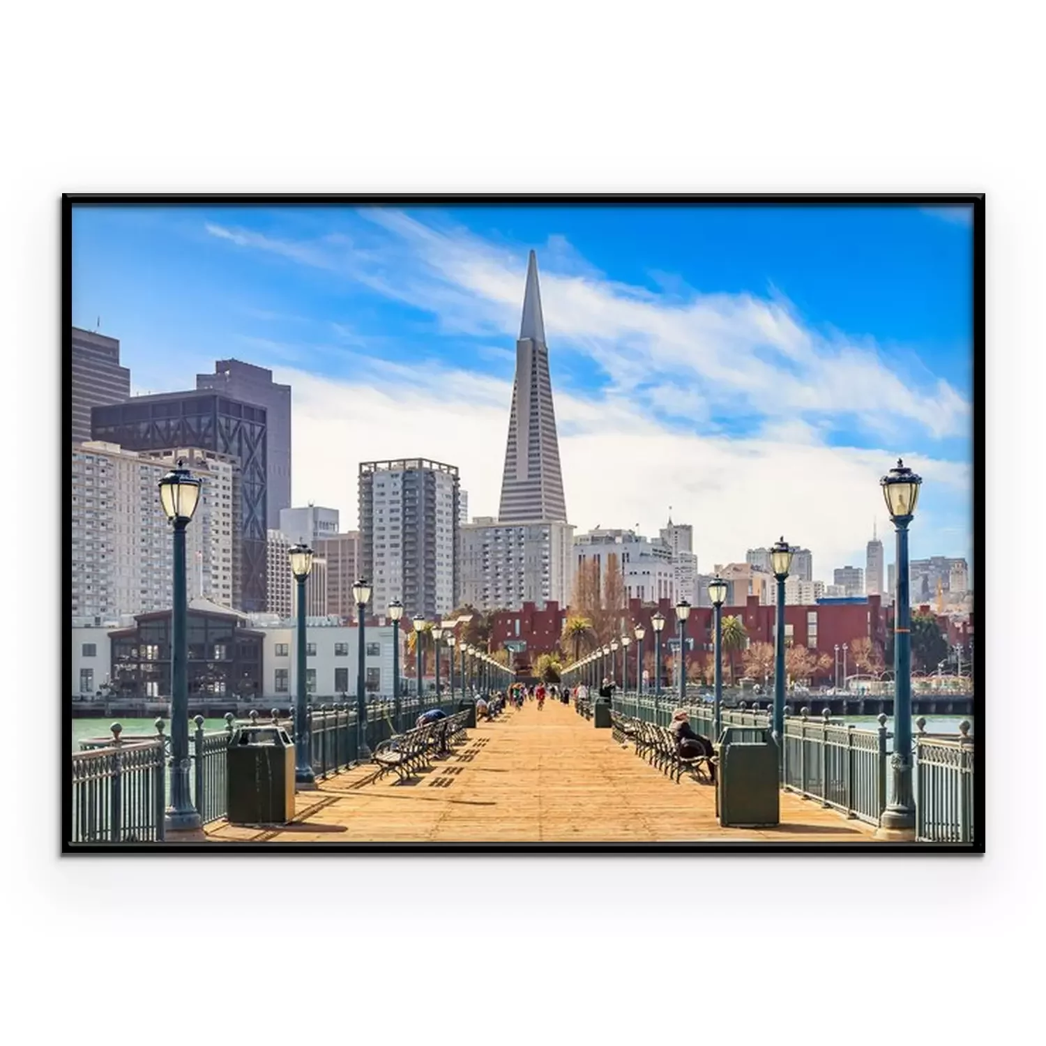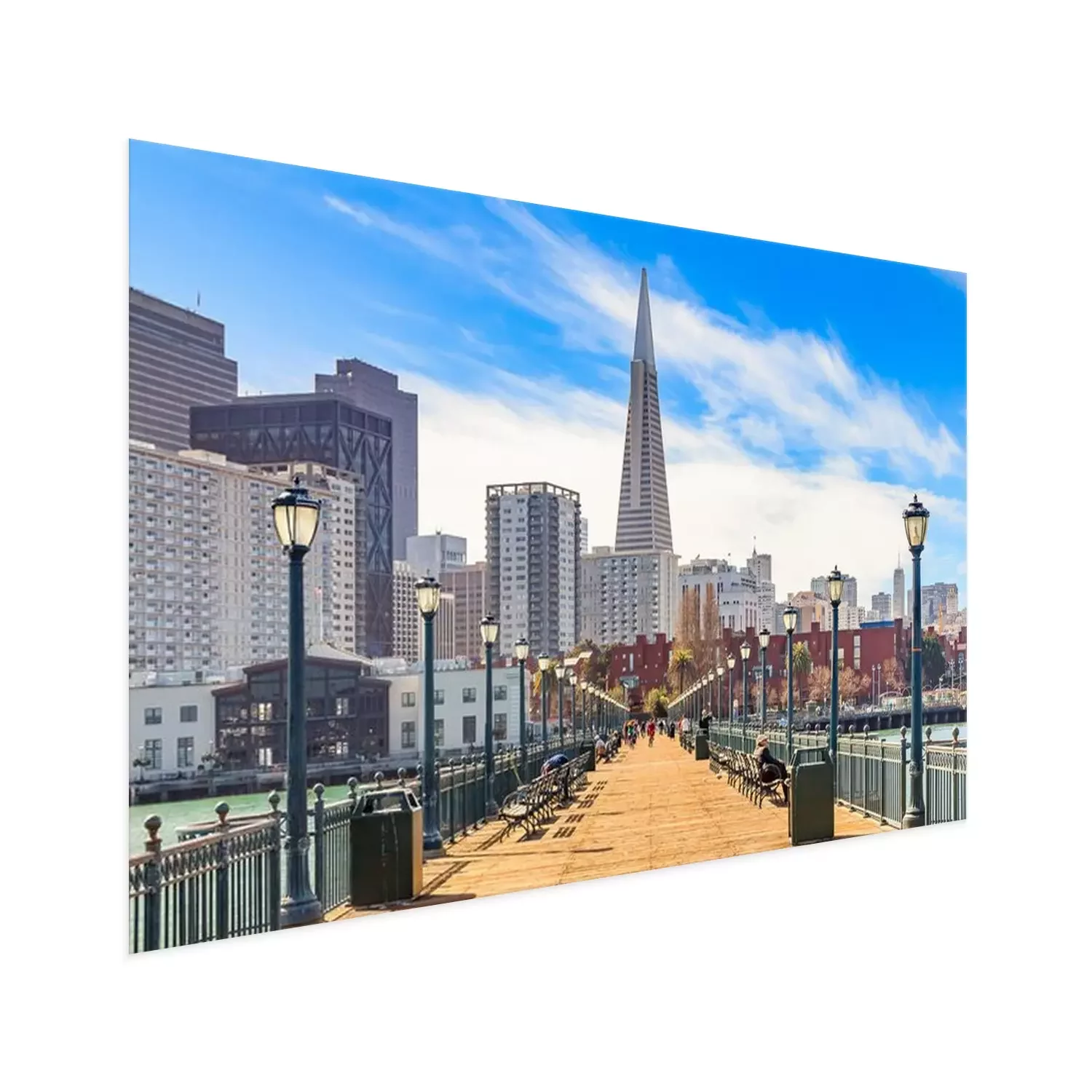 Poster: Downton San Francisco en de Transamerica Piramide van houten Pier 7 op een mistige dag