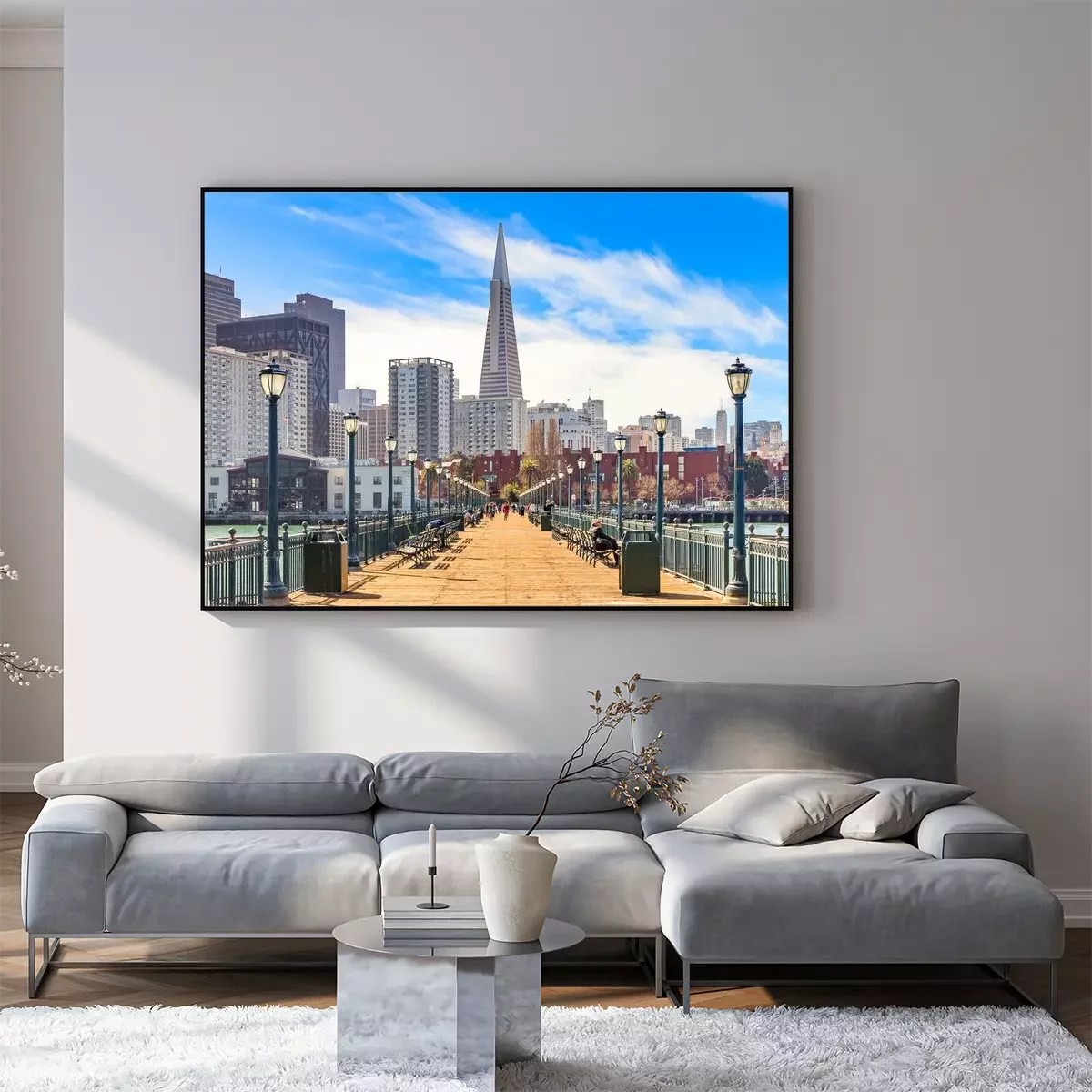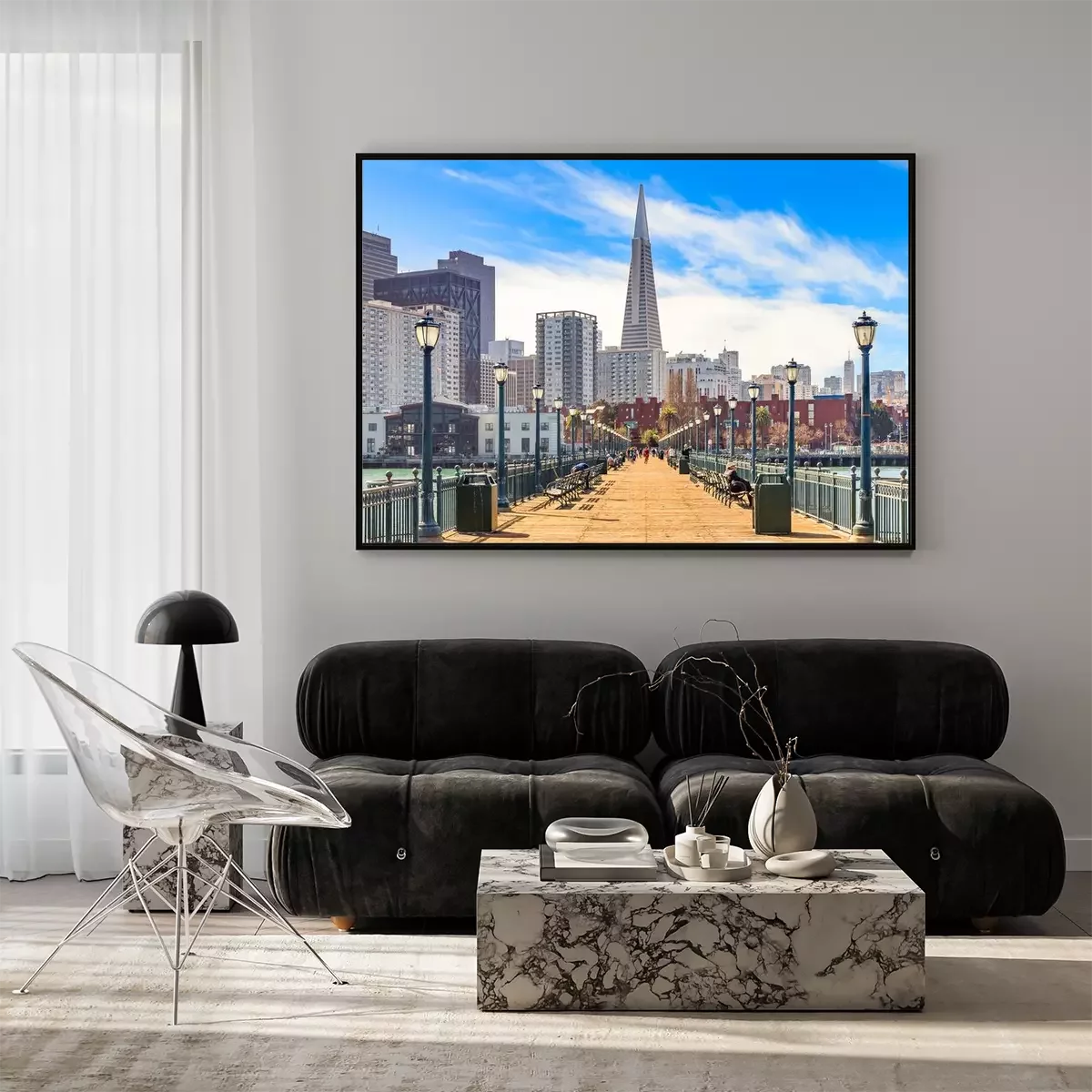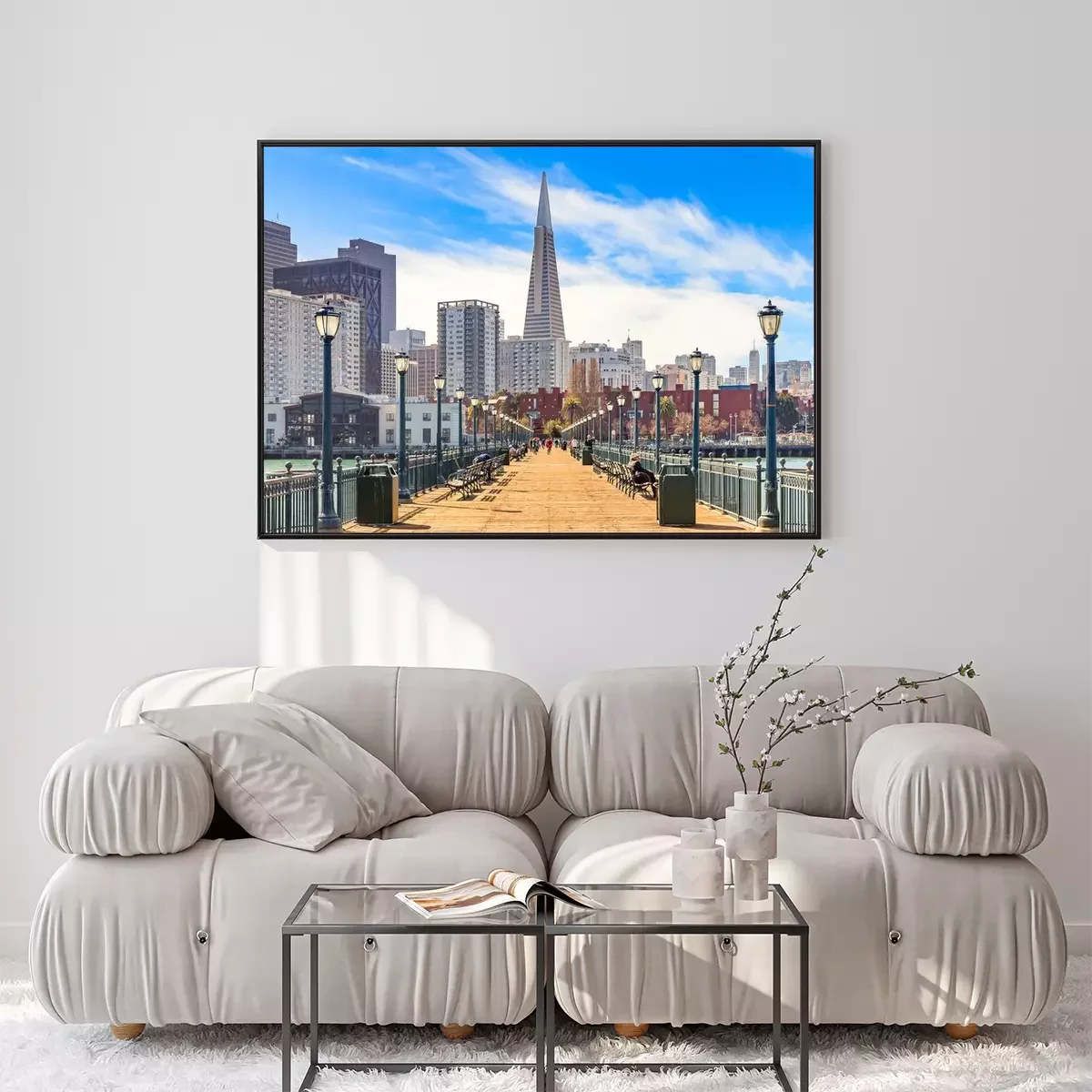 Poster: Downton San Francisco en de Transamerica Piramide van houten Pier 7 op een mistige dag