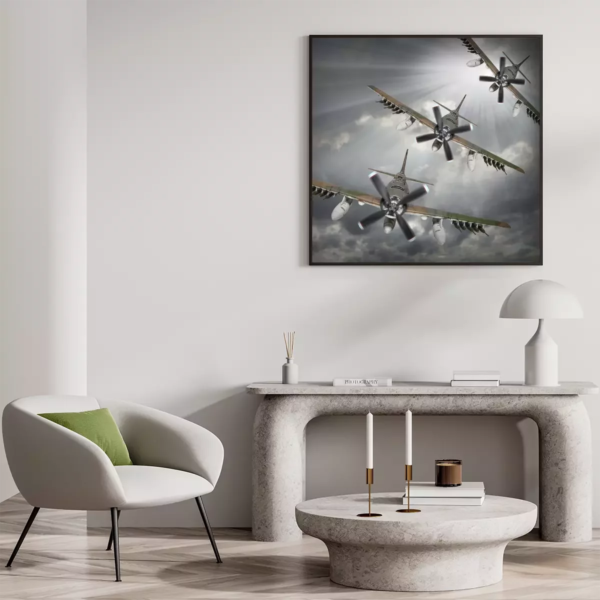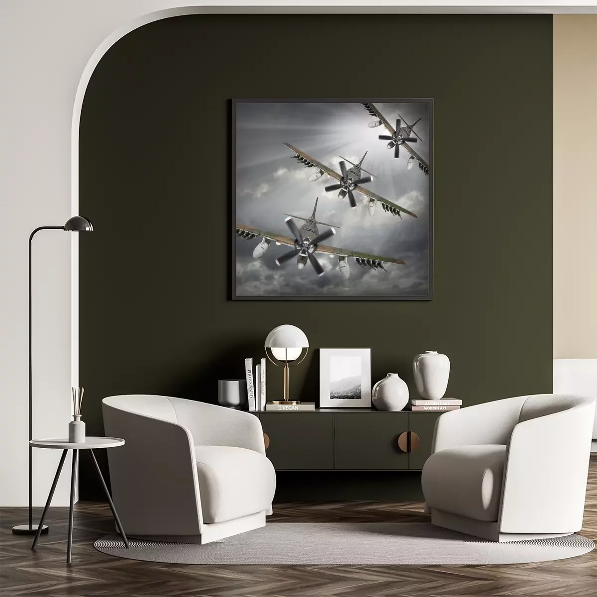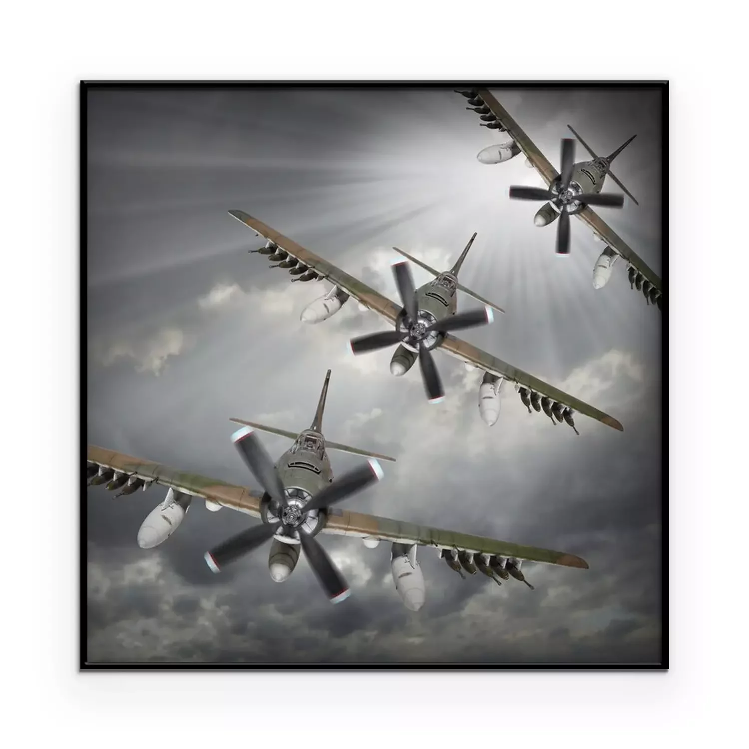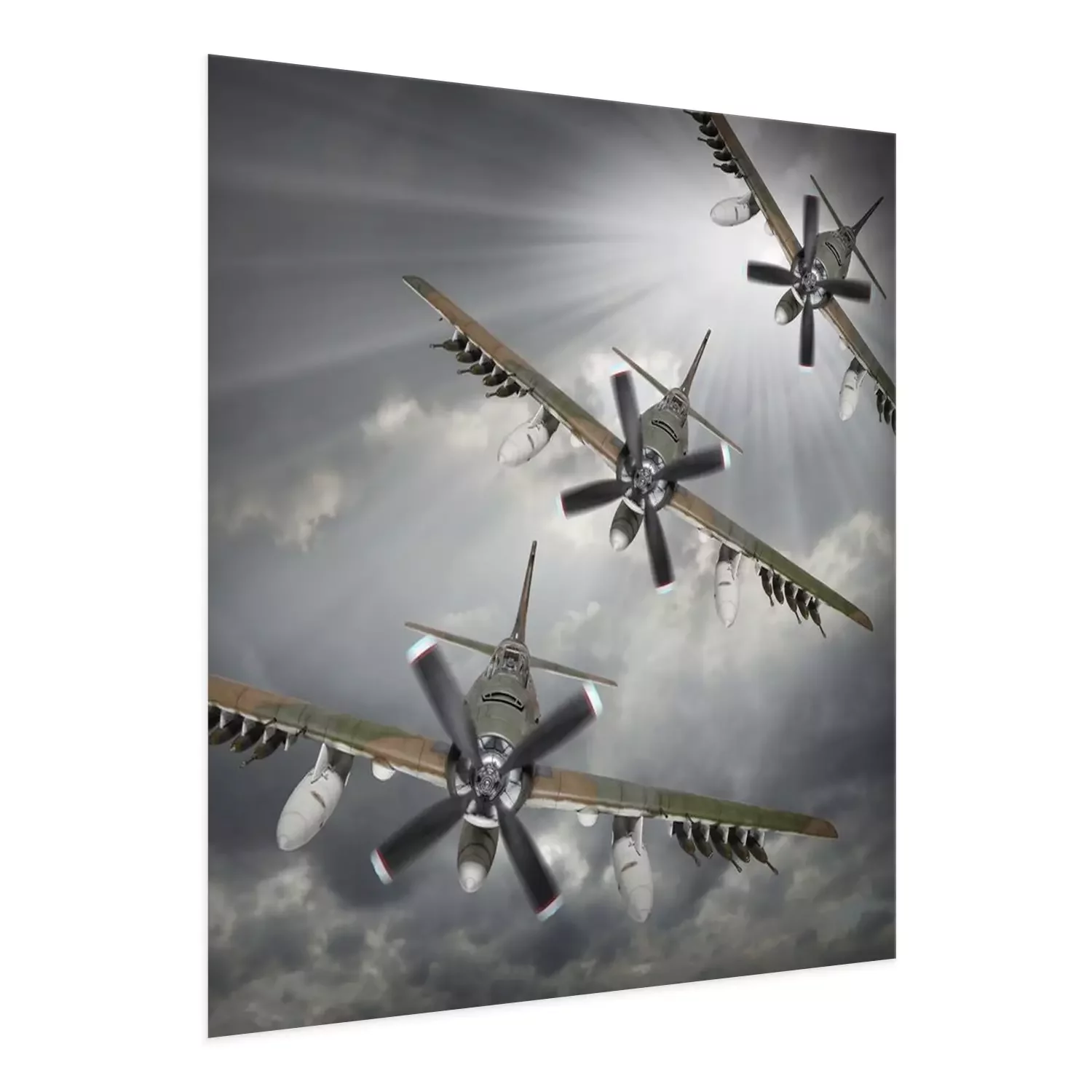 Poster: Dramatische scène op de hemel. Oude bommenwerpers inbound uit zon.