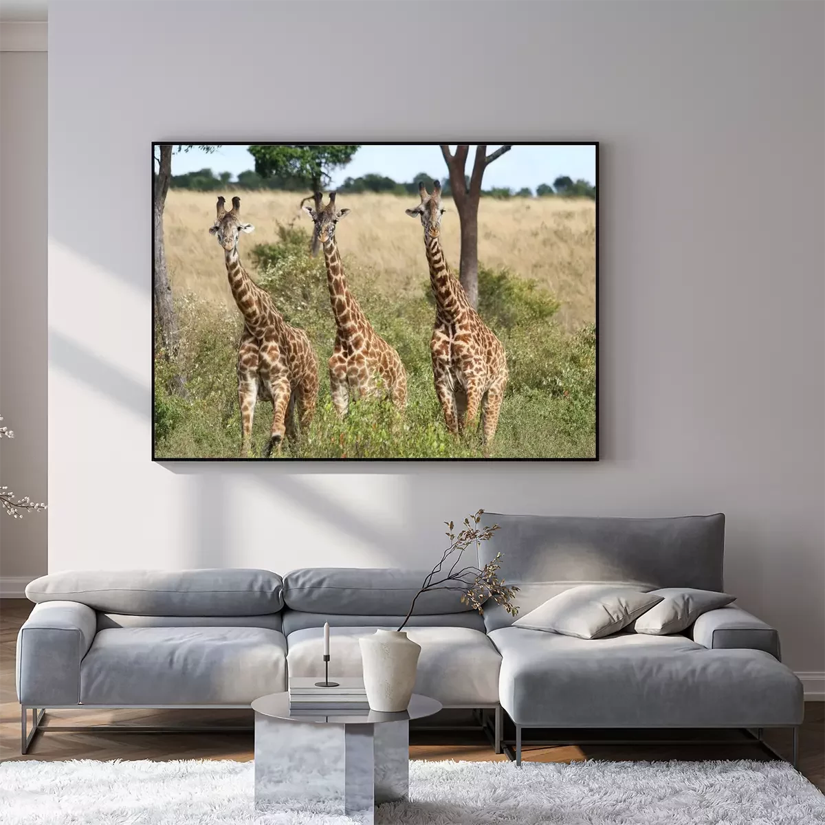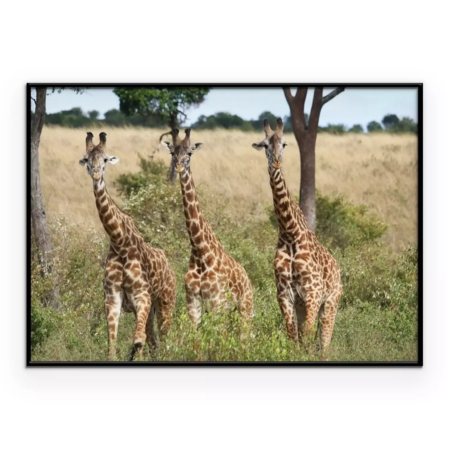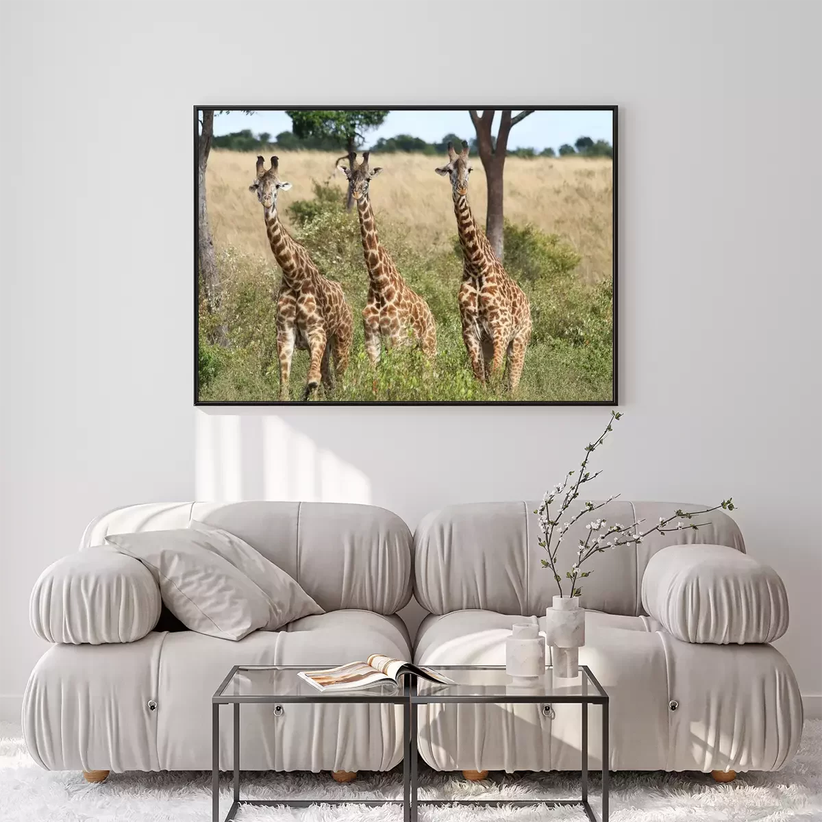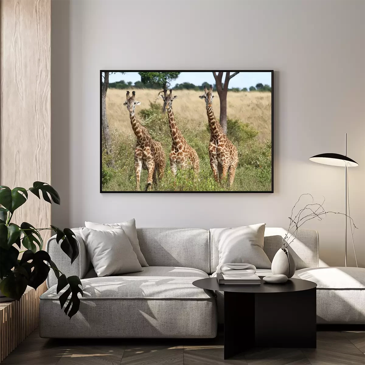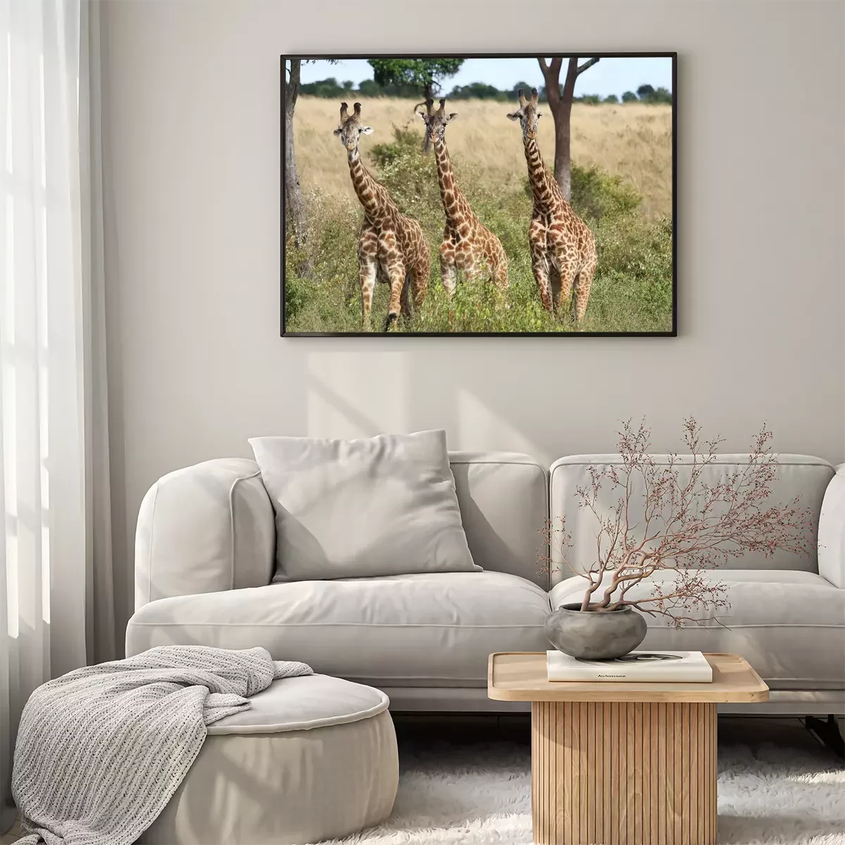 Poster Drie Giraffen Zich Dichtbij Een Struik