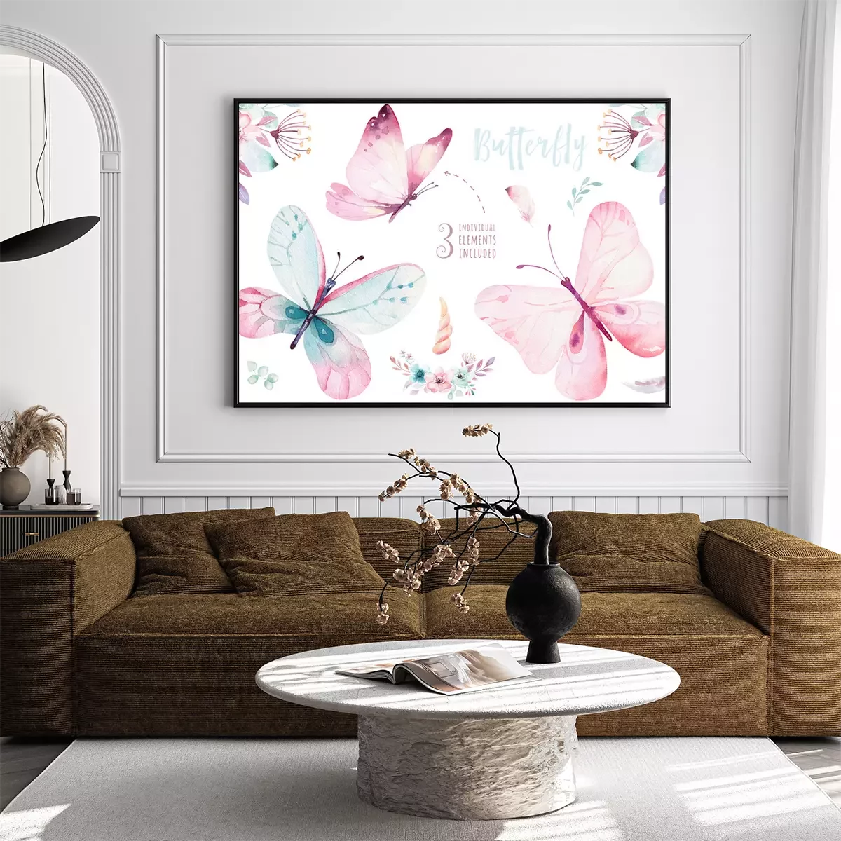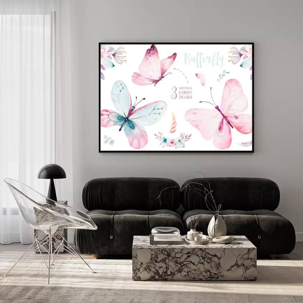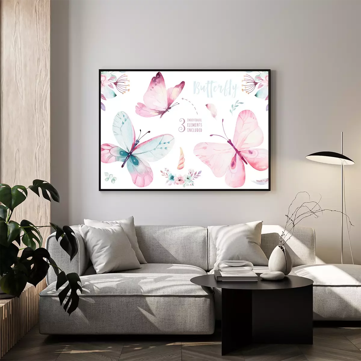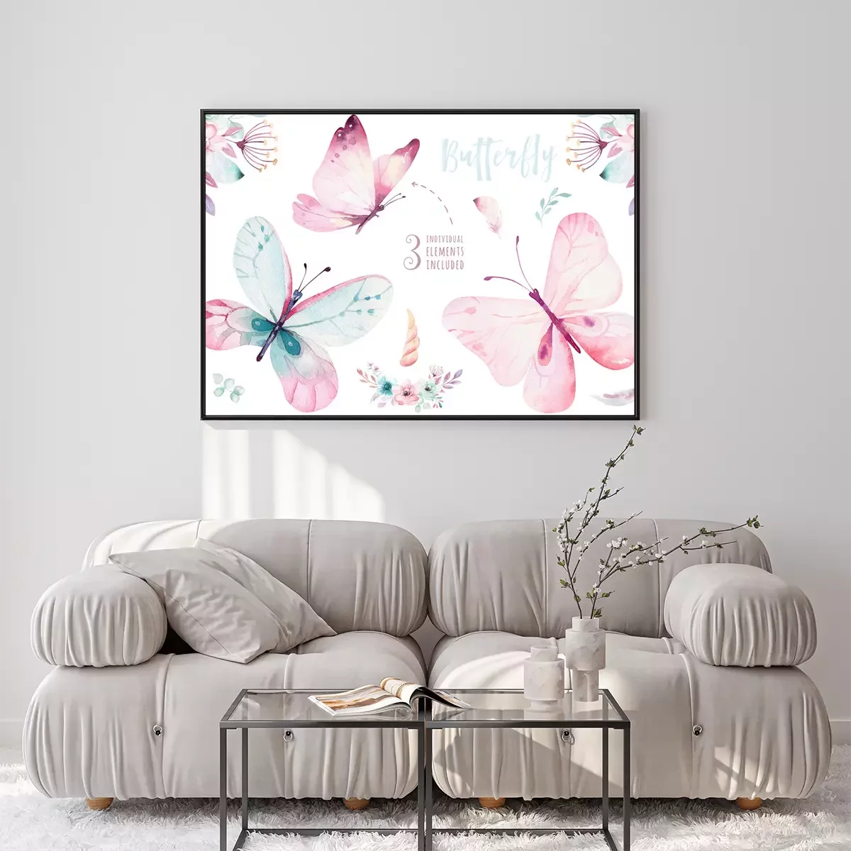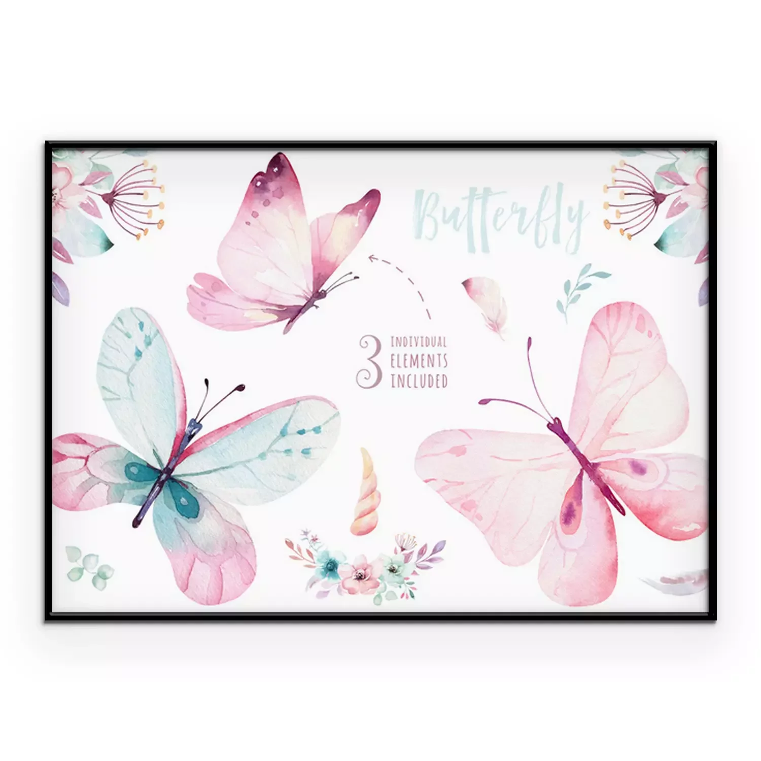 Poster: Drie pastelkleurige vlinders en bloemcomposities