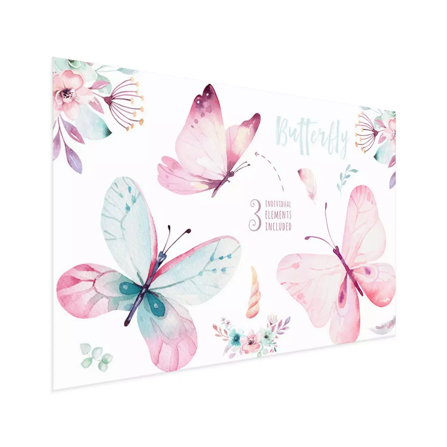 Poster Drie pastelkleurige vlinders en bloemcomposities
