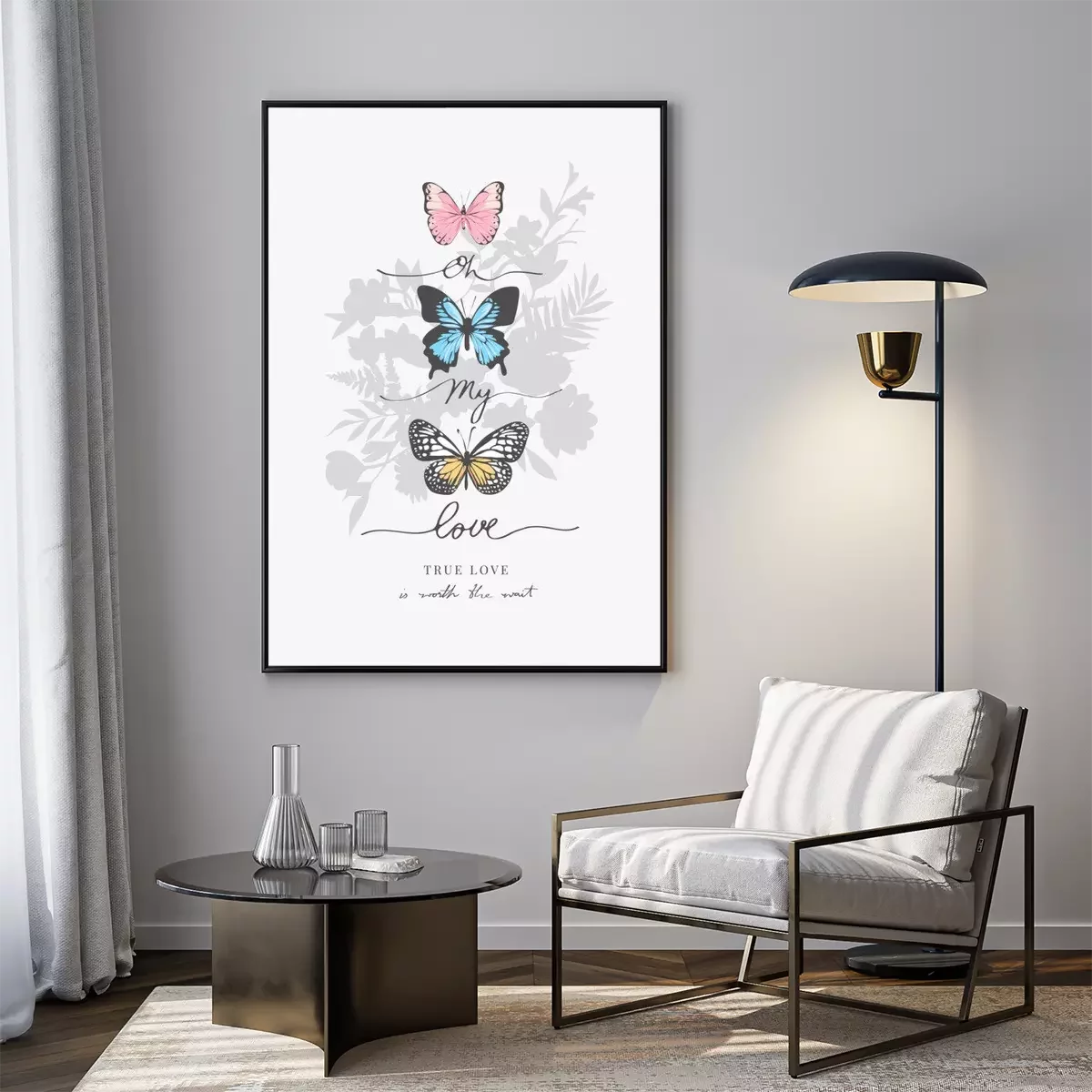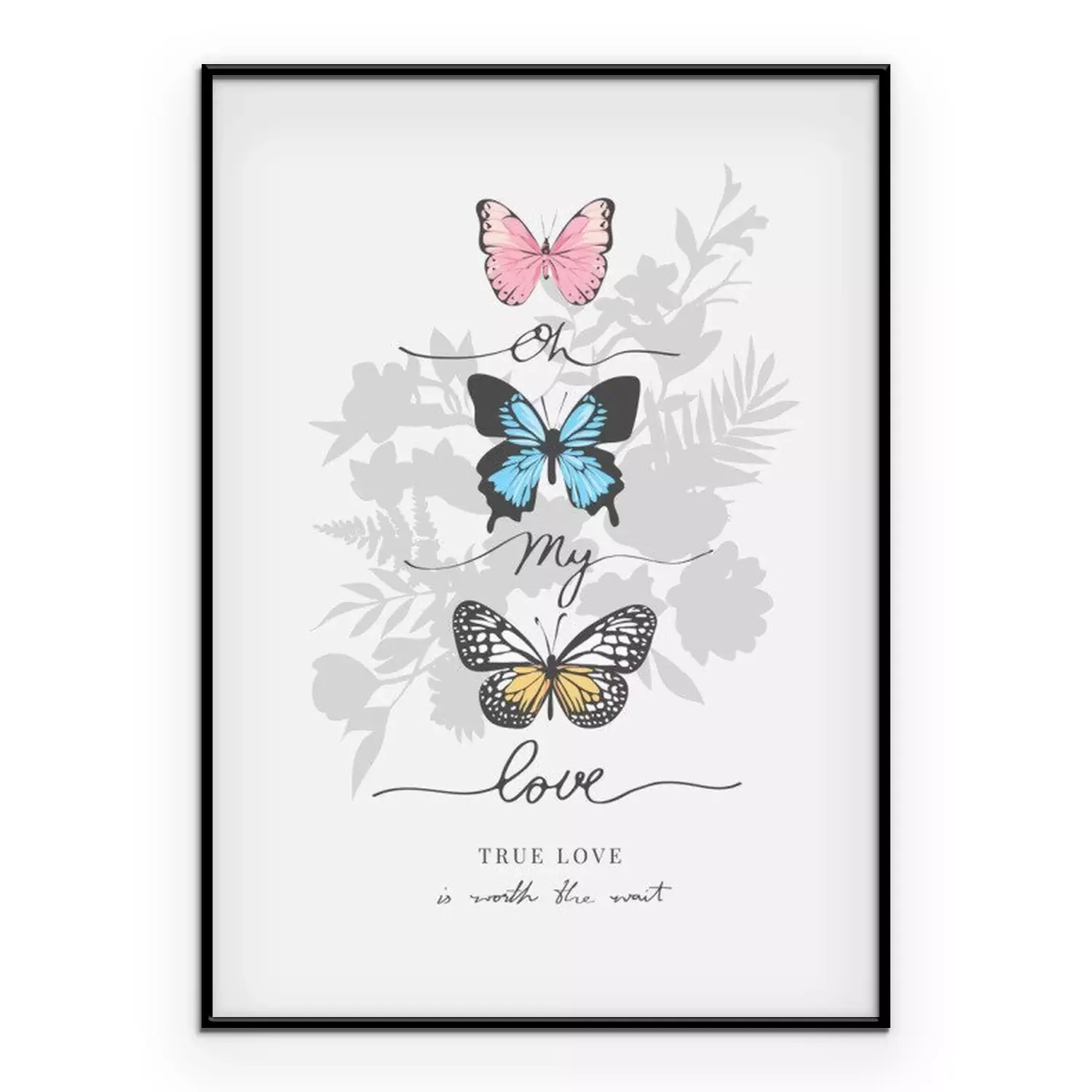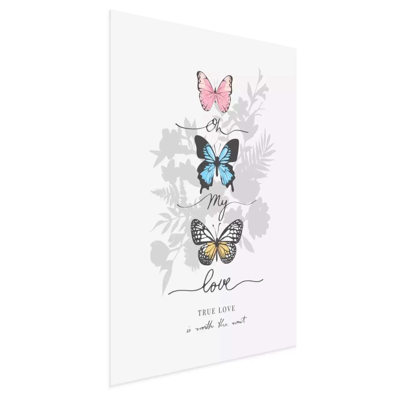 Poster: Drie vlinders en kalligrafische inscriptie