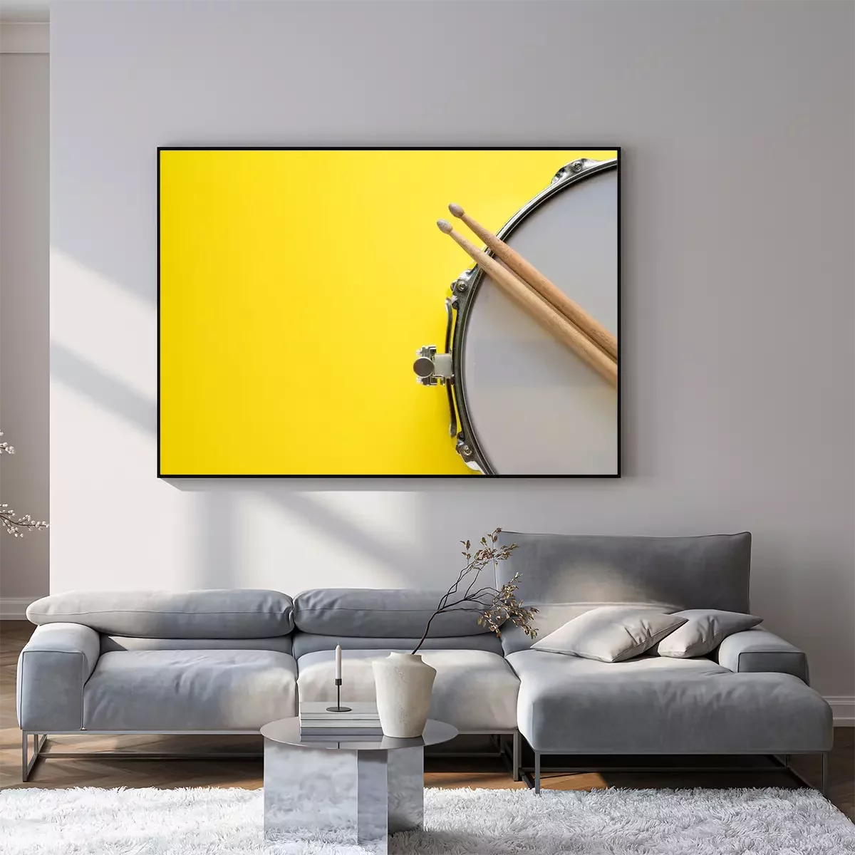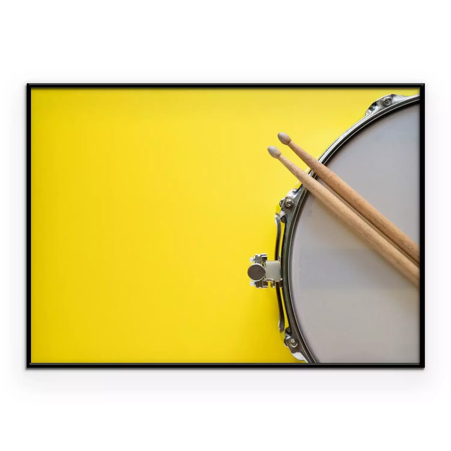Poster: Drum stick and drum on yellow table background, top view, music concept