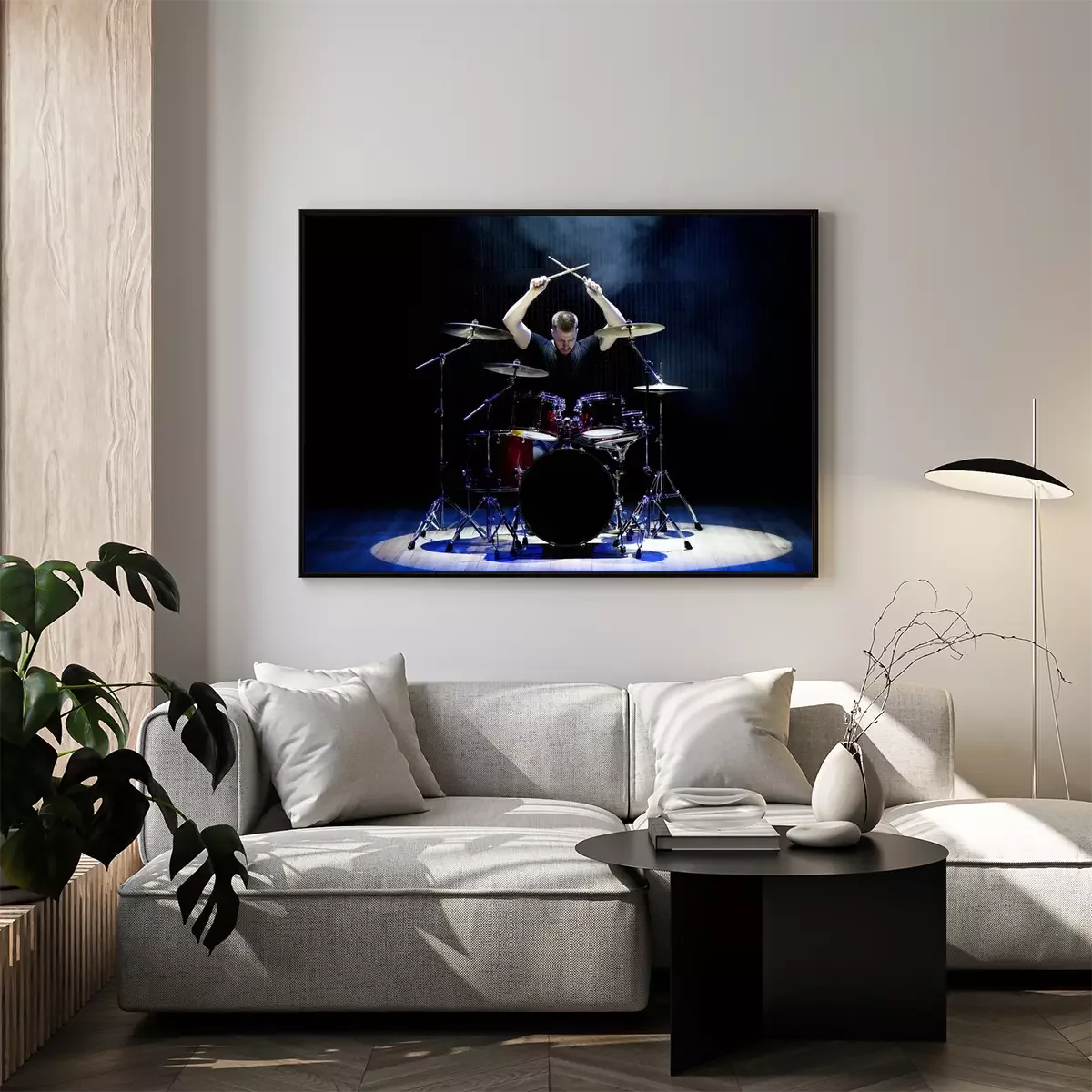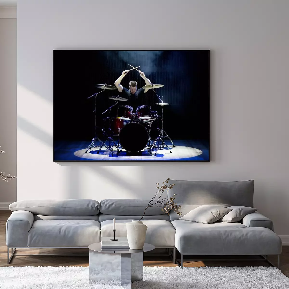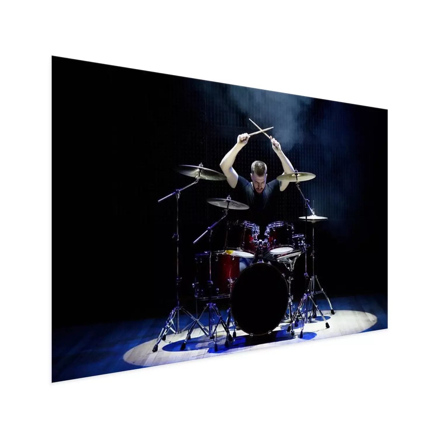 Poster: Drummer playing the drums with smoke and powder in the background