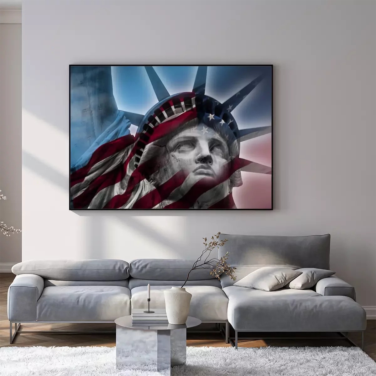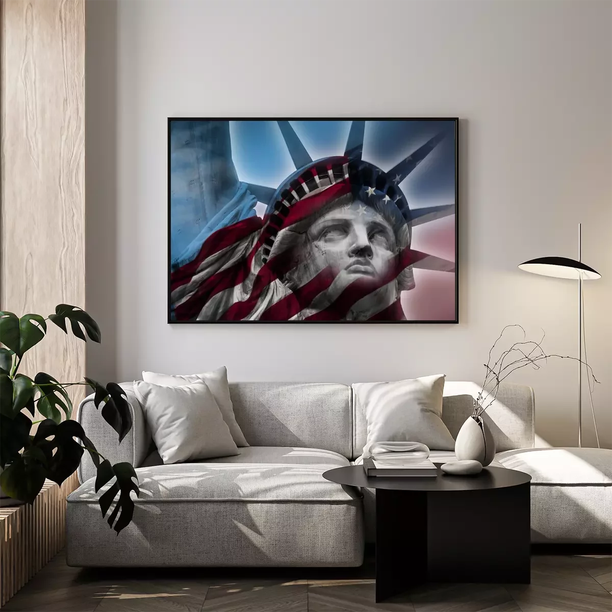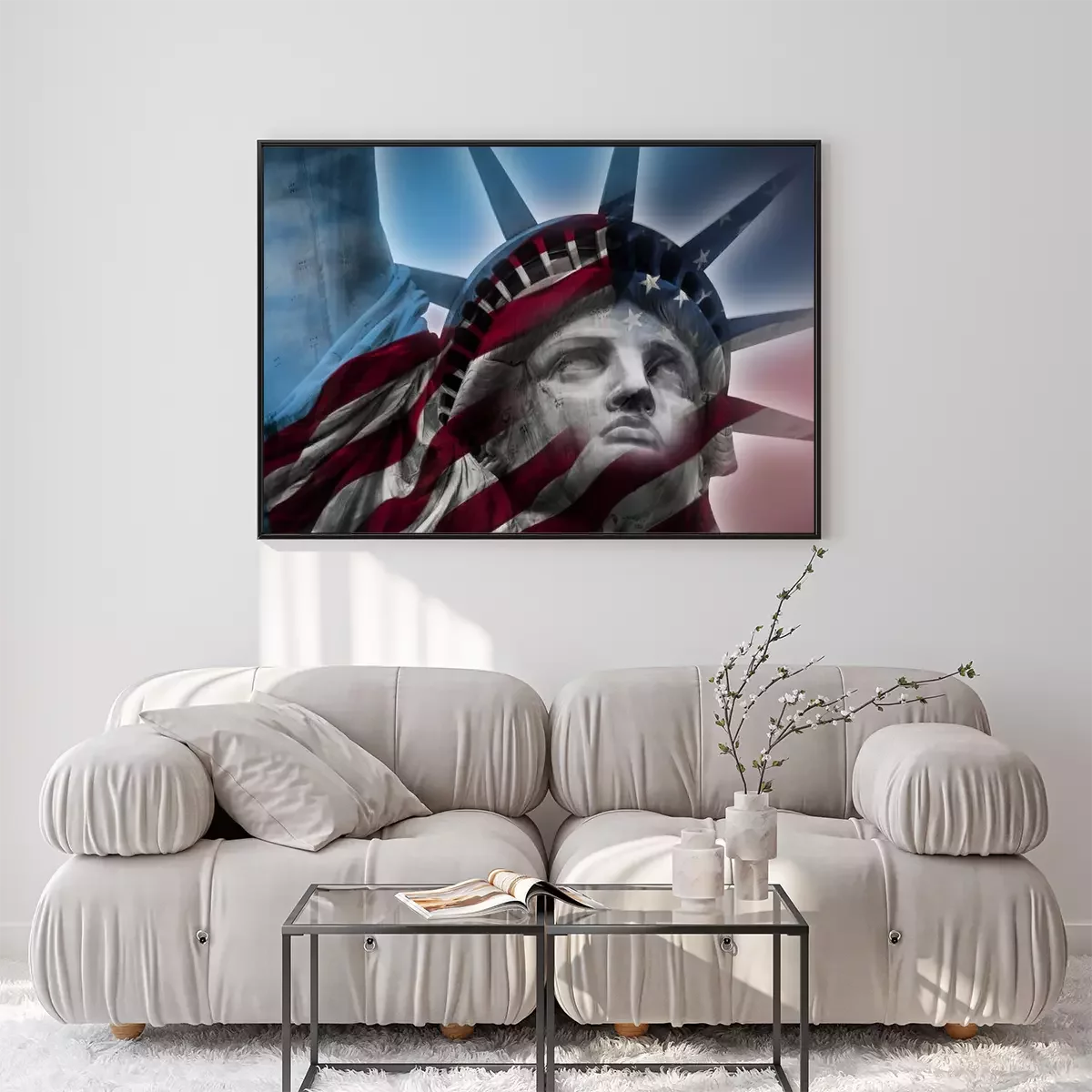 Poster: Dubbel beeld blootstelling van het Vrijheidsbeeld en de Amerikaanse vlag