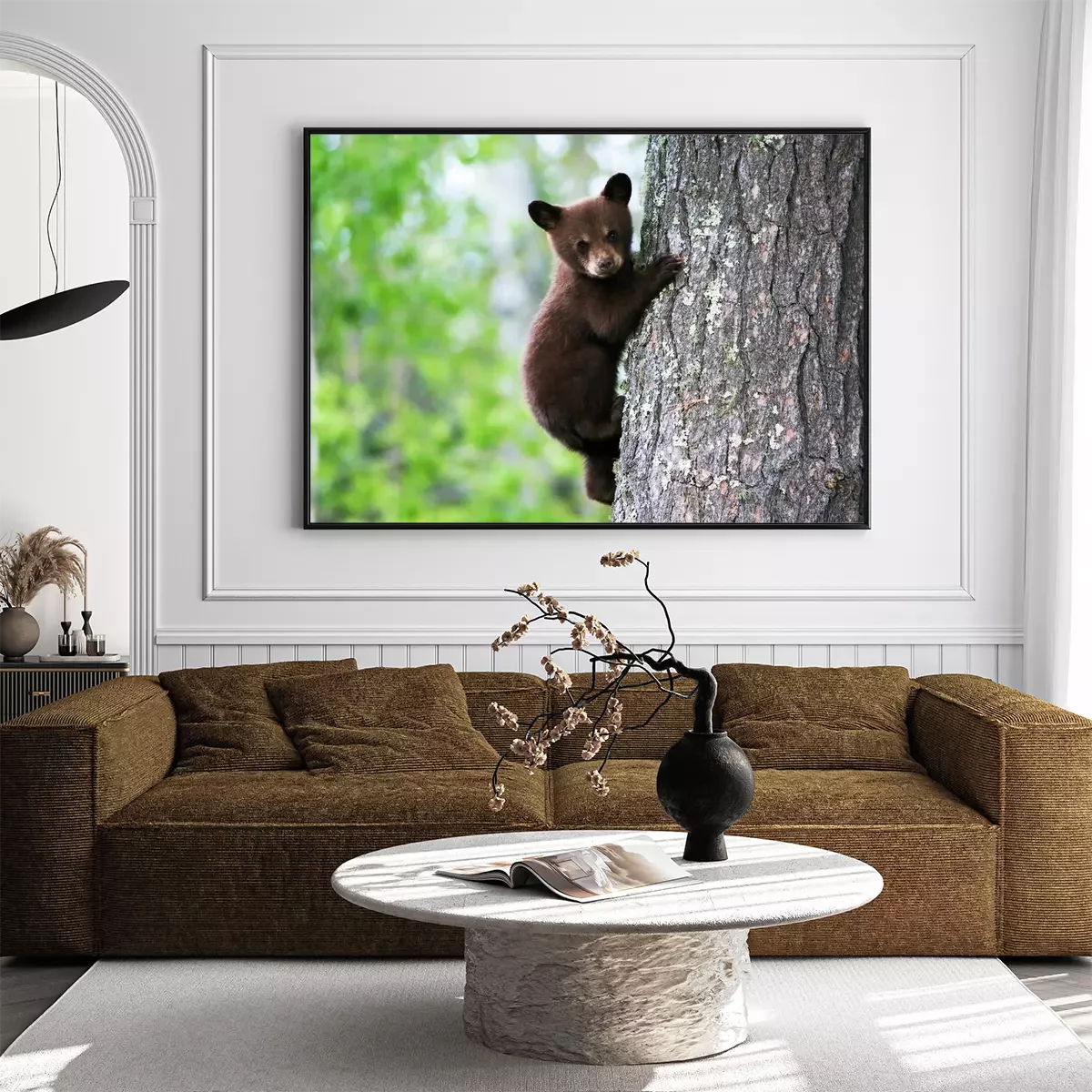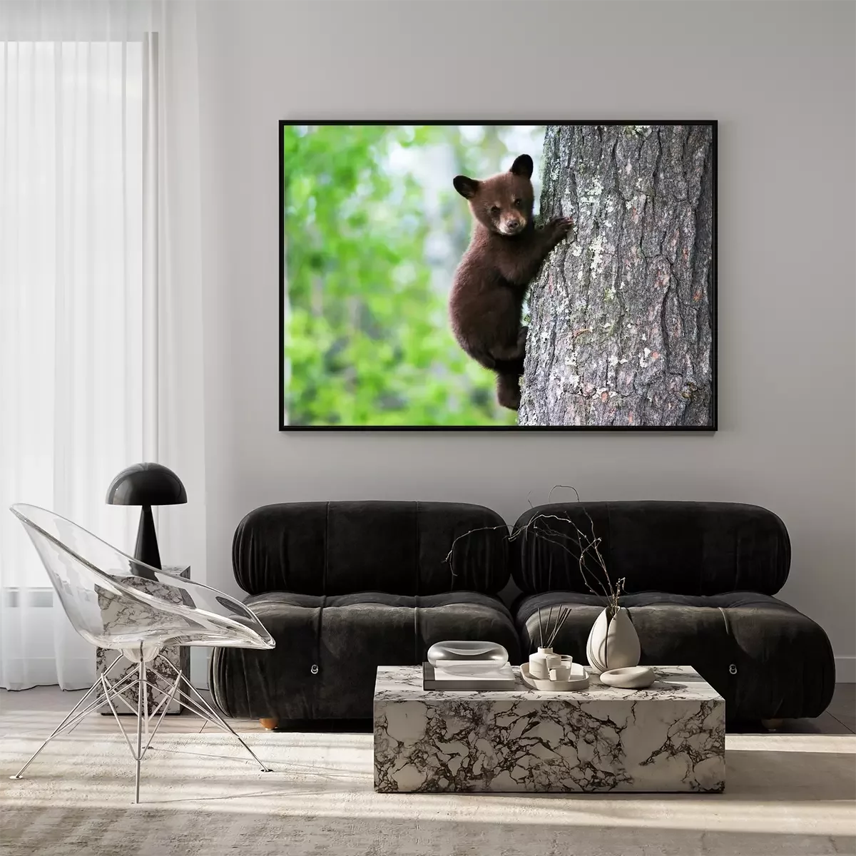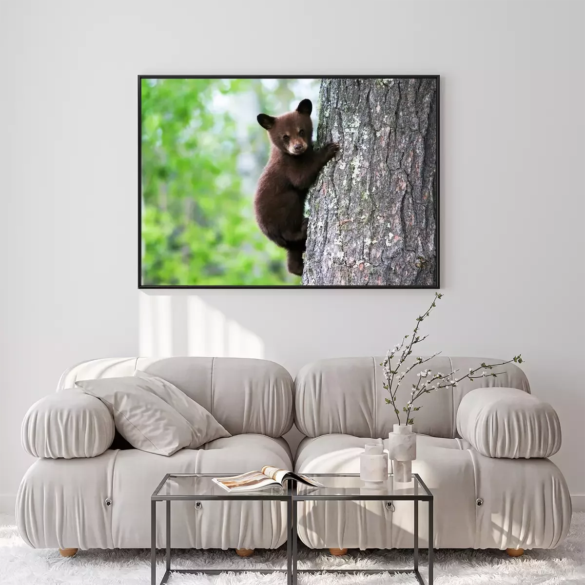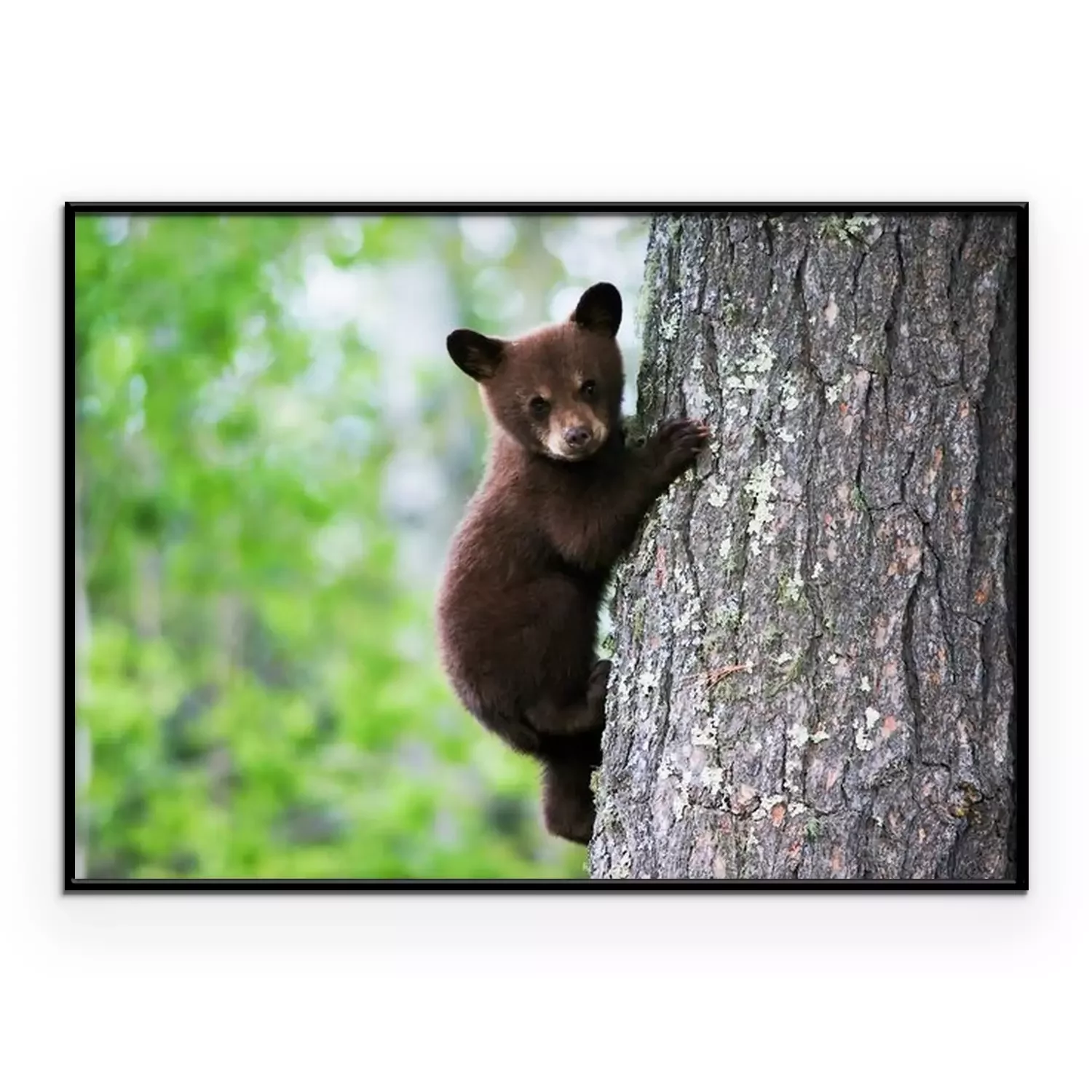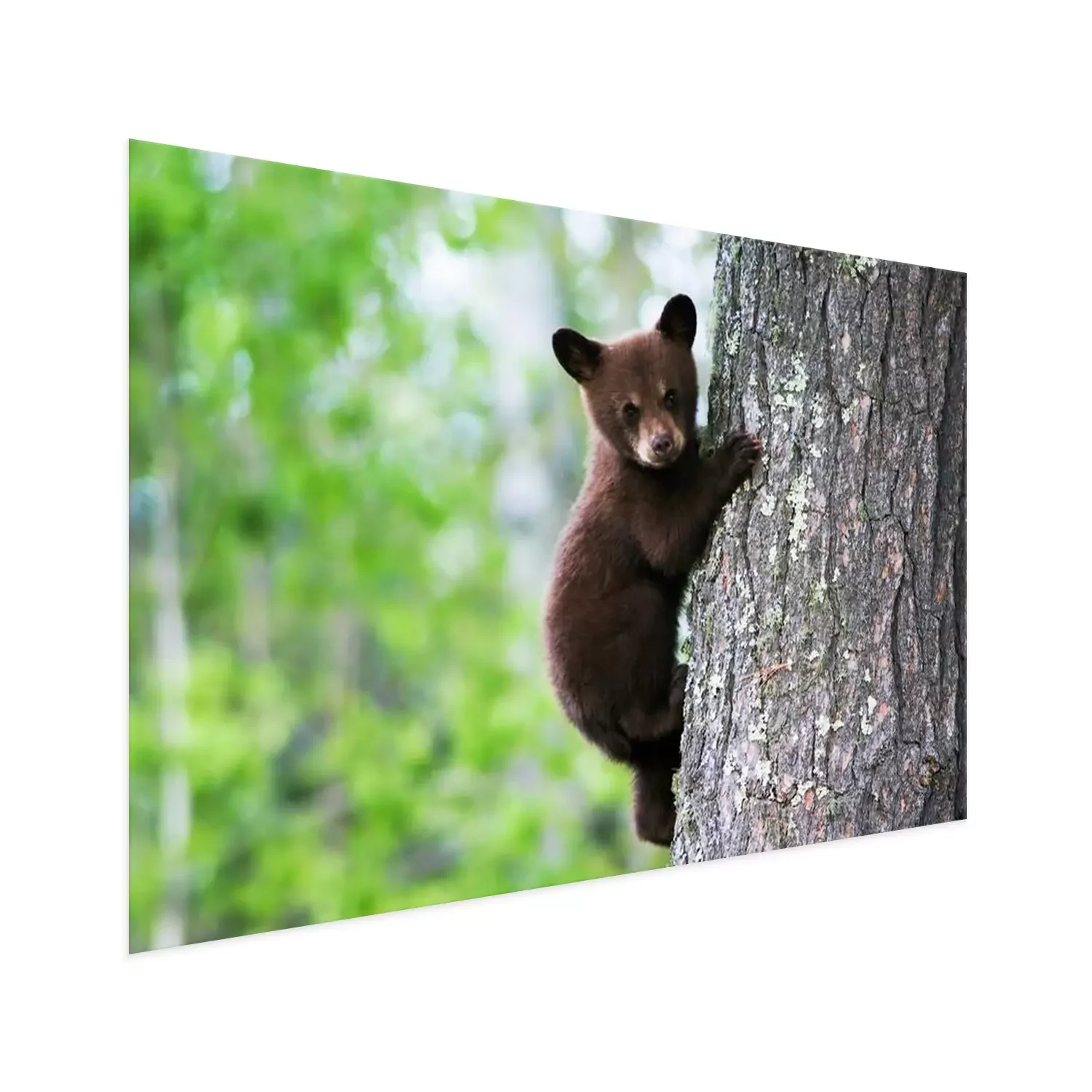 Poster: Een Amerikaanse zwarte beer klampt zich vast aan de kant van de boom